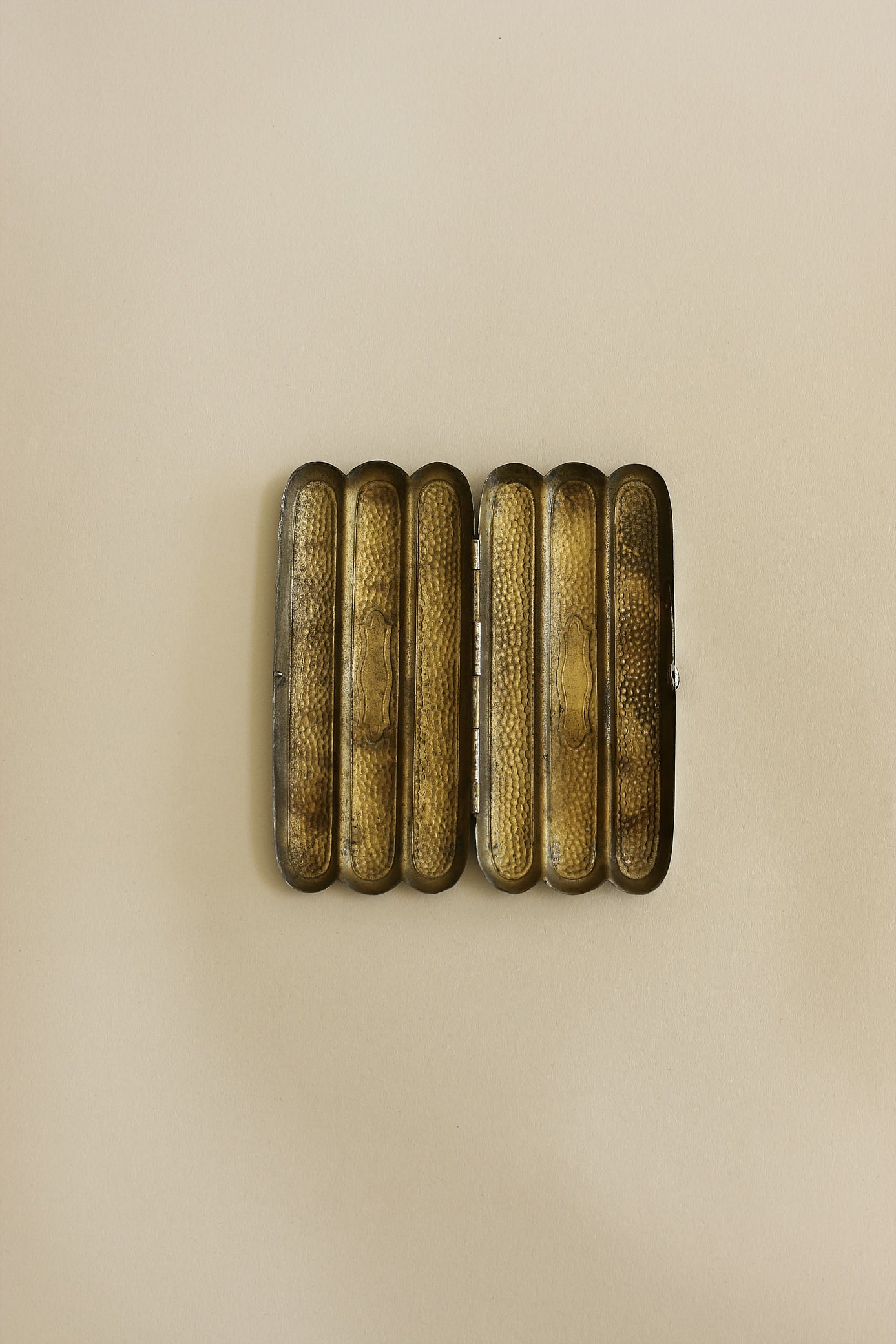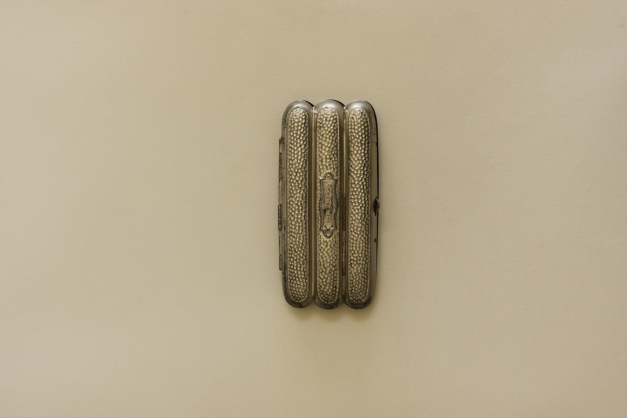 A vintage metal cigar holder crafted with understated elegance and timeless appeal. Its sleek form and aged patina offer a subtle nod to classic refinement, perfect as a unique collectible or thoughtful gift.