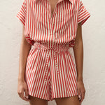 A vacation-inspired playsuit, designed from a signature 100% BCI Certified organic cotton in a yarn-dyed dusty tomato and white stripe. Relaxed in its fit and slightly oversized, the shirt features a classic collar with a V-neckline and front buttons as well as short cap-style sleeves. It is elasticated at the waist with a simple drawstring, before falling into a boyfriend-style short with side seam pockets. With lightweight throw-on throw-off appeal, pack for your next summer vacation. This style is intended to be slightly oversized. We recommend opting for your true size. The elasticated waist offers additional stretch.