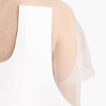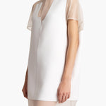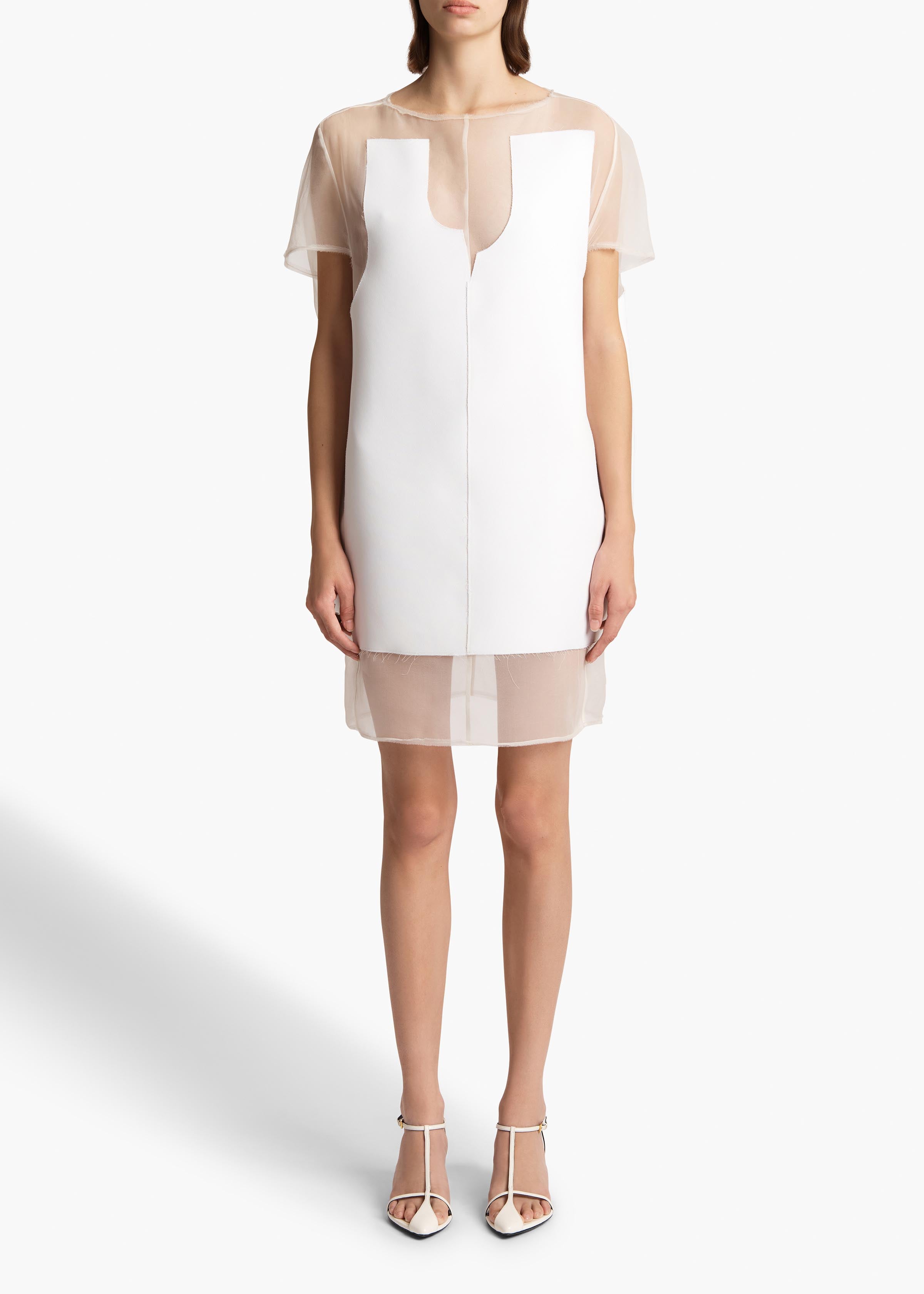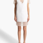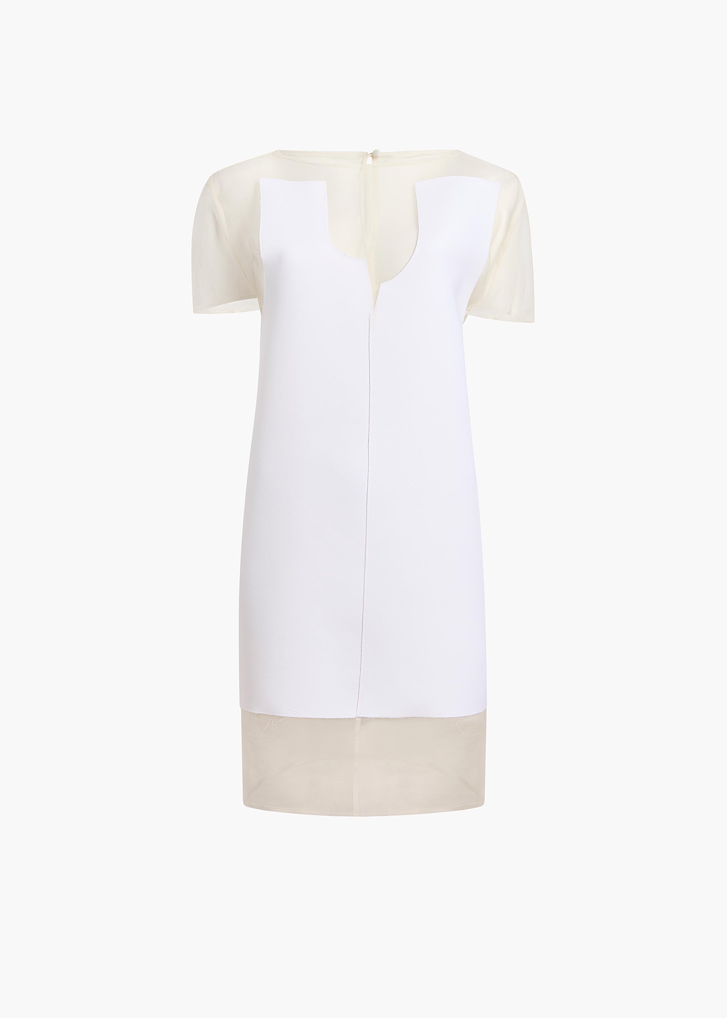 A fluid minidress that pairs a raw-edged panel of double-faced crepe with a sheer foundation. Refined cocoon shape. Covered button at keyhole back.
