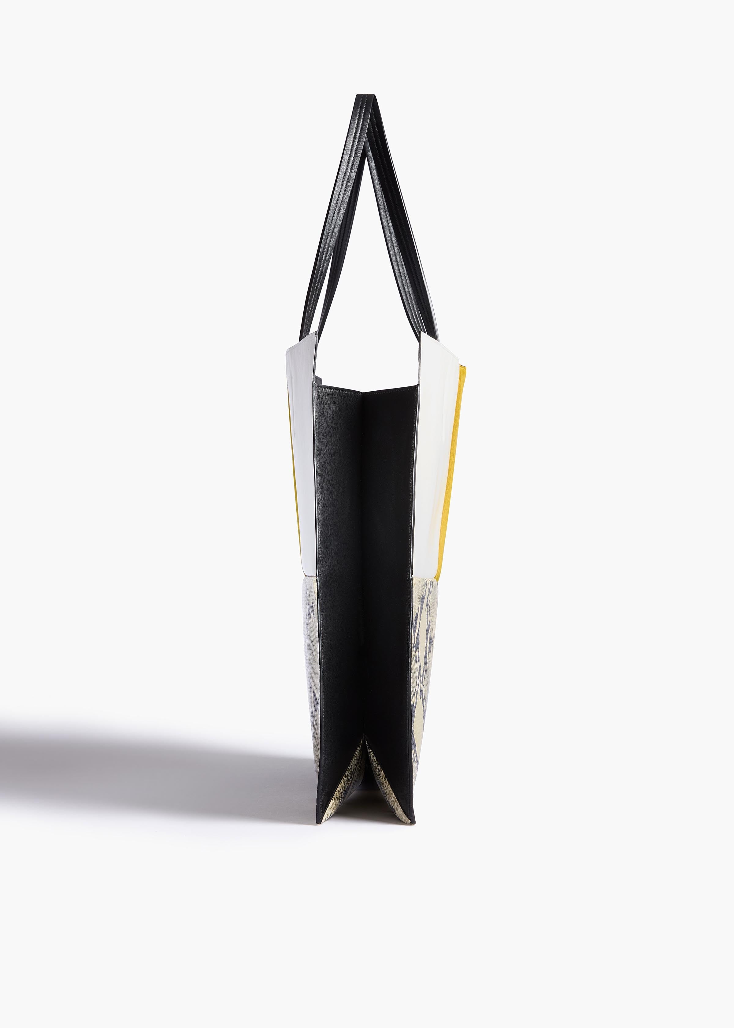 A compact tote of clean lines and pristine structure, with accordion-like folds that expand to accomodate daily essentials. The dual-compartment interior is secured with a concealed magnetic closure. Carry over the shoulder or by hand. Crafted in Italy from a quartet of exquiste materials.