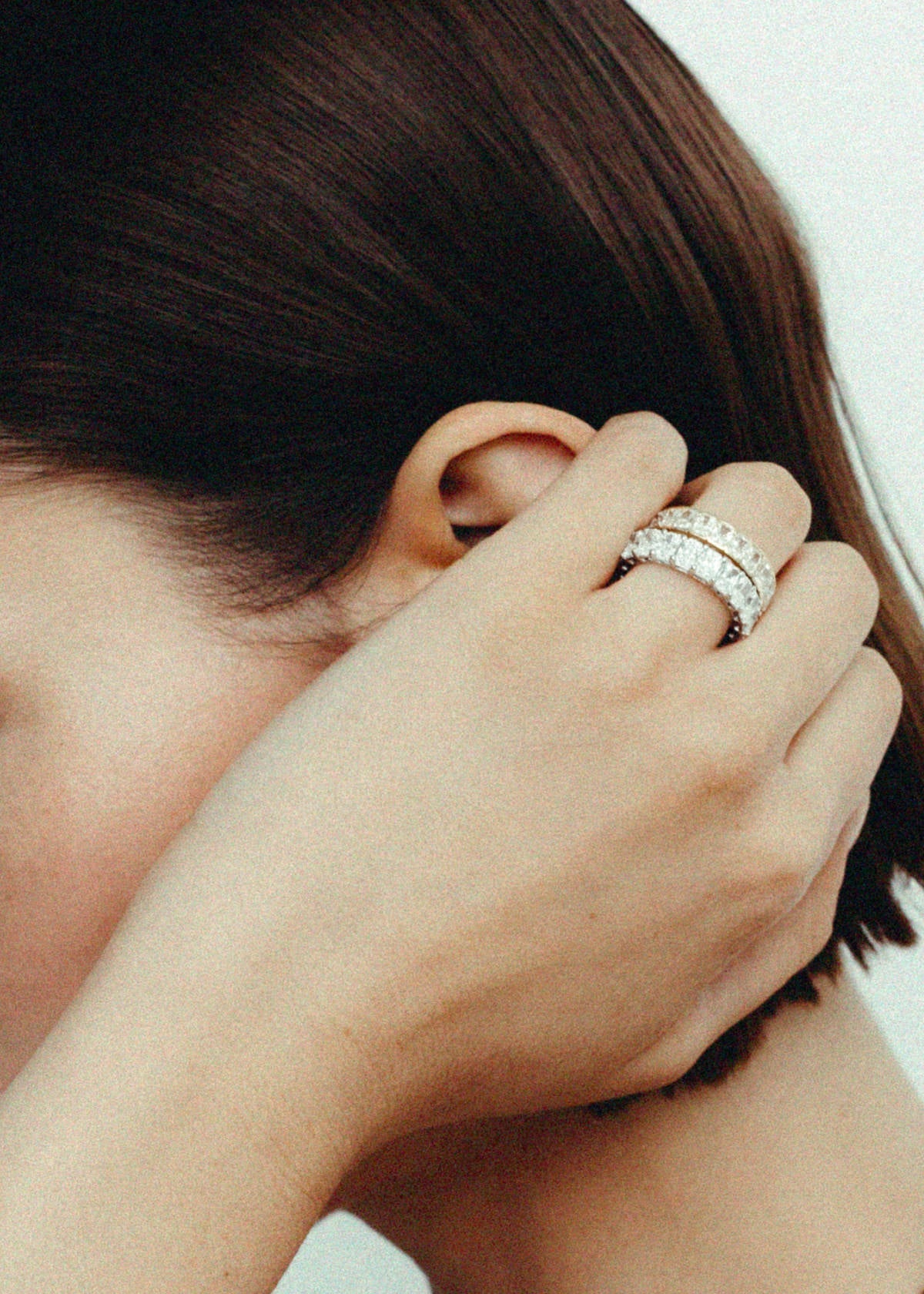 Graceful, luminous, and forever timeless. The Audrey Band features a full circle of radiant-cut diamonds totaling 5 carats, each set north-south in a seamless prong setting that catches light from every angle. Crafted in 14k solid gold, its refined symmetry and brilliance embody effortless sophistication. Available in white gold and with your choice of lab-grown or natural diamonds.