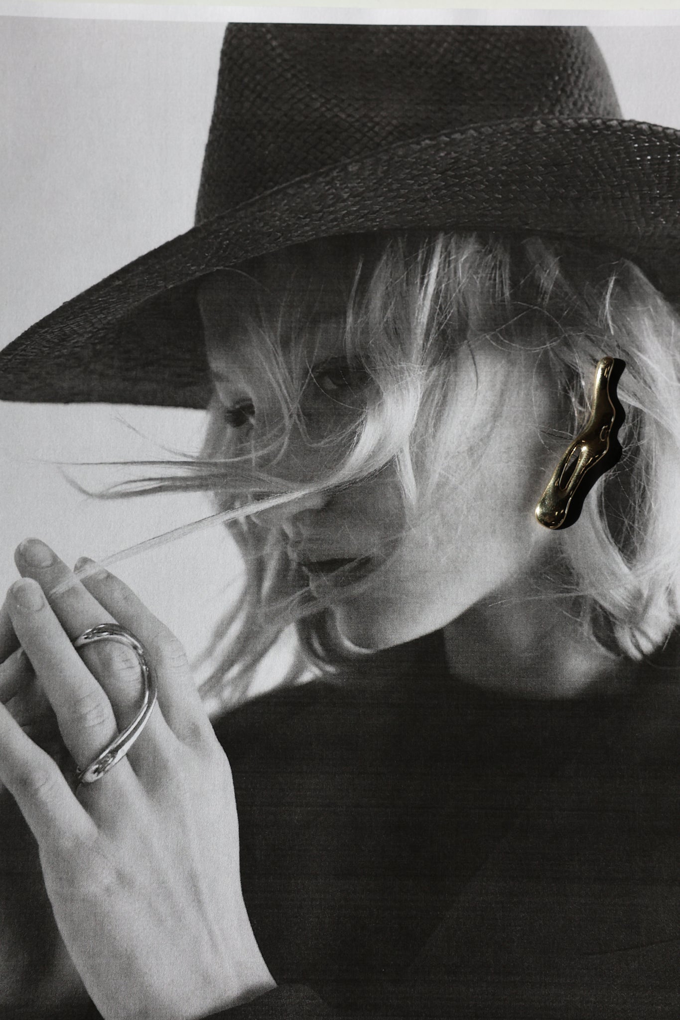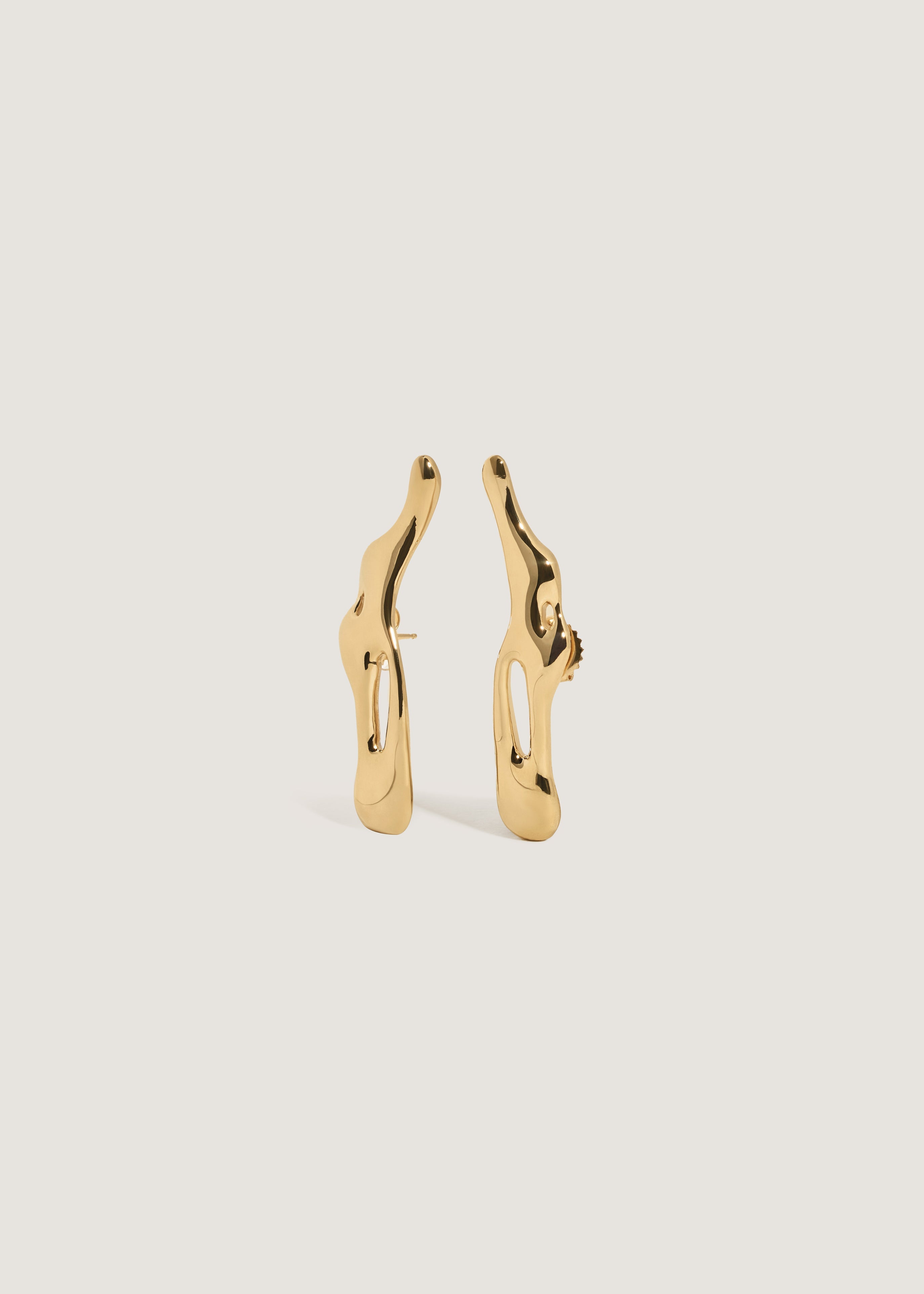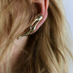 Water in its sculptural form. Our Elara crawler earring features organically shaped 14k gold with a portal opening, giving the effect of polished liquid dripping from the ear.