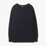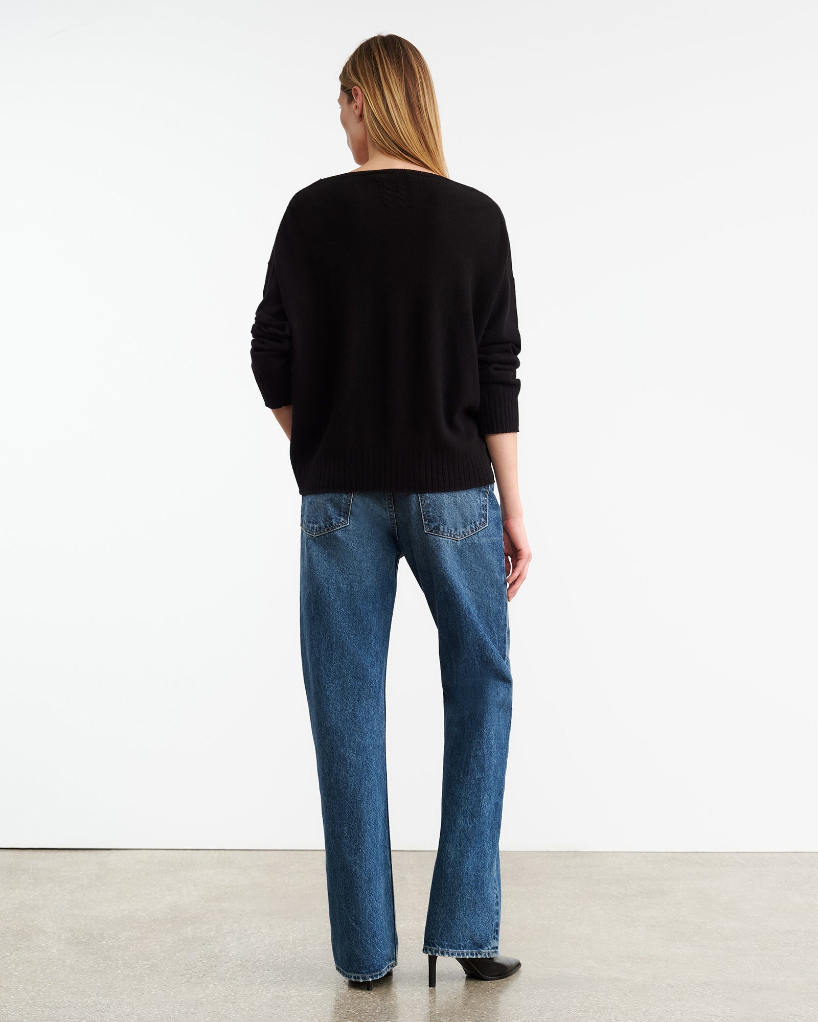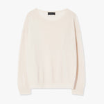 Light weight open crewneck sweater in cashmere. Boxy body. Dropped armhole. Wide rib at hem and sleeve. Single layer rib trim at neck. Fashioning details at armhole and shoulder. Signature center back cable knit detail.