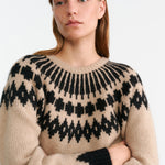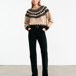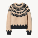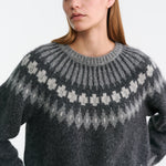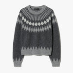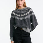 Chunky weight boxy fair isle sweater. Raglan arm hole and sleeve. Rib start at hem and sleeve. Single layer rib at neck.