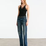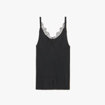 Sweater tank in 2 ply silk. Fine gauge rib stitch. Inserted lace combo at front chest. Slim fit. Straps in full needle rib.