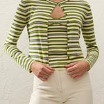 A retro-inspired cardigan, designed from a unique blend of cotton and viscose in a vibrant green stripe. A fitted silhouette, it features a high rounded neckline with one simple button closure at the front for versatility in styling. The sleeves are long and also fitted through the arms. Intended to style with the matching Citara Halter Top and Playa Mini Short with lightweight, effortless appeal, wear between the beach and bar.