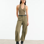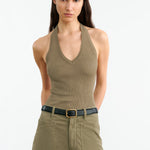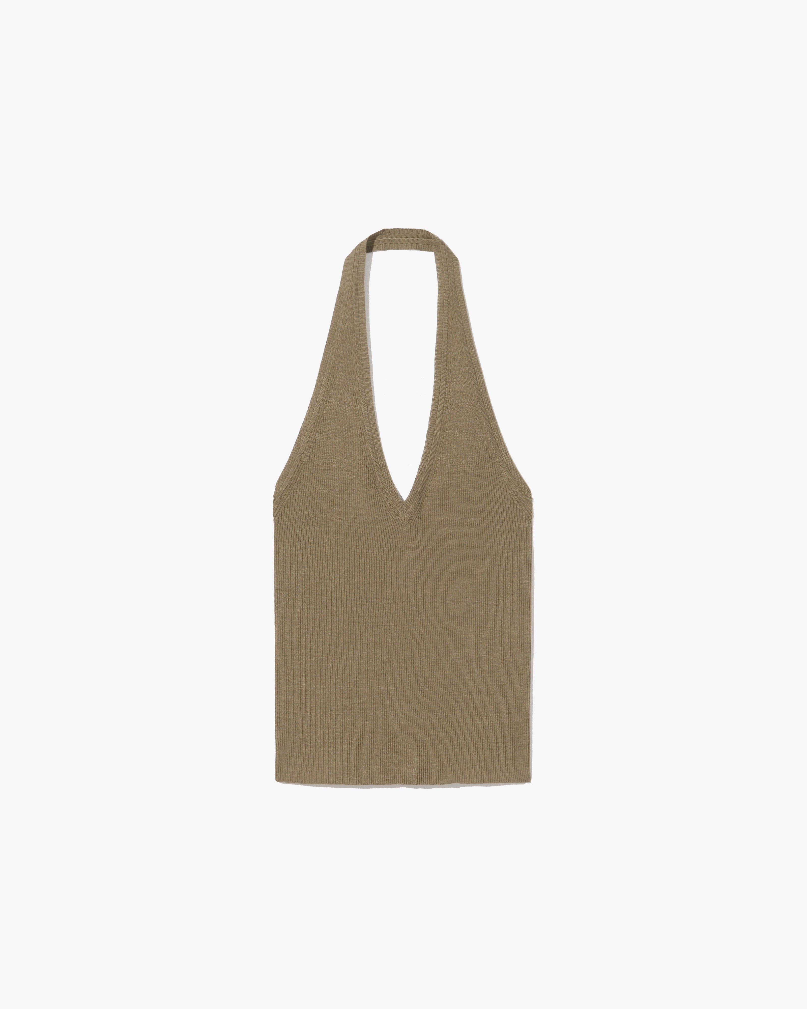 Slim rib knit halter in Italian silk. Open back. Rib trim at neck.
