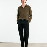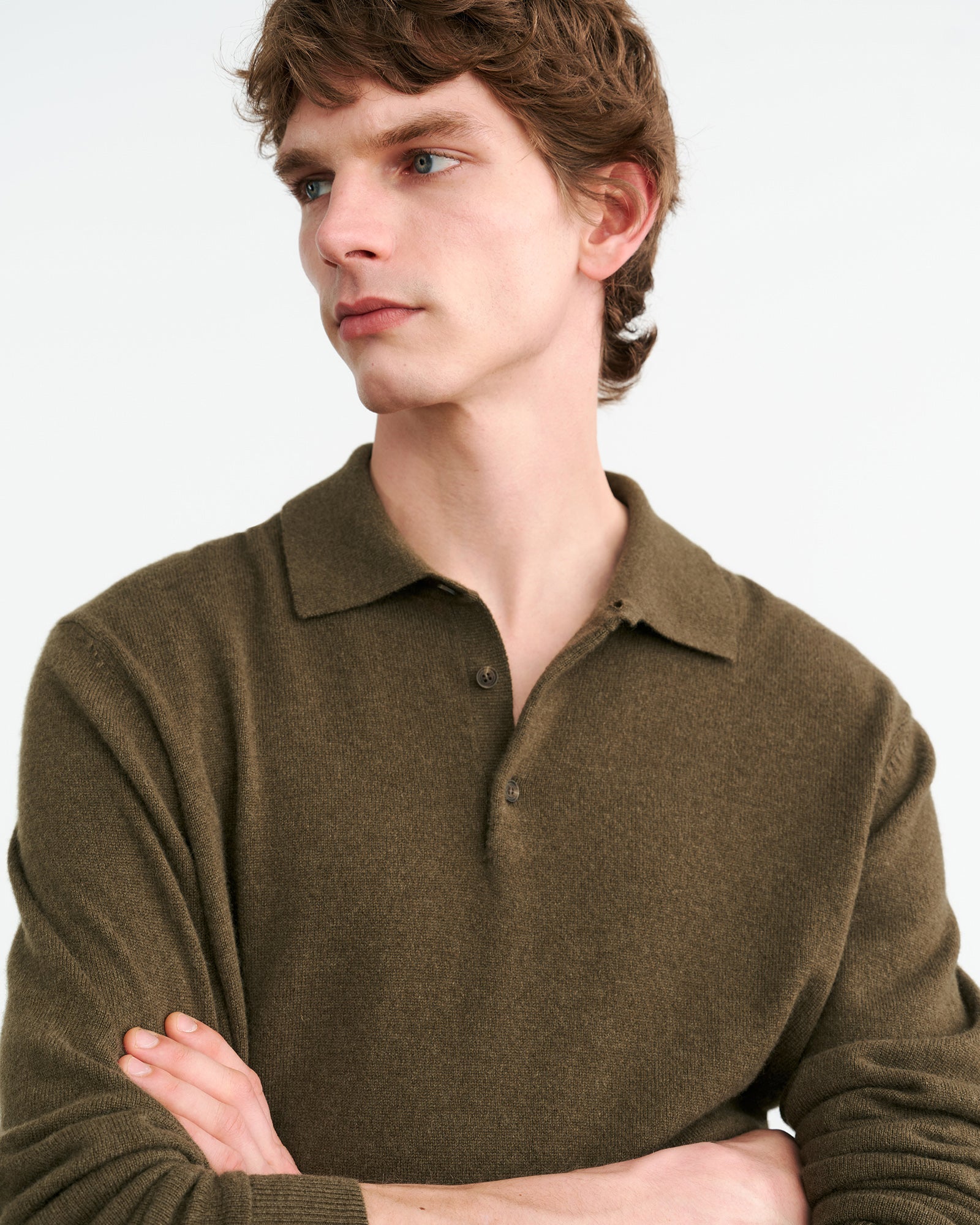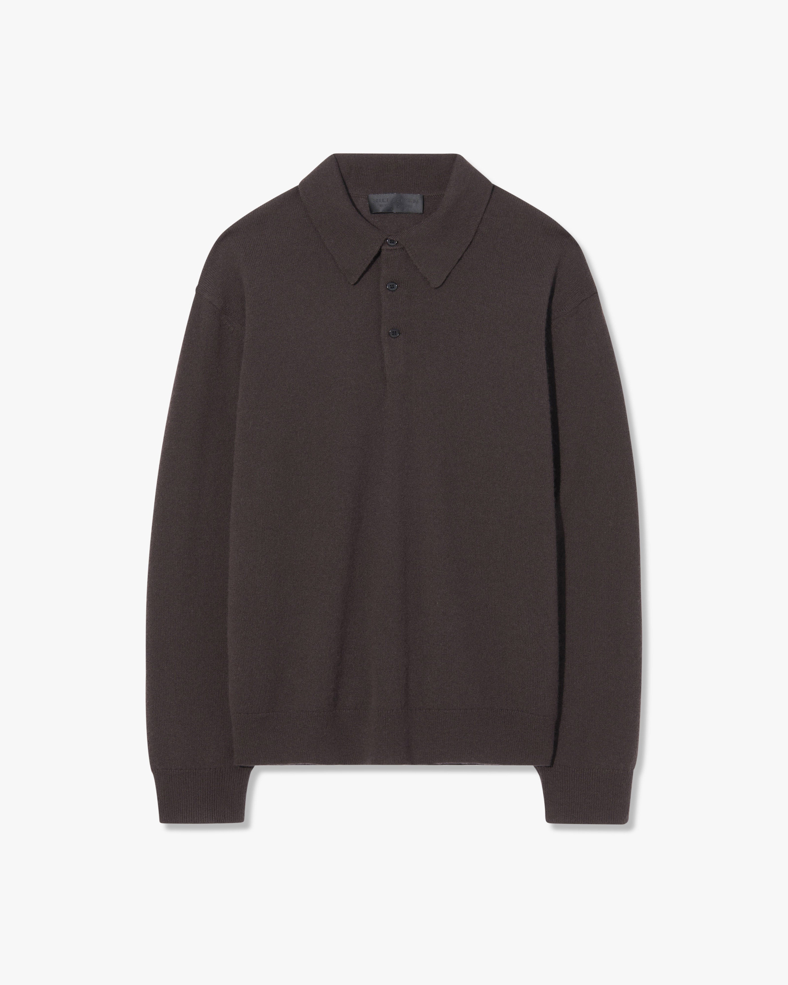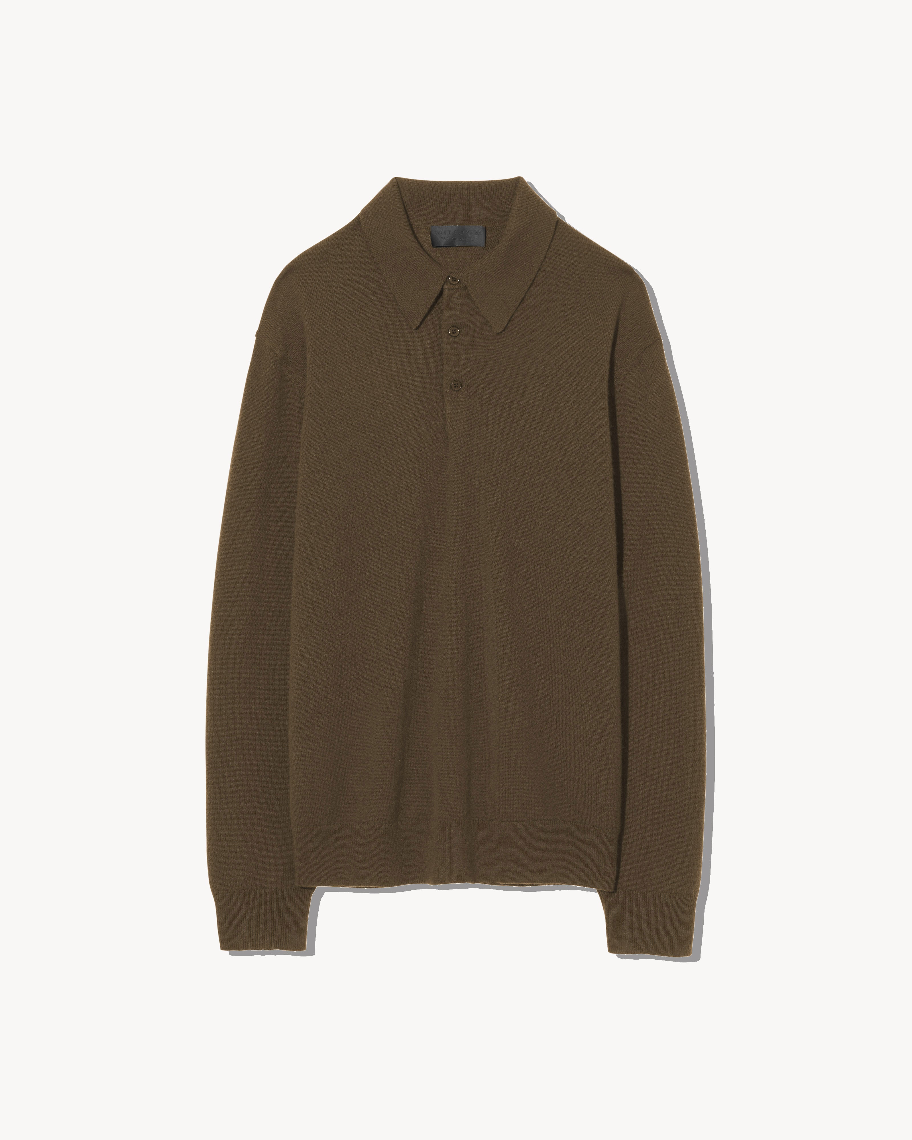 Lightweight relaxed long sleeve polo sweater in cashmere. Three button placket. Slightly dropped shoulder. Fashioning along arm hole, neck and shoulder. Rib trim at hem and cuff. Signature center back cable knit detail.