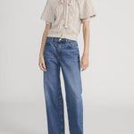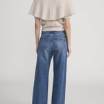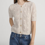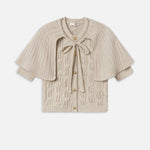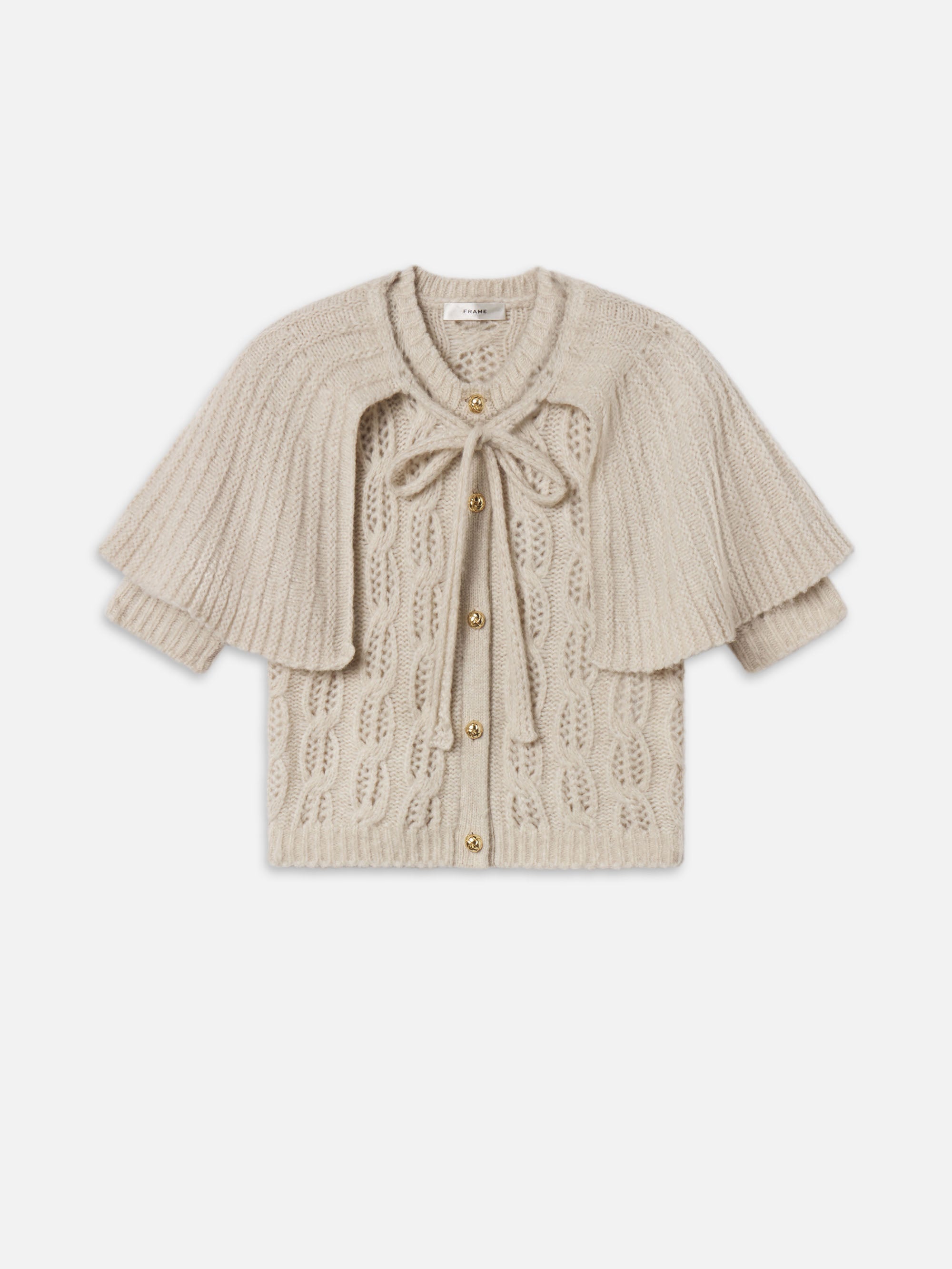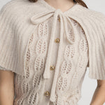 The Cape Cardi is crafted from a luxurious blend of extrafine merino wool and yak, featuring a short-sleeve pointelle knit with gold buttons and a removable cape for a softly structured, feminine silhouette.