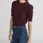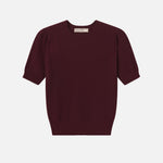 This short-sleeved cashmere sweater is knit in an airy chain-pointelle stitch. The sleeves are finished with feminine, softly scalloped edges. In a fresh seasonal cabernet colorway.