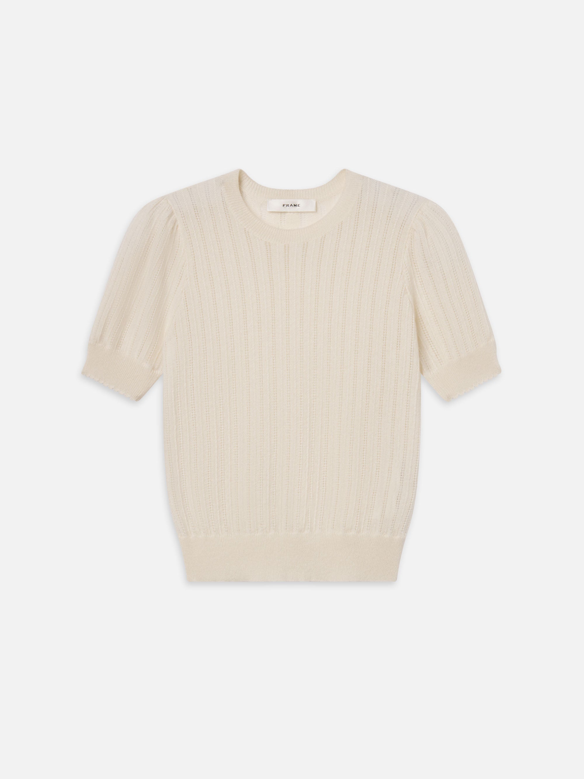 A lightweight cashmere knit with airy ladder pointelle stitching. With softly scalloped edges for an effortless, feminine feel.
