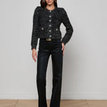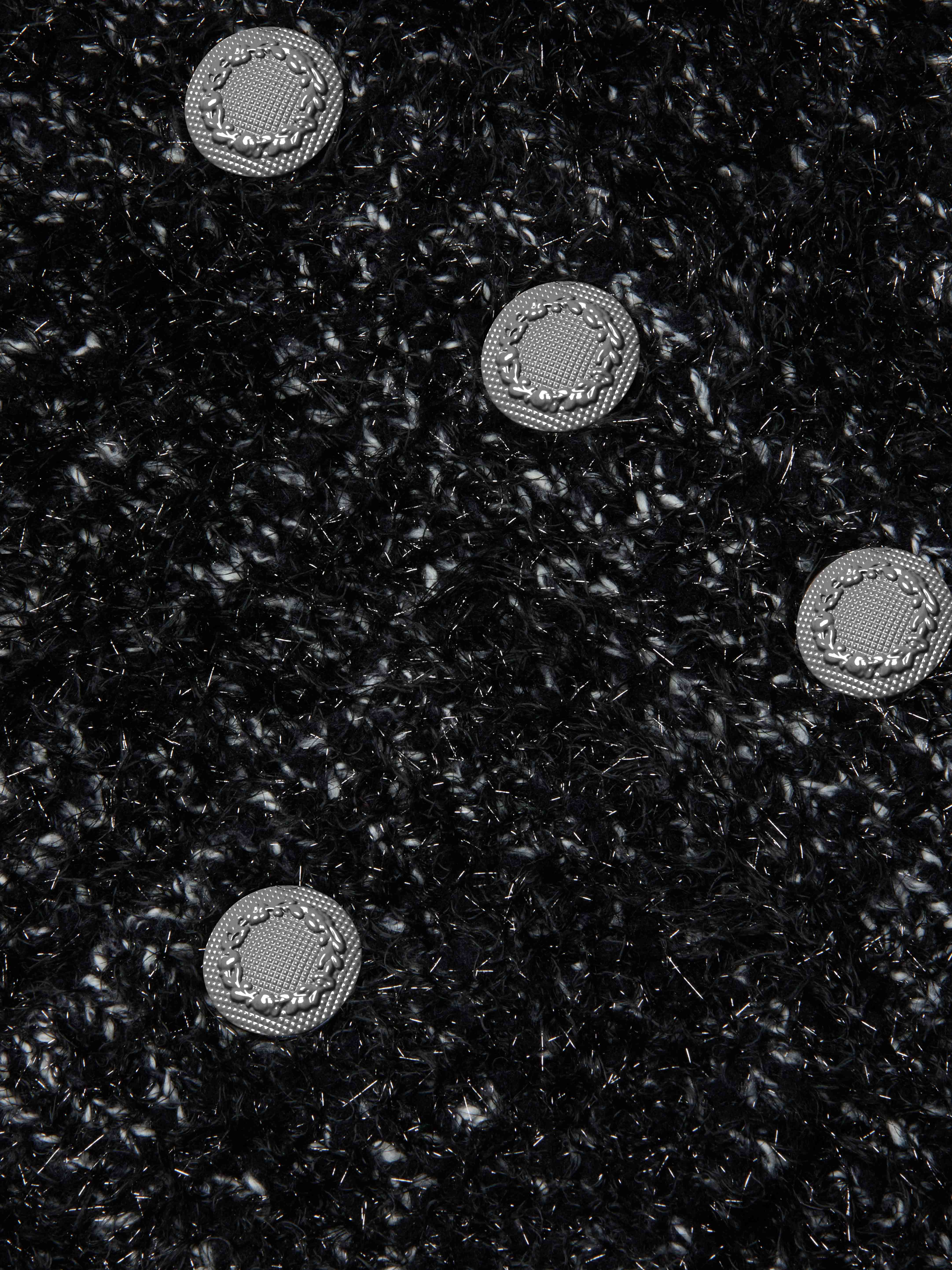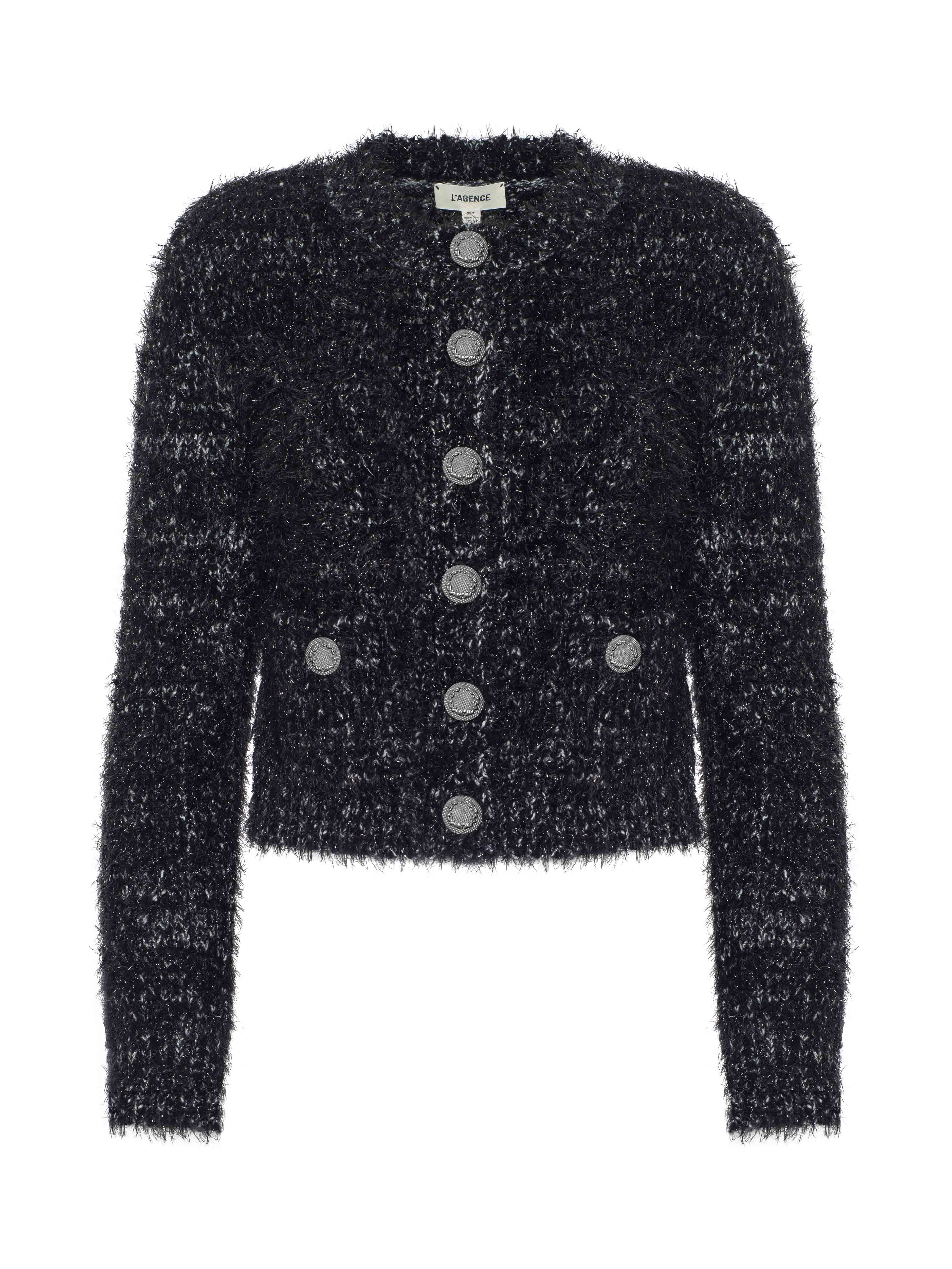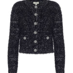 The Una cardigan blends cozy texture with refined edge. Crafted in a plush knit that’s woven with gunmetal lurex, it catches the light with subtle shimmer. The cropped silhouette is finished with embossed silver buttons, lending a statement detail. Perfect over a silk camisole for evening, or layered with denim for daytime sophistication, it’s the knit that balances comfort with glamour.