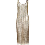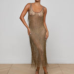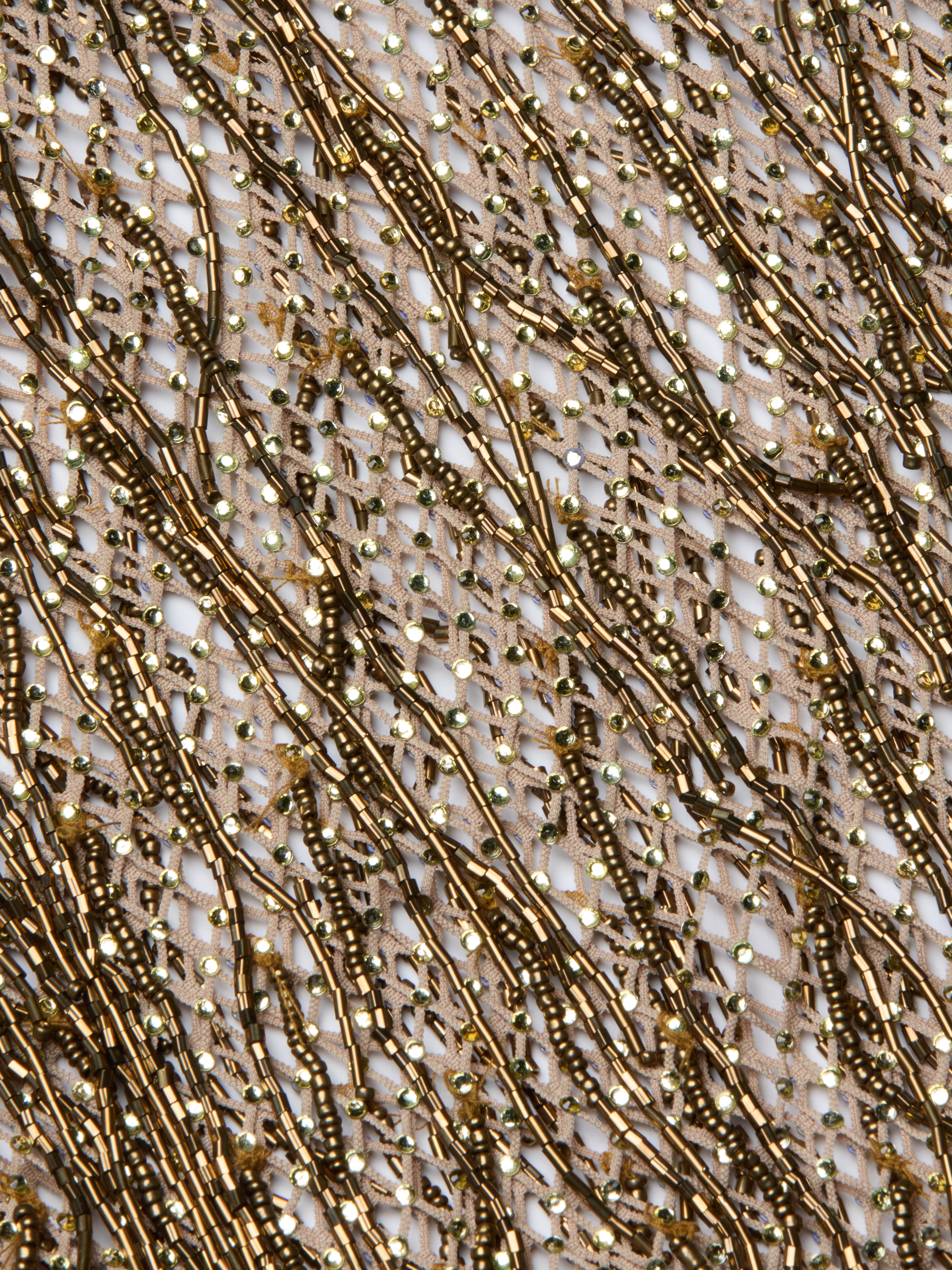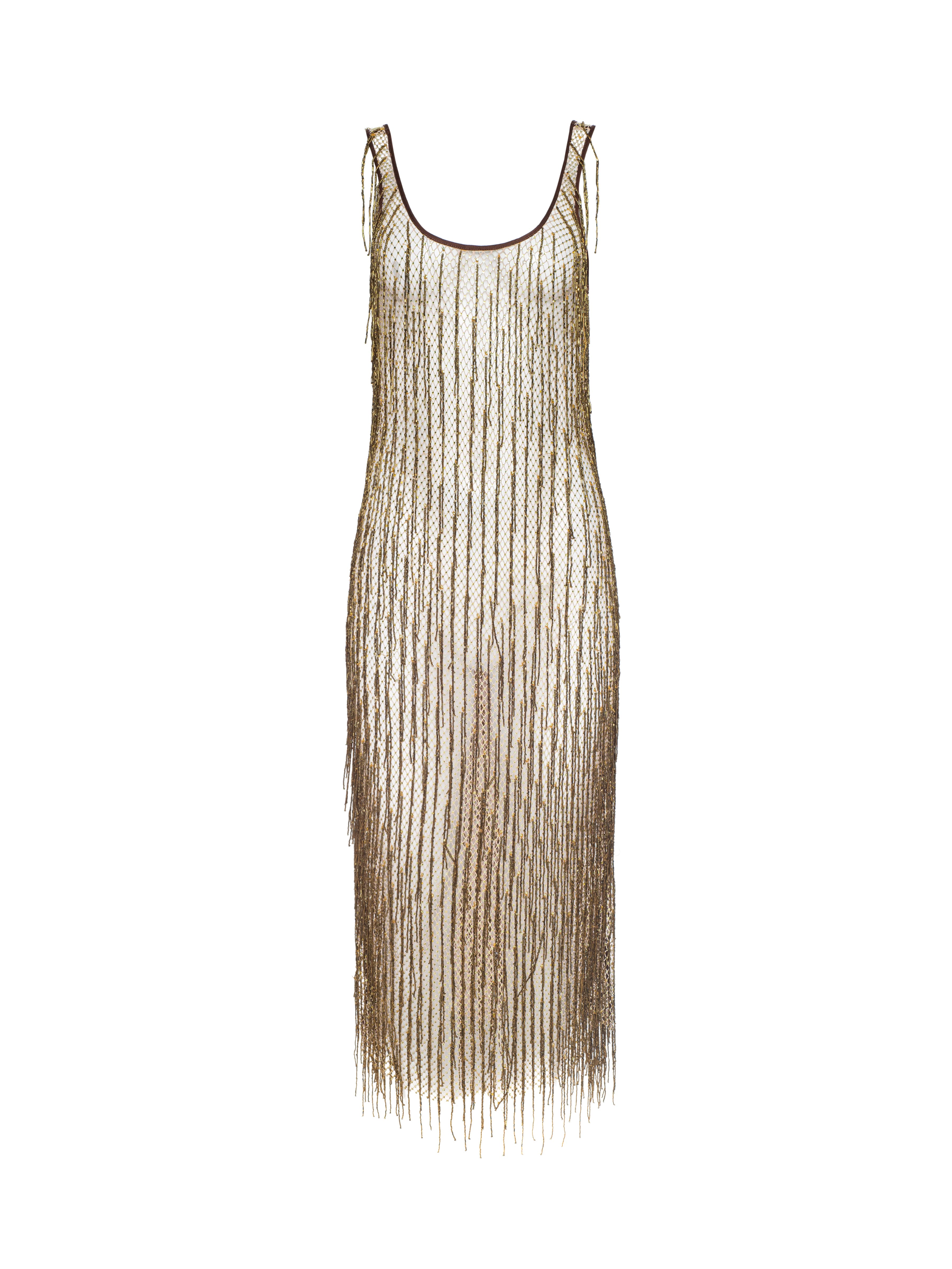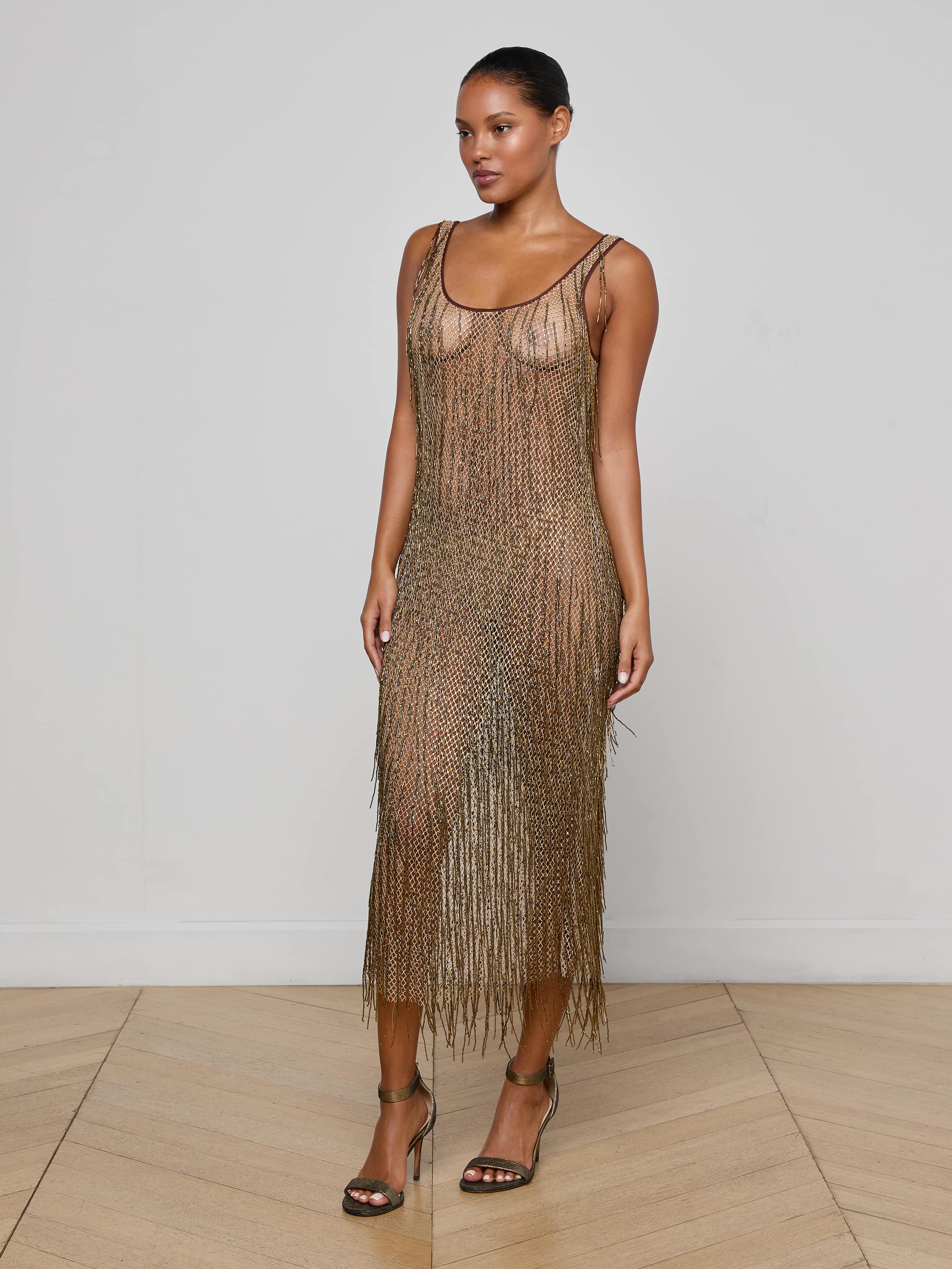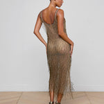 The Gracelynn dress stuns with 1,500 strands of fringe that sways with every step. Each individual strand is meticulously handcrafted with antique gold bugle beads, requiring over a thousand hours of artisanal craftsmanship to complete. Constructed in sheer mesh with a scoop neckline and relaxed silhouette, it delivers breathtaking movement designed to turn heads.
