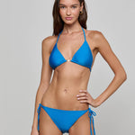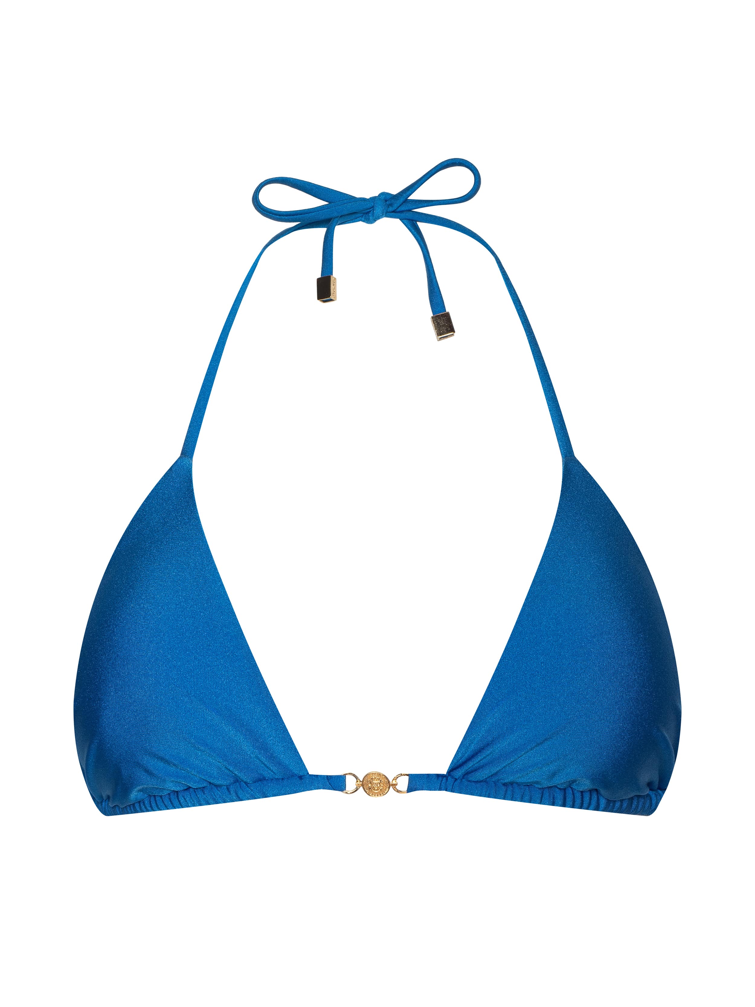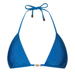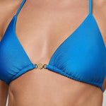 The Kristin is your essential triangle bikini top—flattering, timeless, and made to last season after season. Gold hardware, including a signature logo detail at the front, adds a touch of luxe, while its adjustable ties ensure the perfect, personalized fit. Now updated in capri blue with a subtle shimmer.