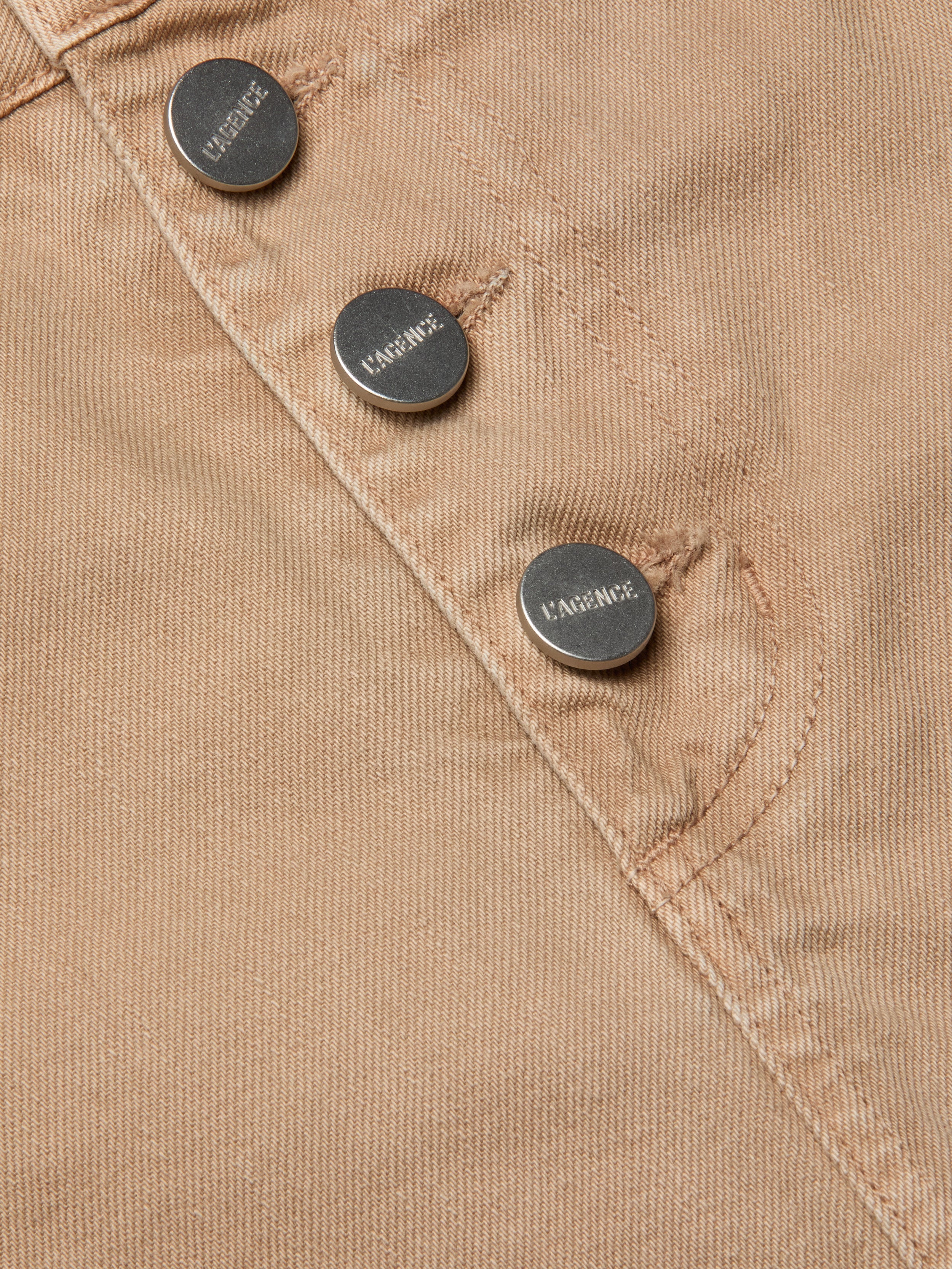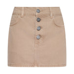 Silver logo buttons put a modern spin on the denim mini skirt. Constructed with a wide waistband, belt loops, and western back yoke detail, the Solene blends clean lines with utility edge. Now back in a neutral tan.