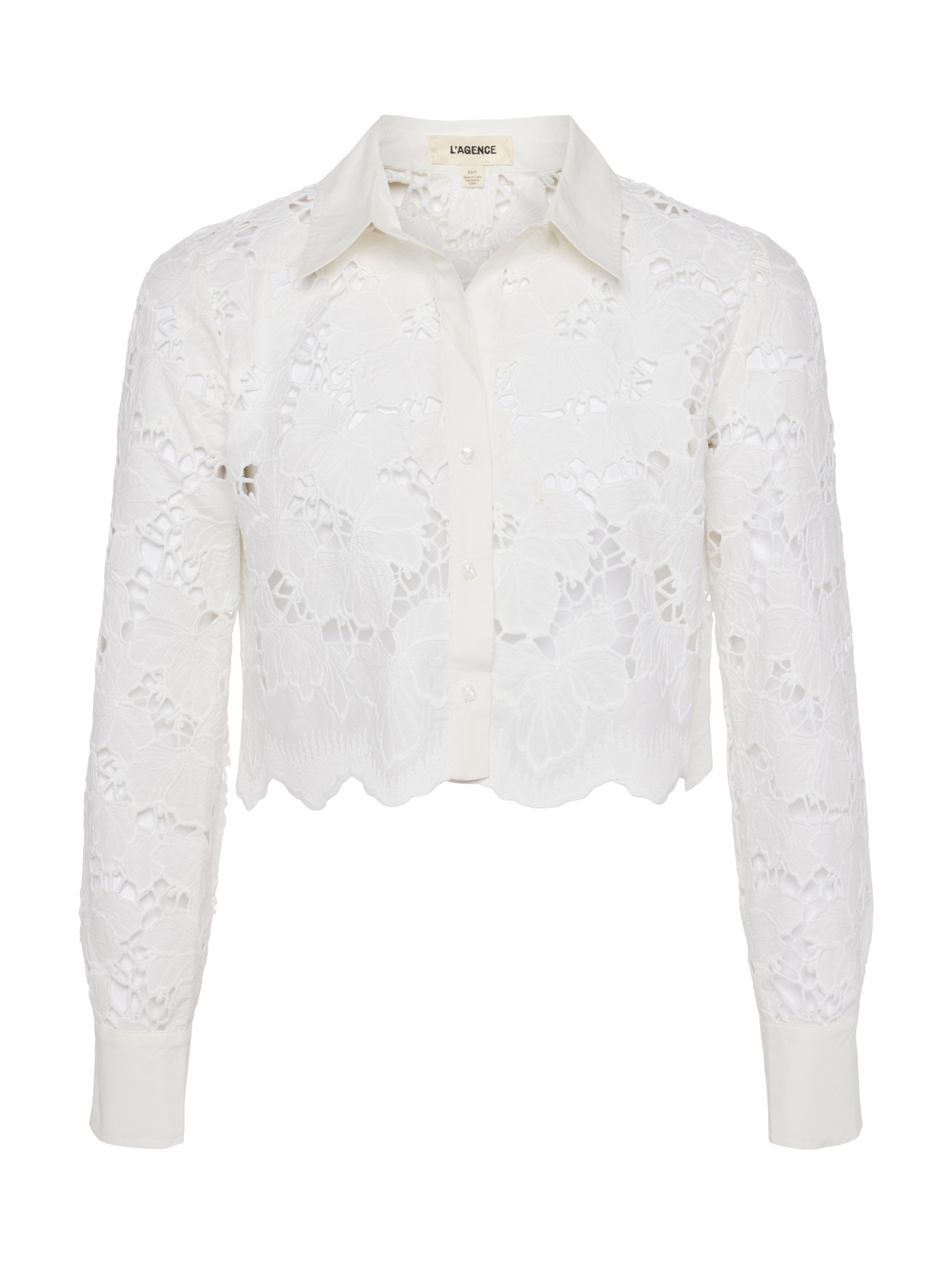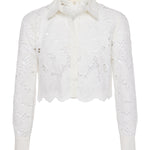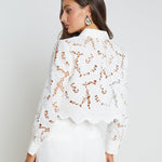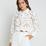 The Seychelle is our fresh, modern take on the lace blouse. A boxy, cropped fit delivers a cool, effortless feel that balances the feminine floral lace. A sharp collar and button-cuff sleeves add a tailored crispness. Throw the Seychelles on over your swimsuit for sophisticated beach style, or pair it with our Livvy pant for a beautiful monochromatic look.