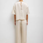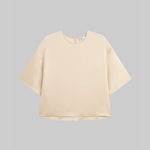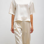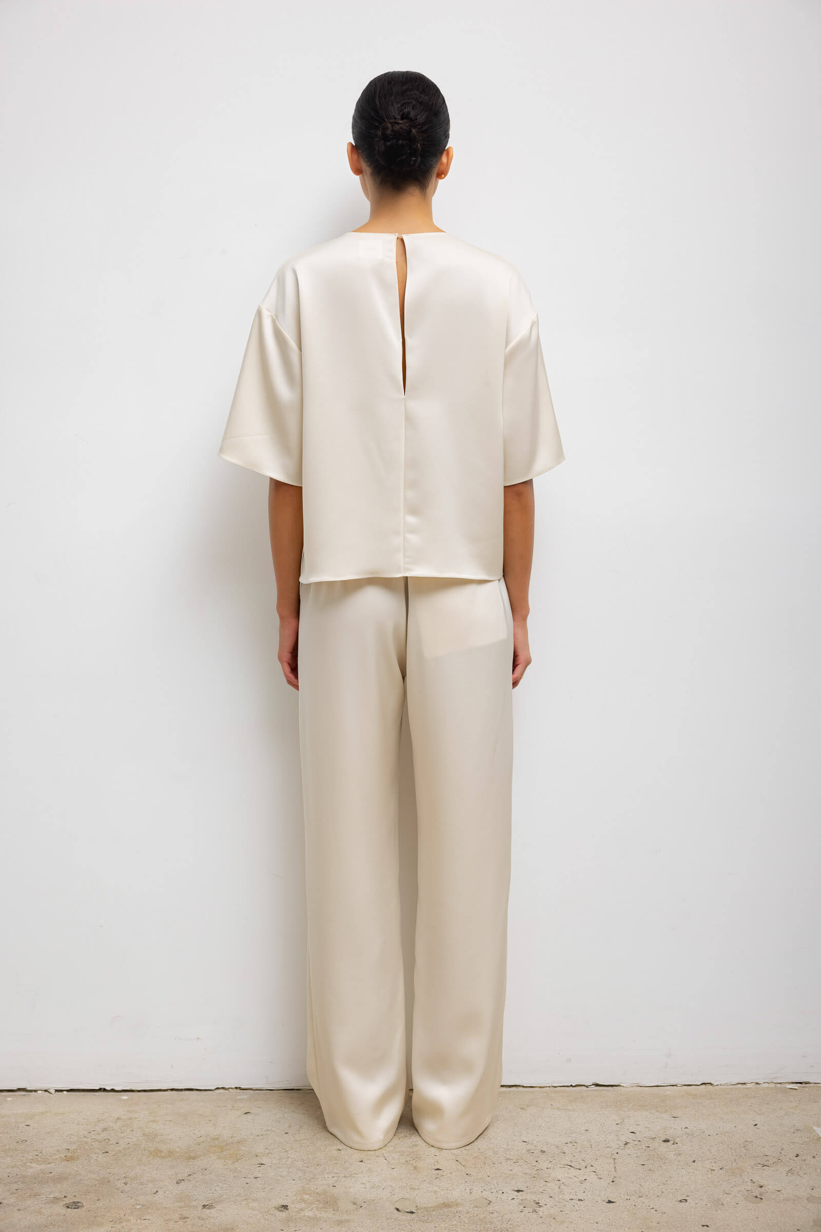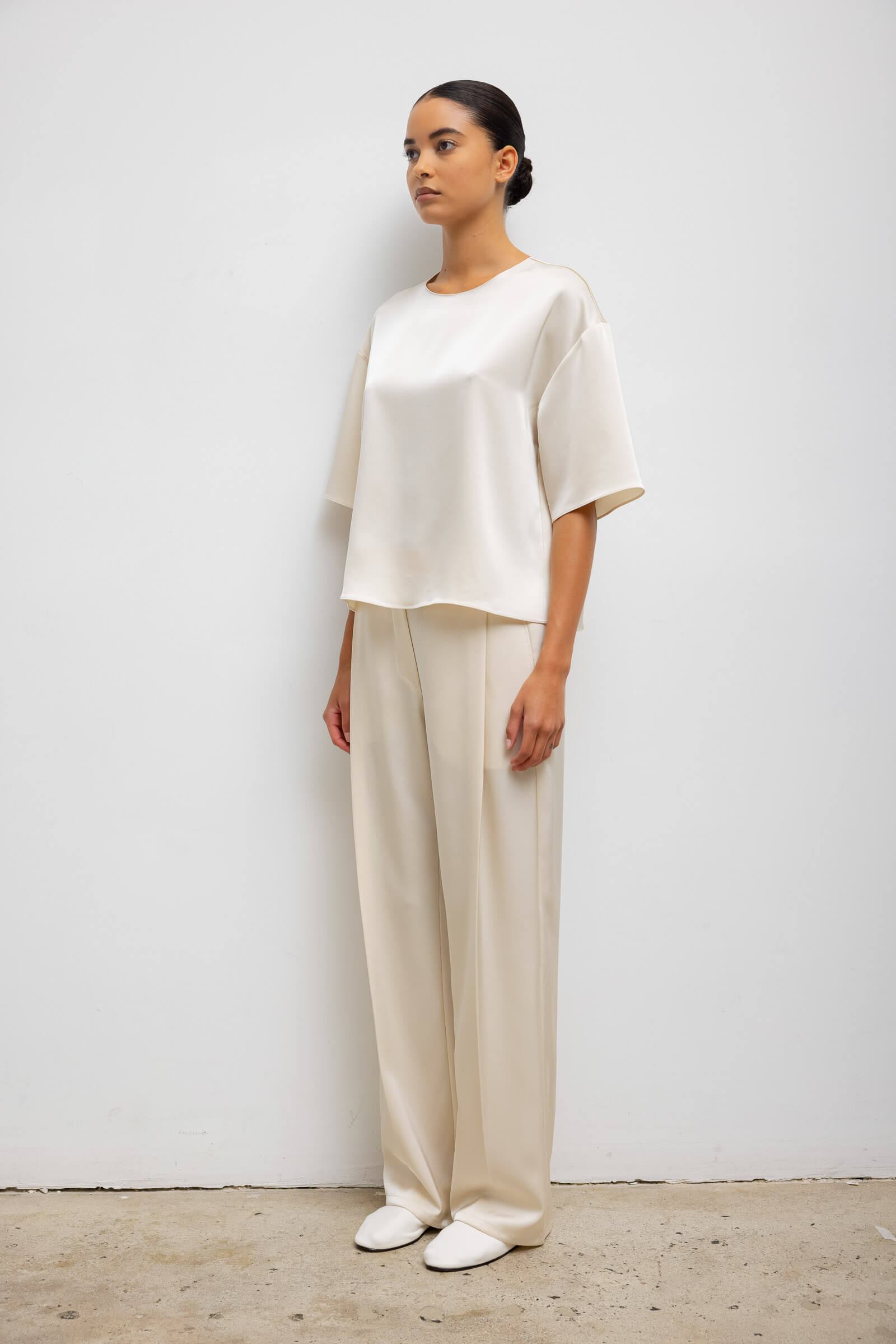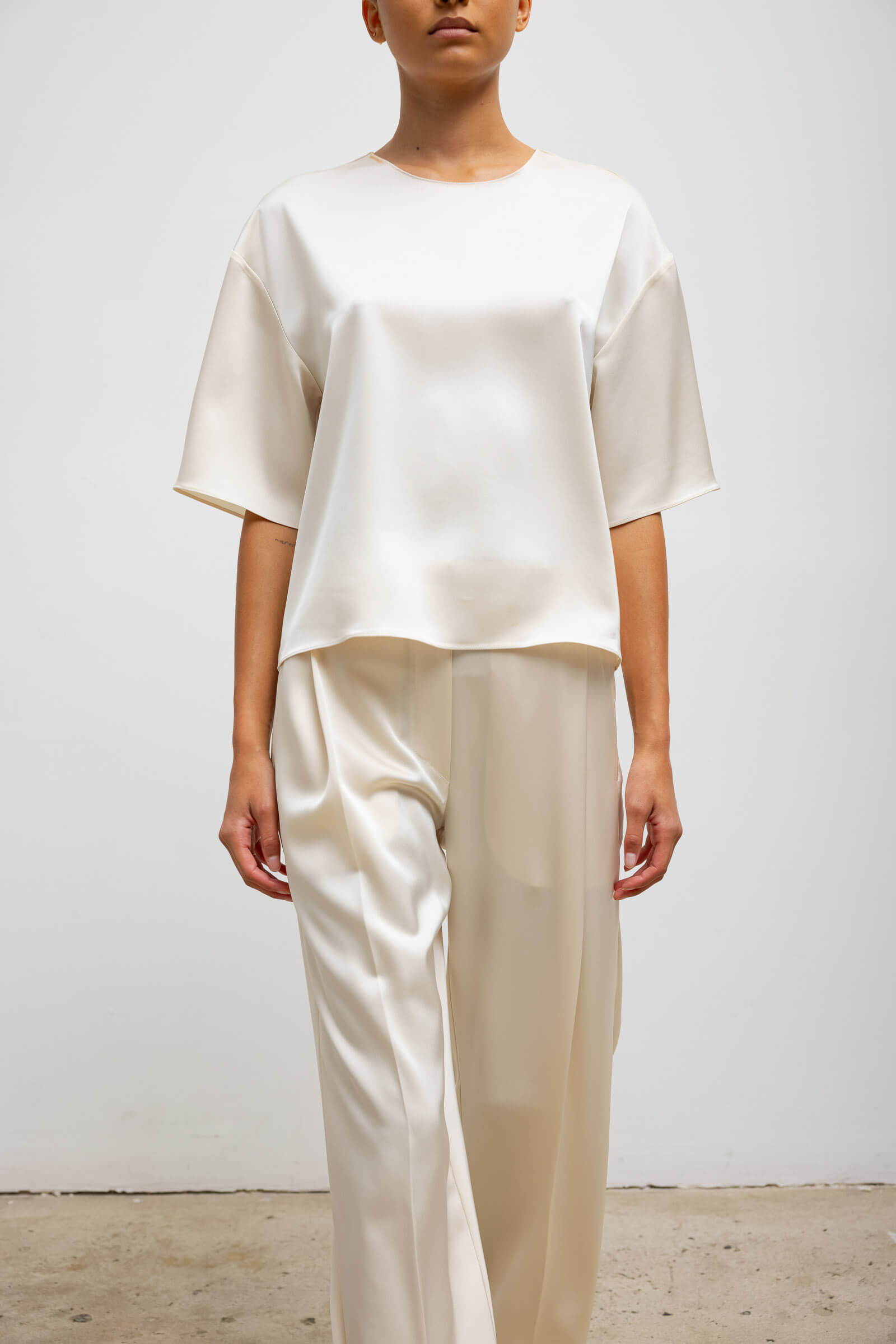Cut in our Japanese-crafted satin, The Barb Boxy Tee is an oversized tee silhouette featuring a crew neckline, elongated short sleeves, and a beautiful draped length.