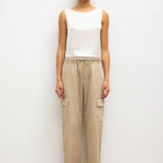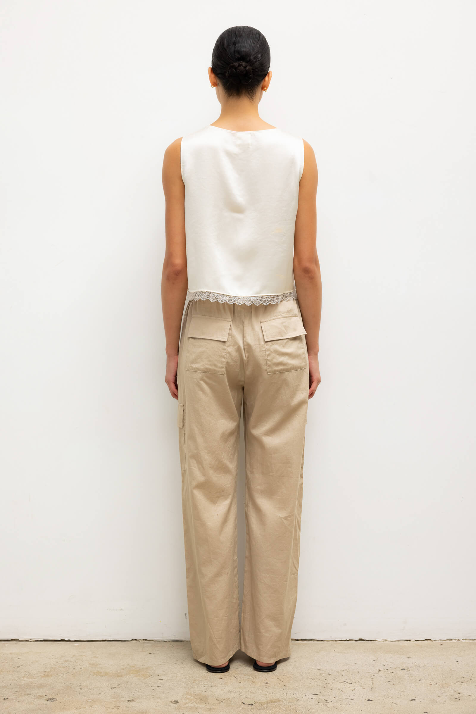 Cut in our Japanese-crafted Barb Lace Satin, the Barb Lace Crop Sleeveless Crew is a classic shell silhouette, featuring a cropped length wide round neckline. Finished with a fine, scalloped lace edge.