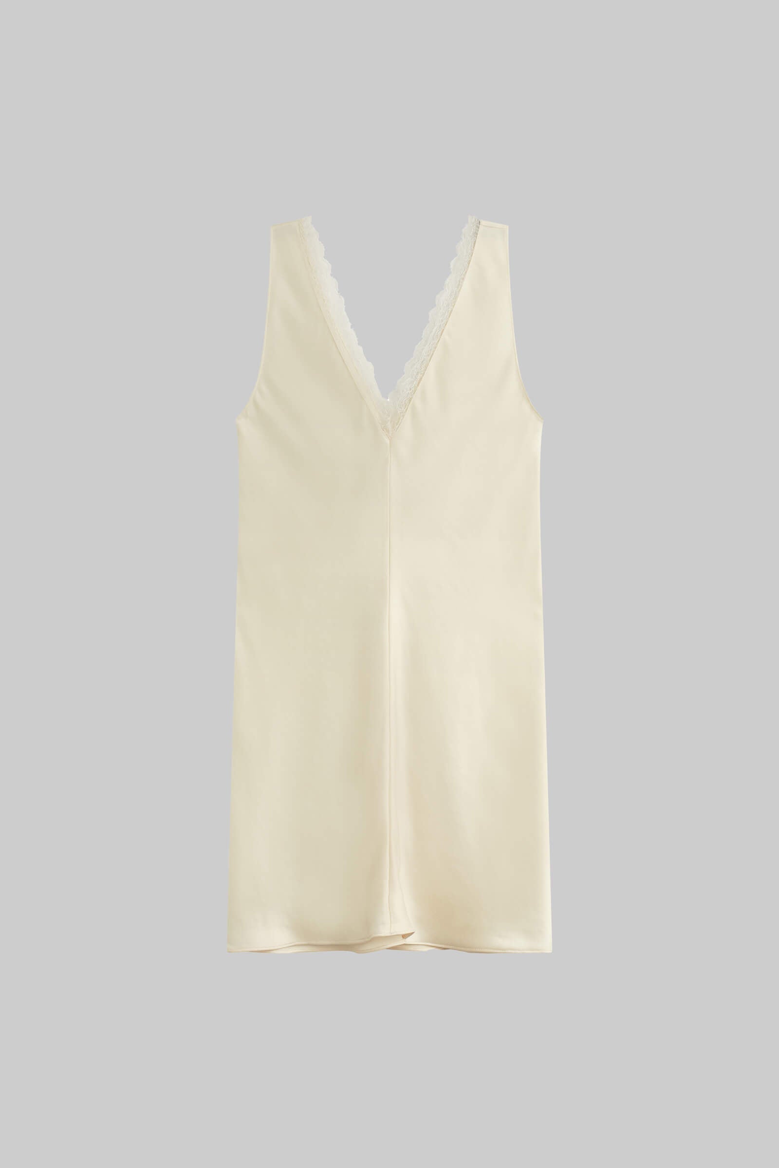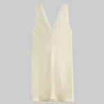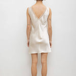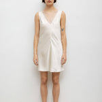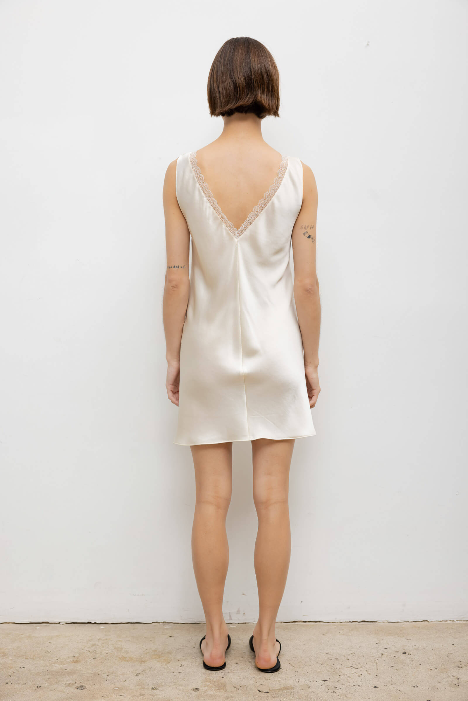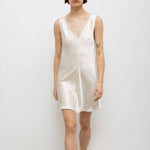 Cut in our Japanese-crafted Barb Lace Satin, the Barb Lace V Neck Mini Dress features a deep V-neckline, sleeveless A-line silhouette, and swinging mini length. Finished with a fine, scalloped lace edge.