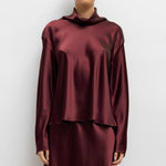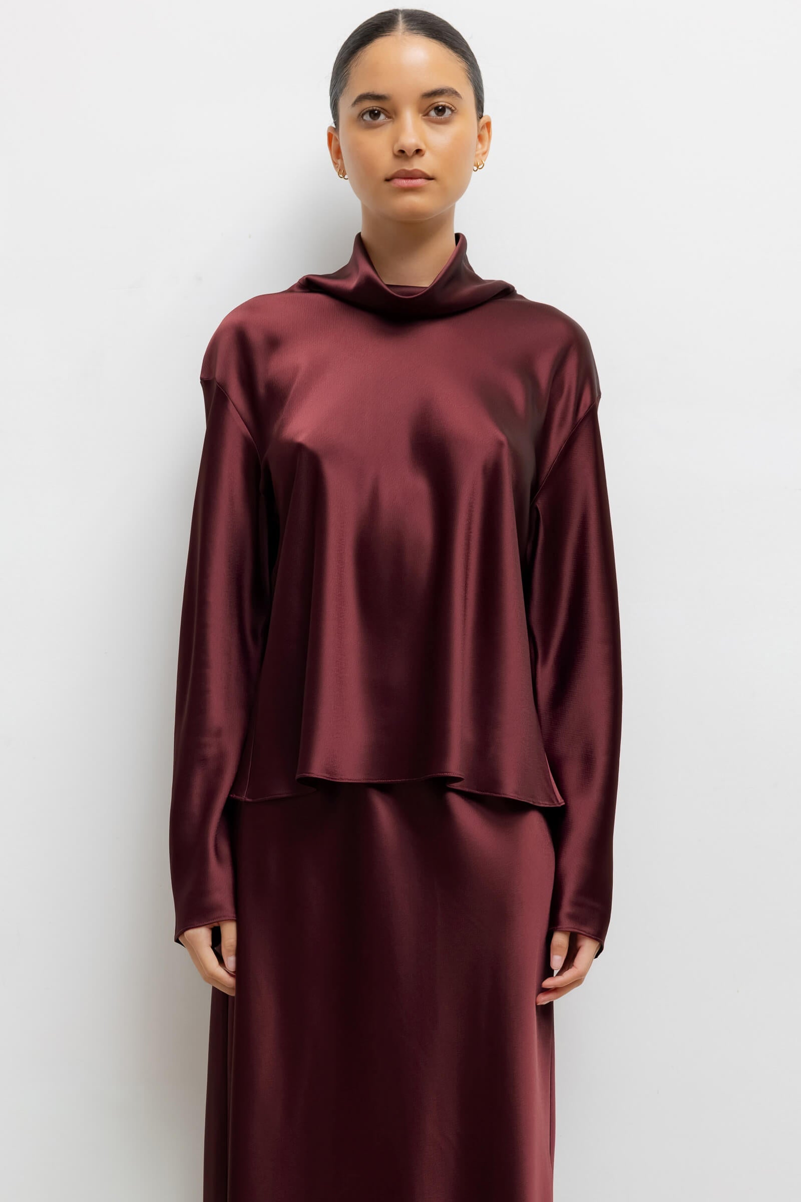Cut in our best-selling Japanese-crafted Barb Satin, The Barb Long Sleeve Cowl Neck is a classic long sleeve top, featuring a perfectly draped cowl neckline and tuckable length. Make it a matching set with any Barb bottom in Bordeaux.