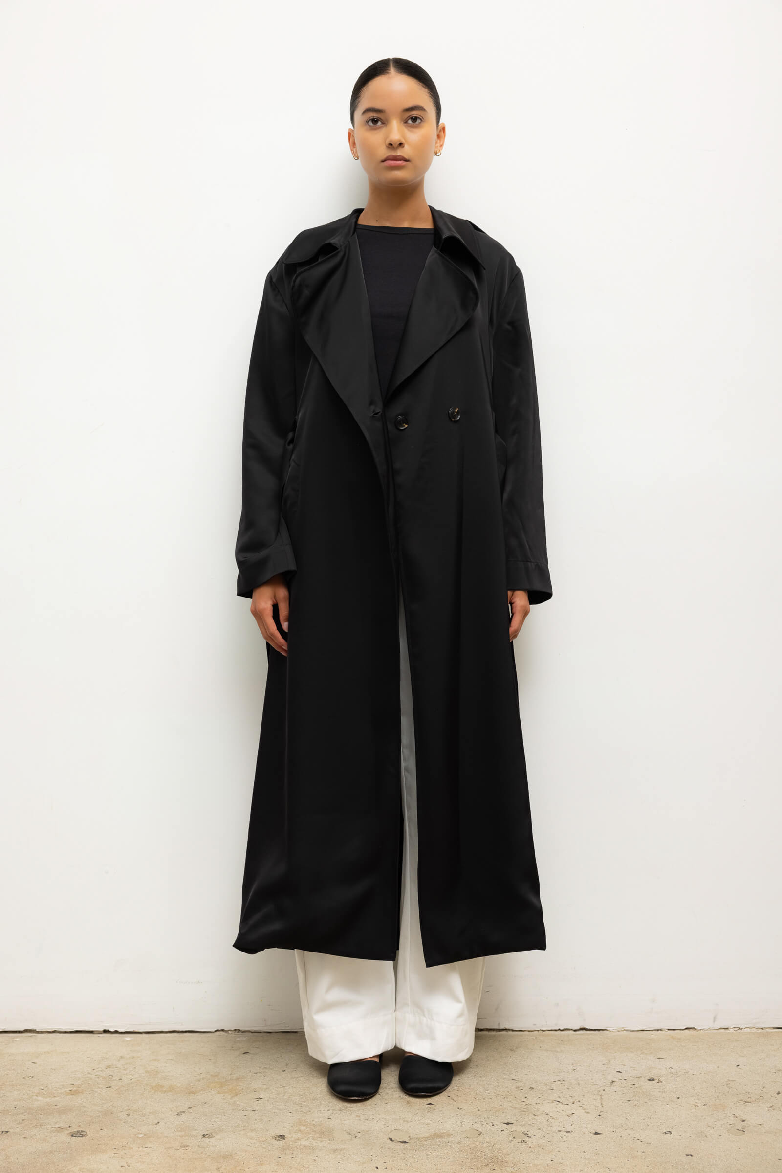 Cut in our best-selling Japanese-crafted satin, The Barb Classic Trench features a full, sweeping length, classic notched lapels, and an adjustable belt. Wear it over any of the The Barb Set for a complete matching look.