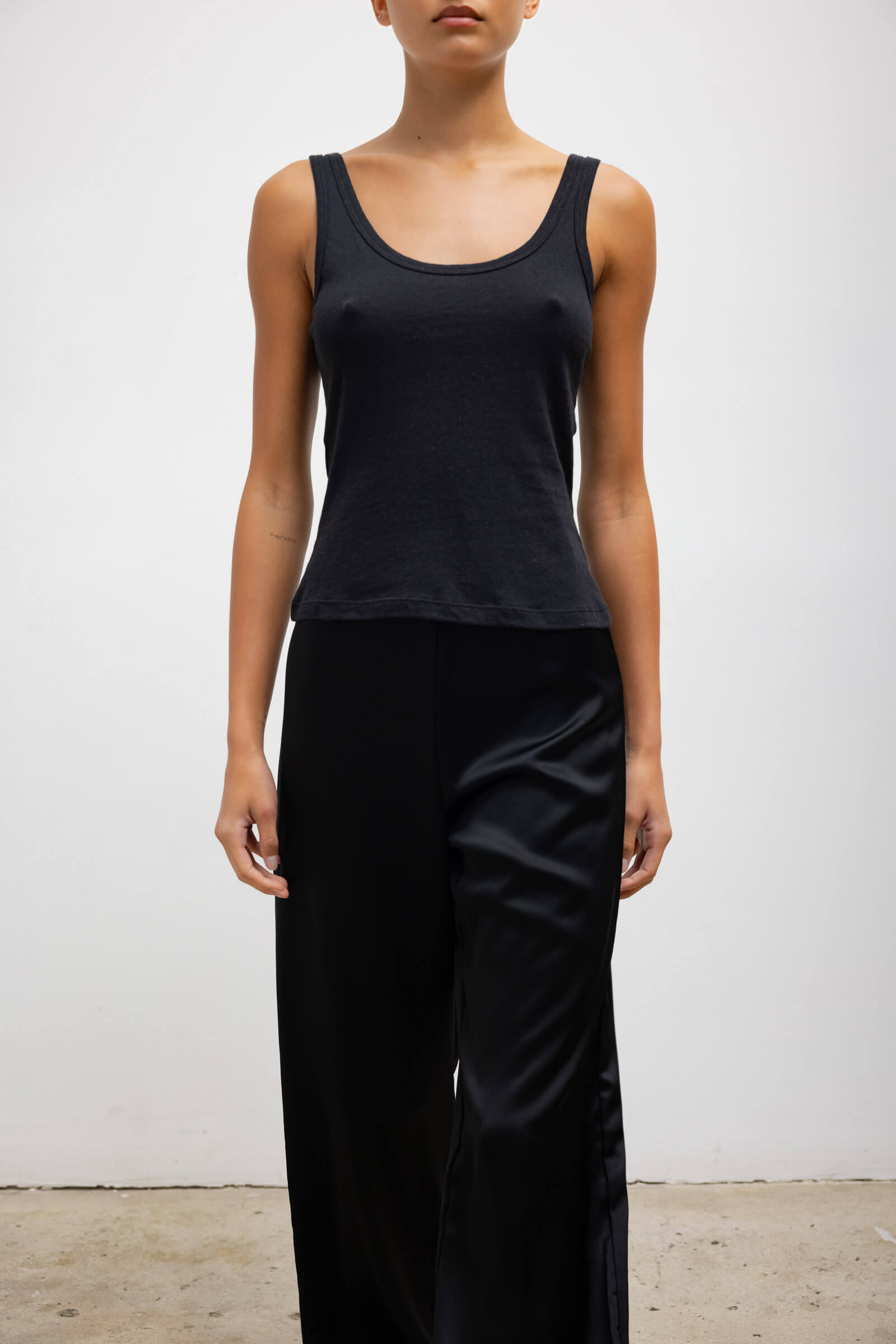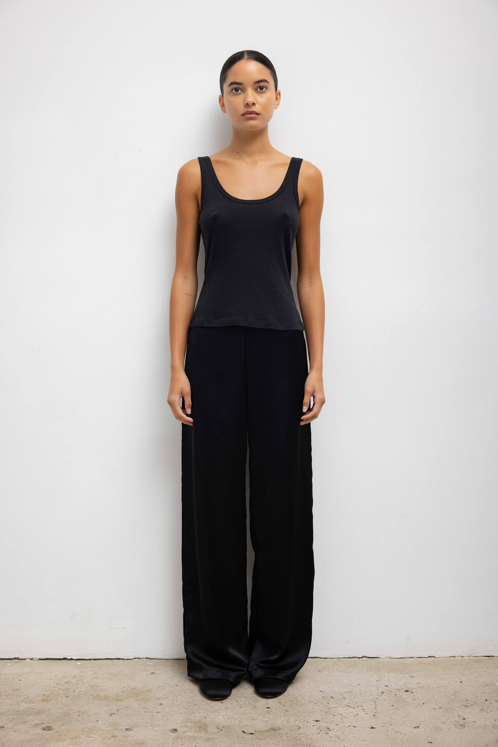 Cut in our Japanese-crafted satin, The Barb Wide Leg Pant is our bestselling option for everyday elegance. This easy pull-on silhouette features a thin elastic mid-rise waistband and a relaxed, perfectly draped wide leg.