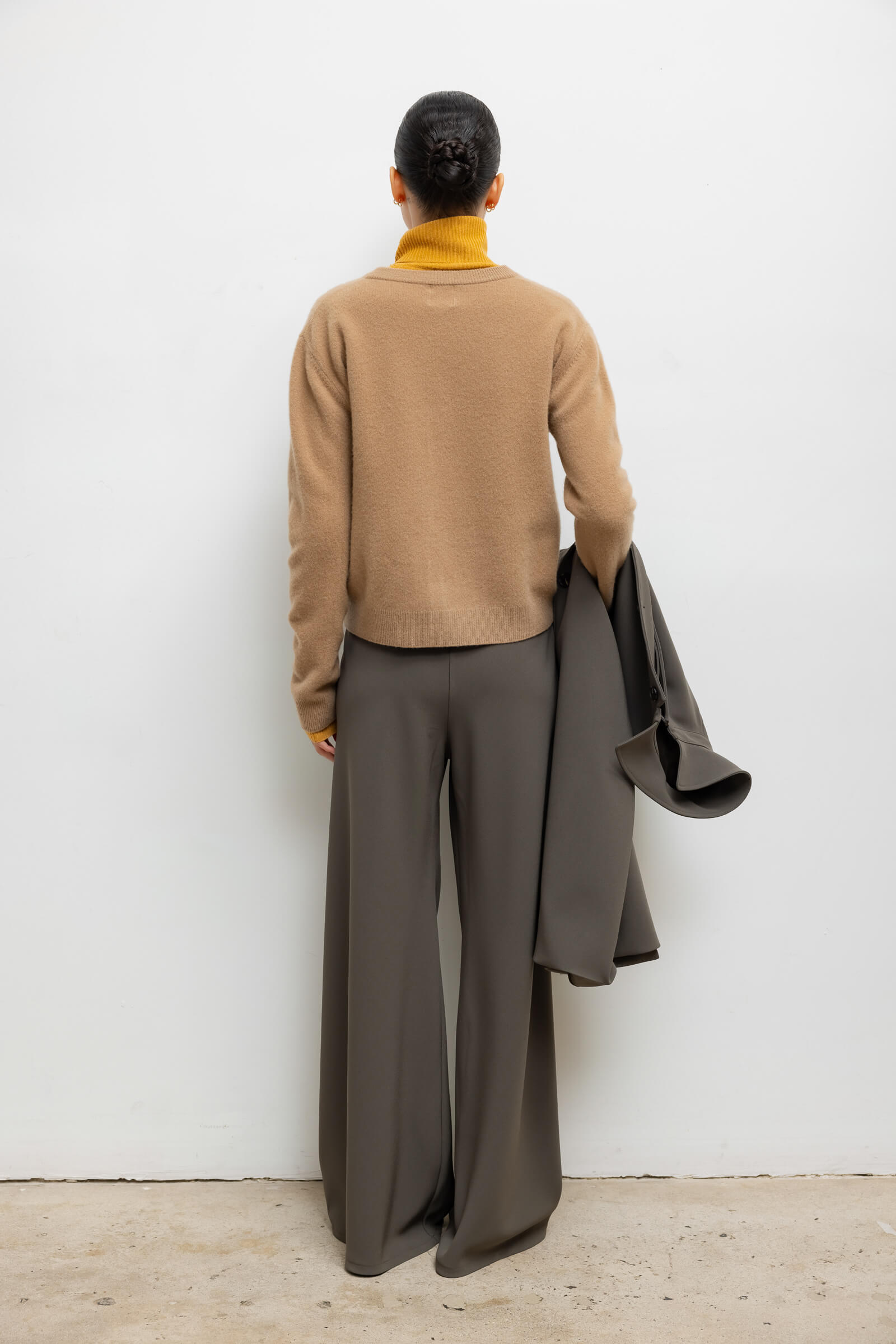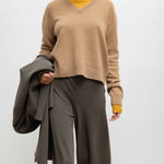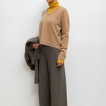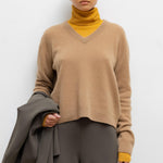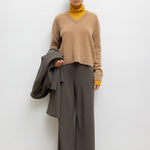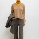 Knit in our new Jesse Felted Lambswool, The Jesse V Neck Pullover is a plush layering piece. This sweater is slightly oversized, featuring a V neckline and fine ribbed finishings. We're laying this over The Blake Sleeveless Turtleneck for a monochromatic sweater set.