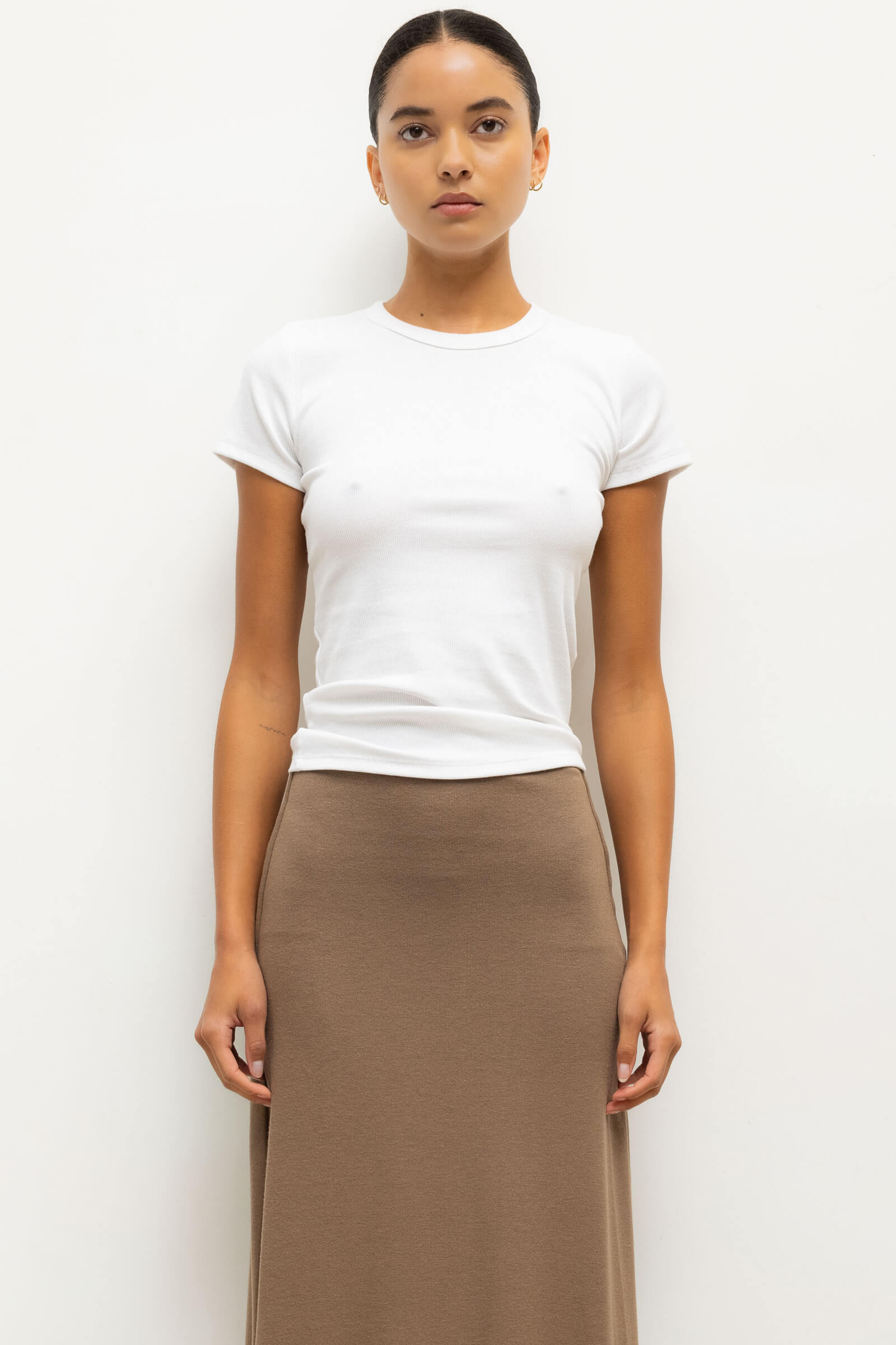 Cut in our anything but basic Kelly Cotton Rib,  The Kelly Slim Fit Tee is a figure-skimming crewneck, featuring tailored short sleeves and a full length.