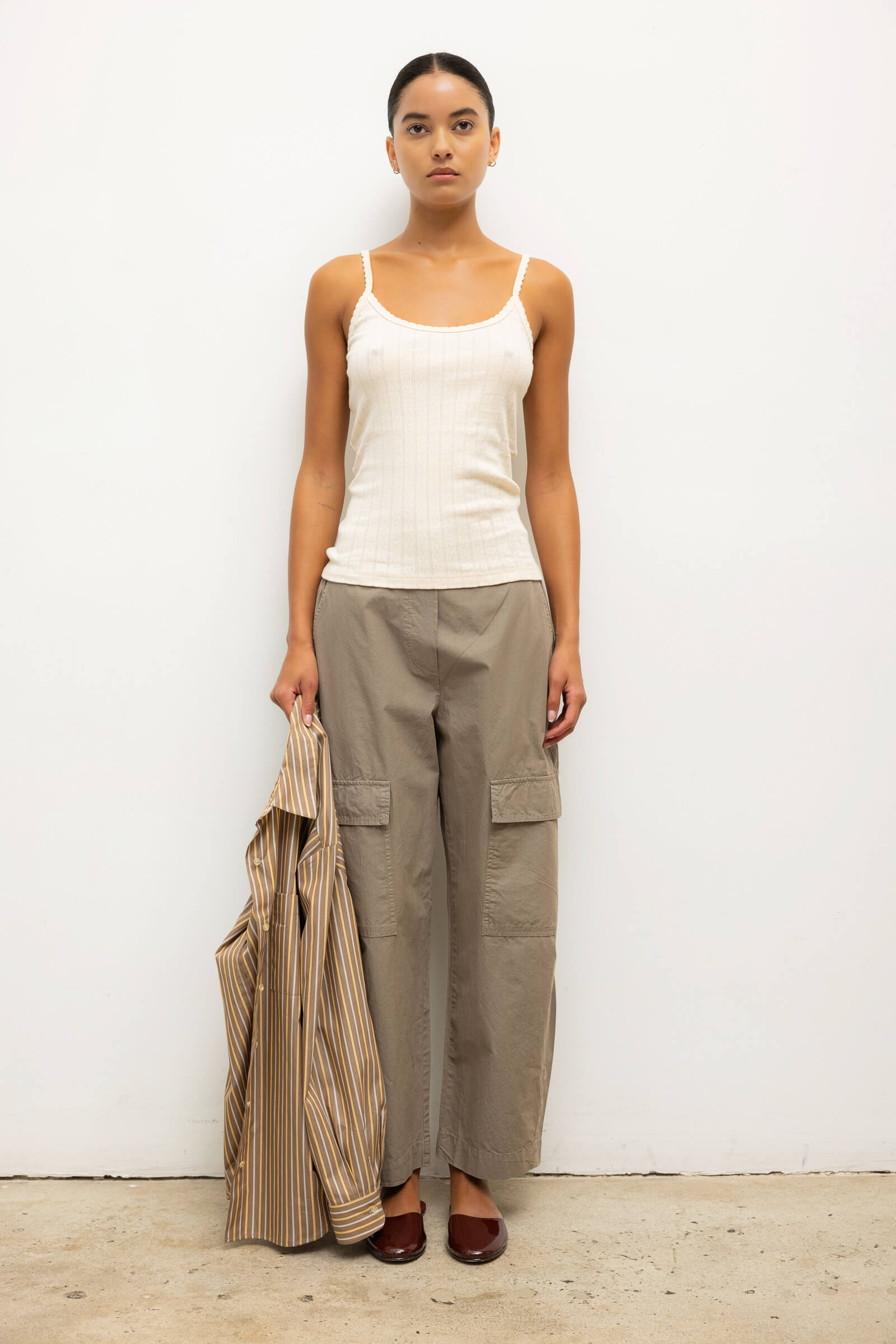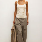 Cut in our garment dyed Kyoto Cotton, The Kyoto Barrel Pant is a utility-inspired trouser featuring a faux zip fly front, ruched elastic back waistband, and front patch pockets. For a monochromatic moment pair it with The Margo in limited edition Cypress.