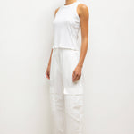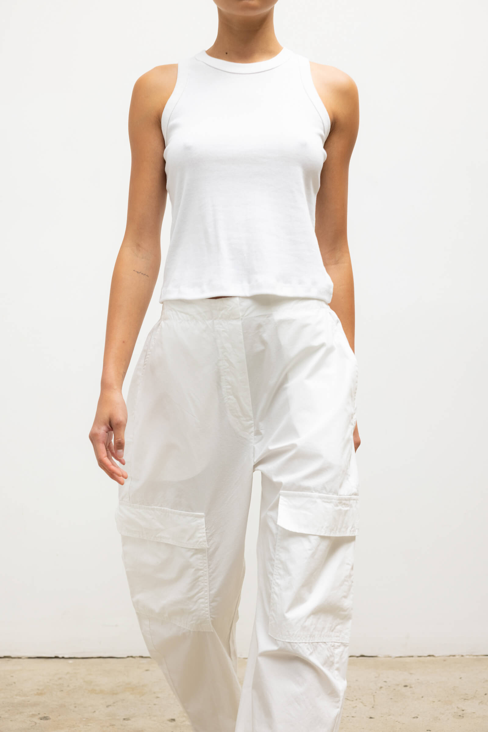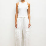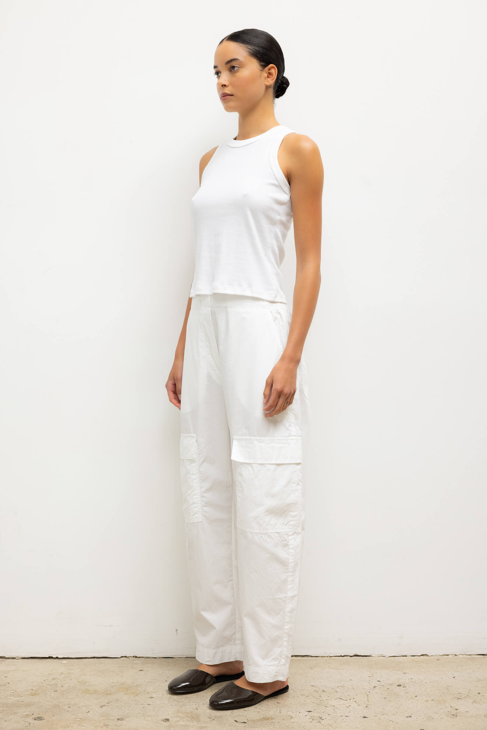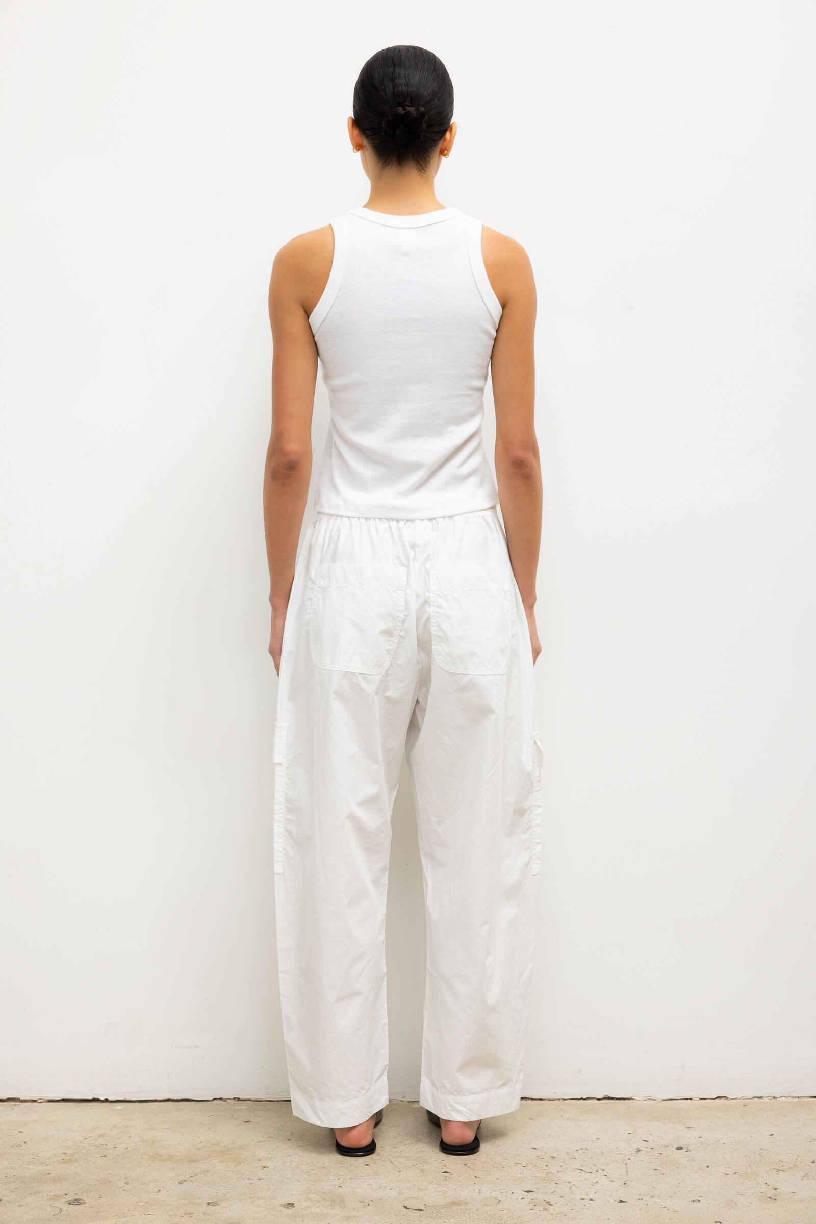 Cut in our garment dyed Kyoto Cotton, The Kyoto Barrel Pant is a utility-inspired trouser featuring a faux zip fly front, ruched elastic back waistband, and front patch pockets.