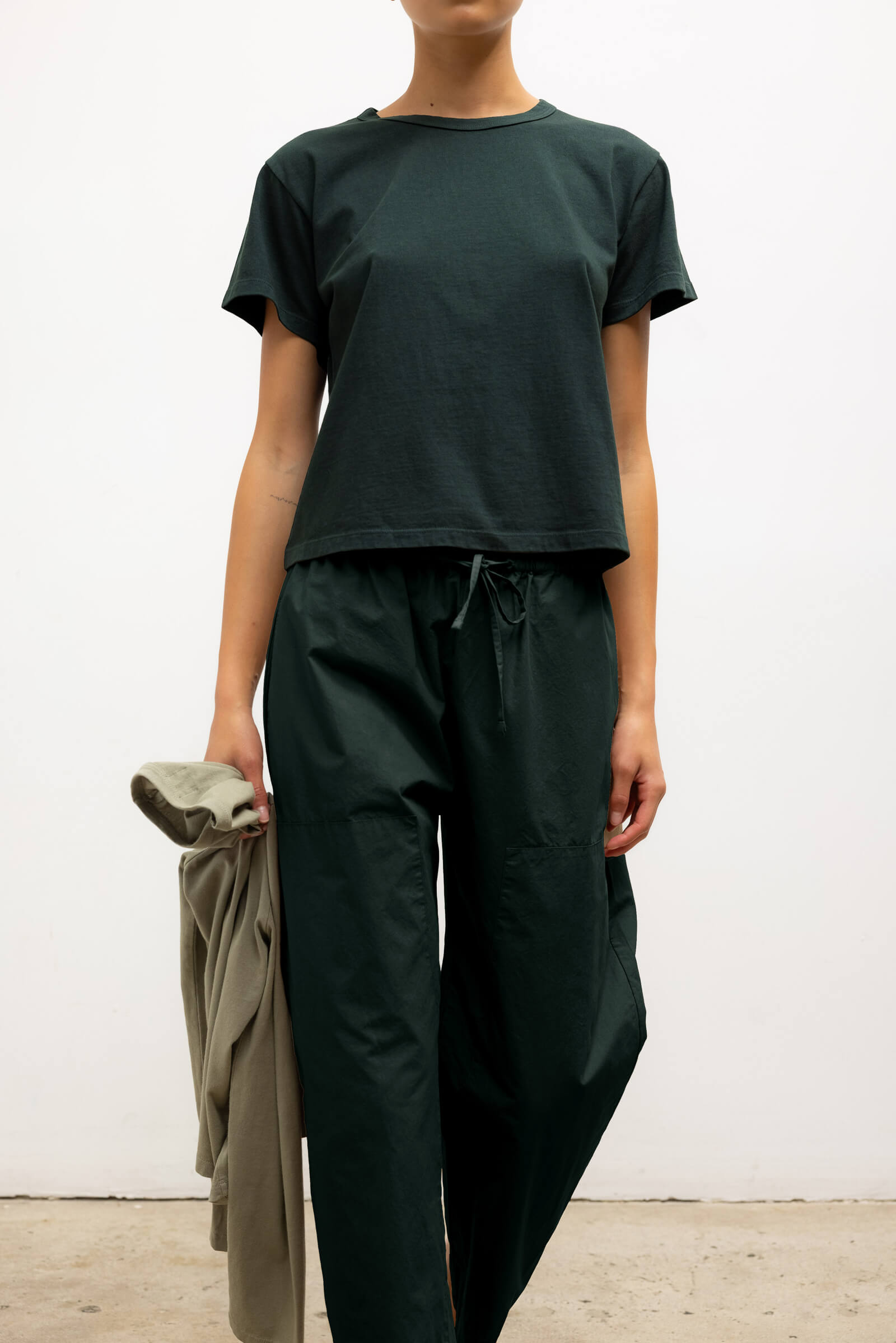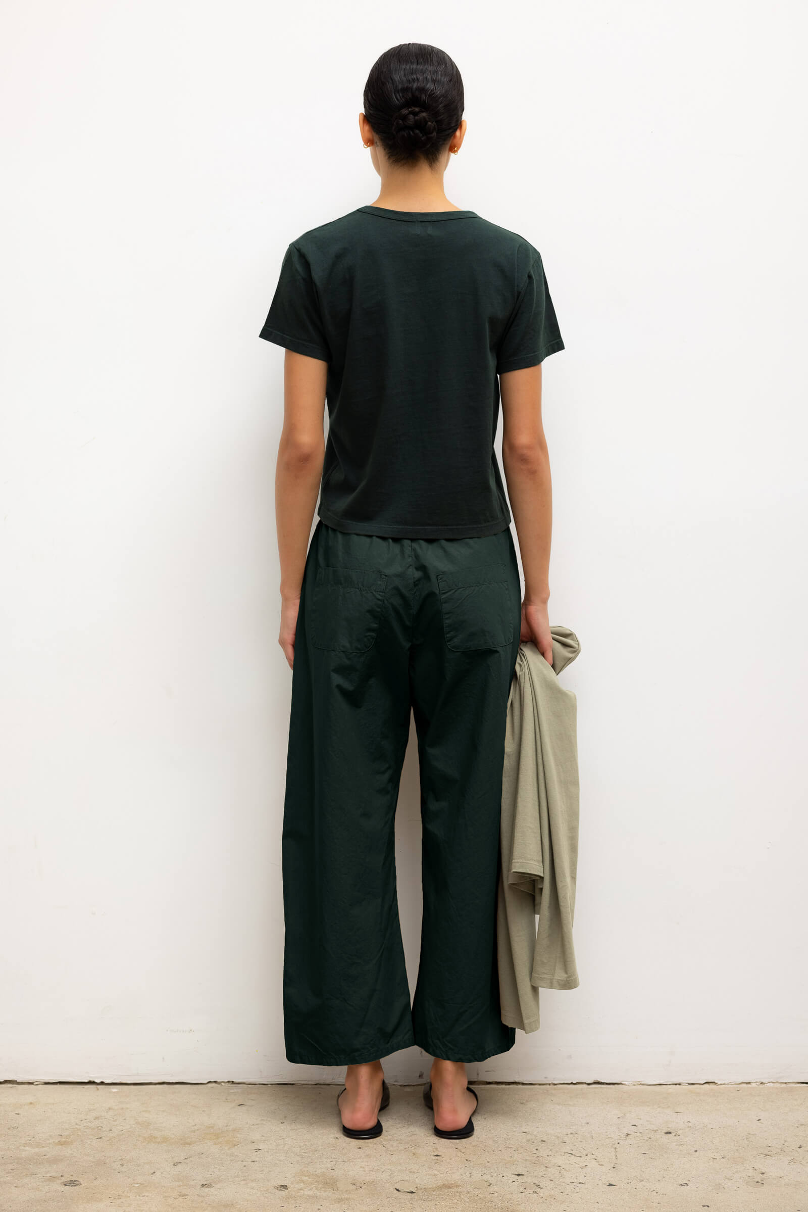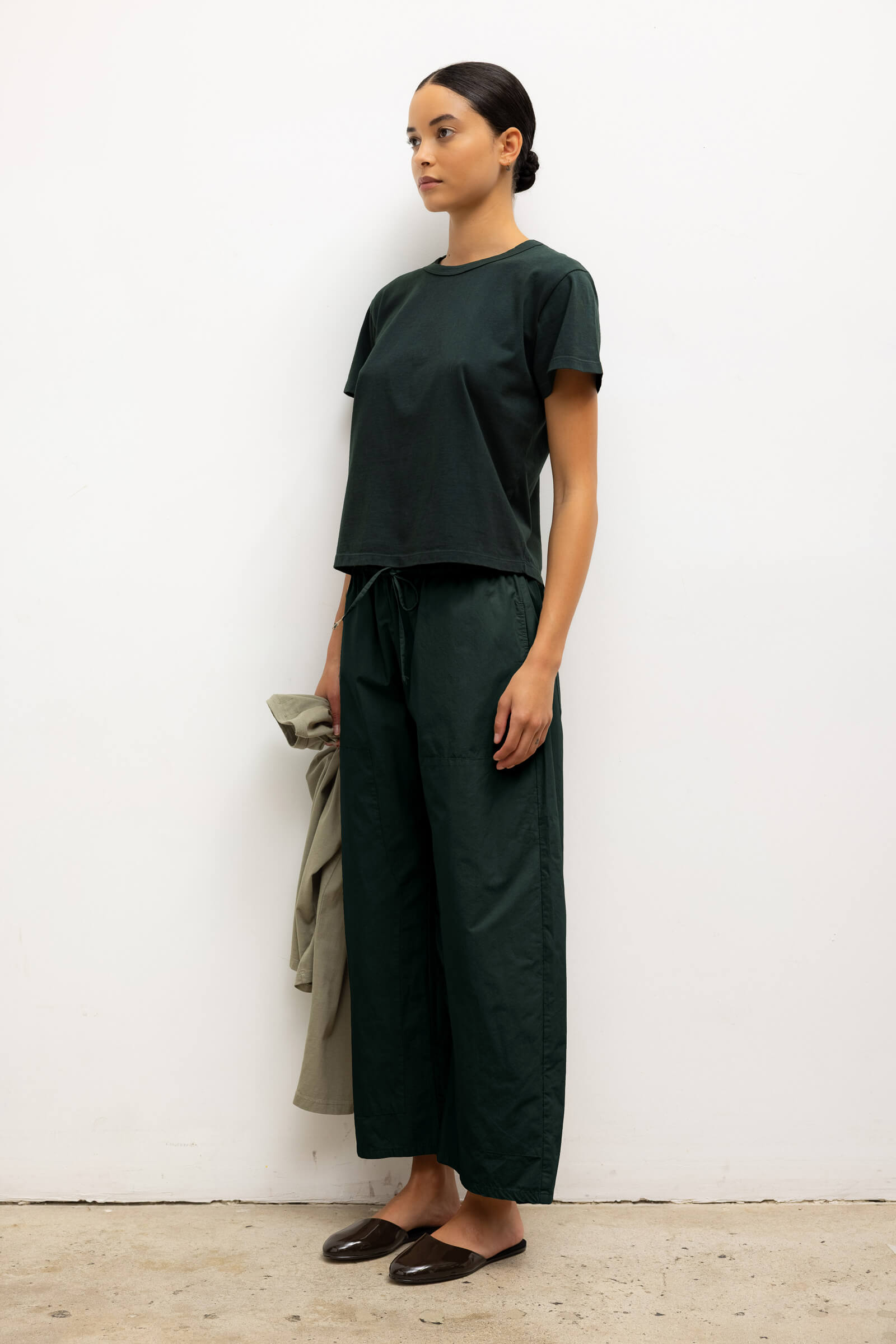 Cut in our garment dyed Kyoto Cotton, The Kyoto Carpenter Pant is a classic utility inspired trouser. This pull-on style pant features a baggy leg silhouette that hits at the ankle, with topstitched utility panels at front, an adjustable waistband, and patch pockets at back.