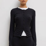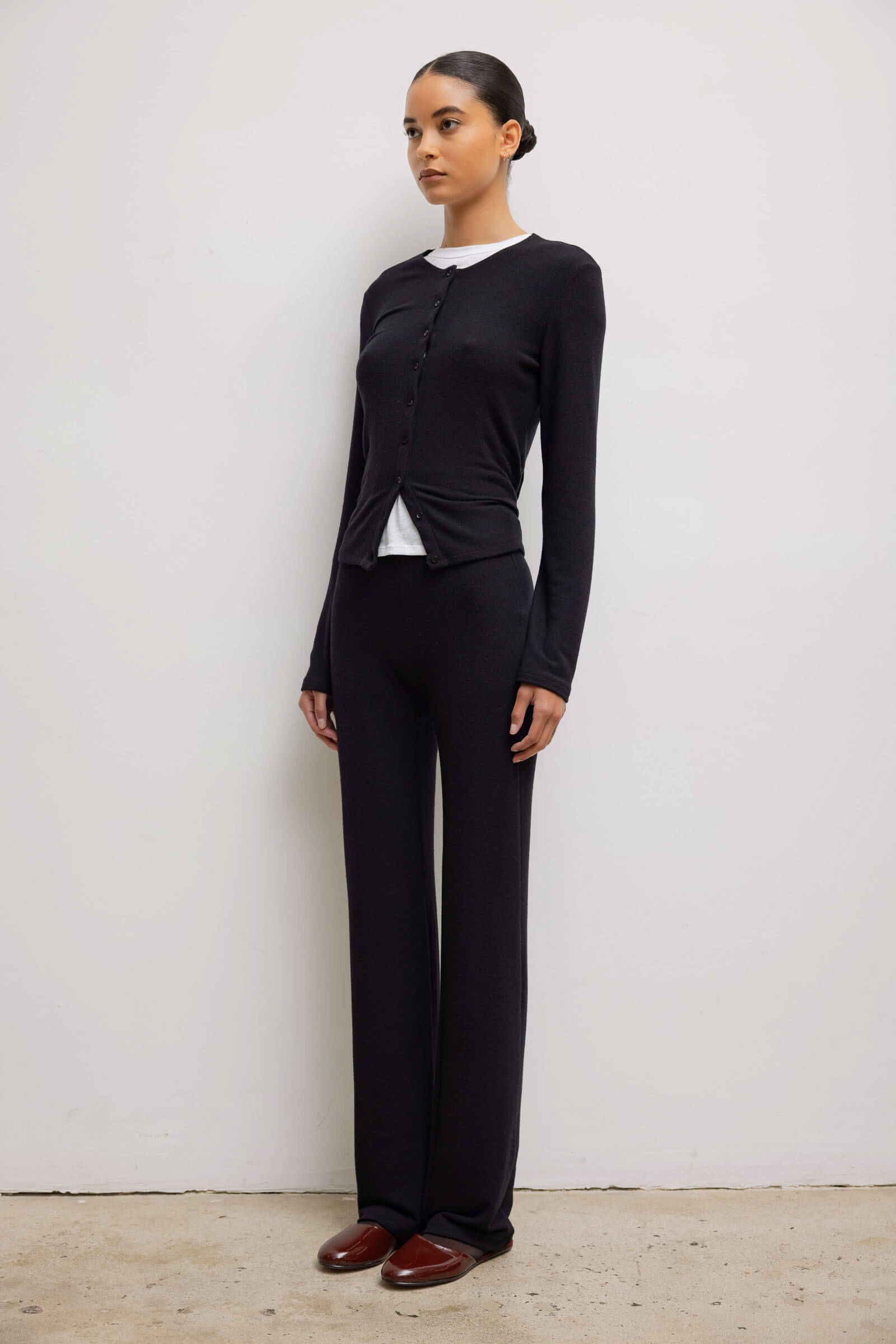 Cut in our buttery soft brushed sweater jersey, The Lauren Classic Cardigan is the full length sister to our bestselling Lauren Crop Cardigan II. This wardrobe staple features a tonal button front closure and fitted long sleeves.