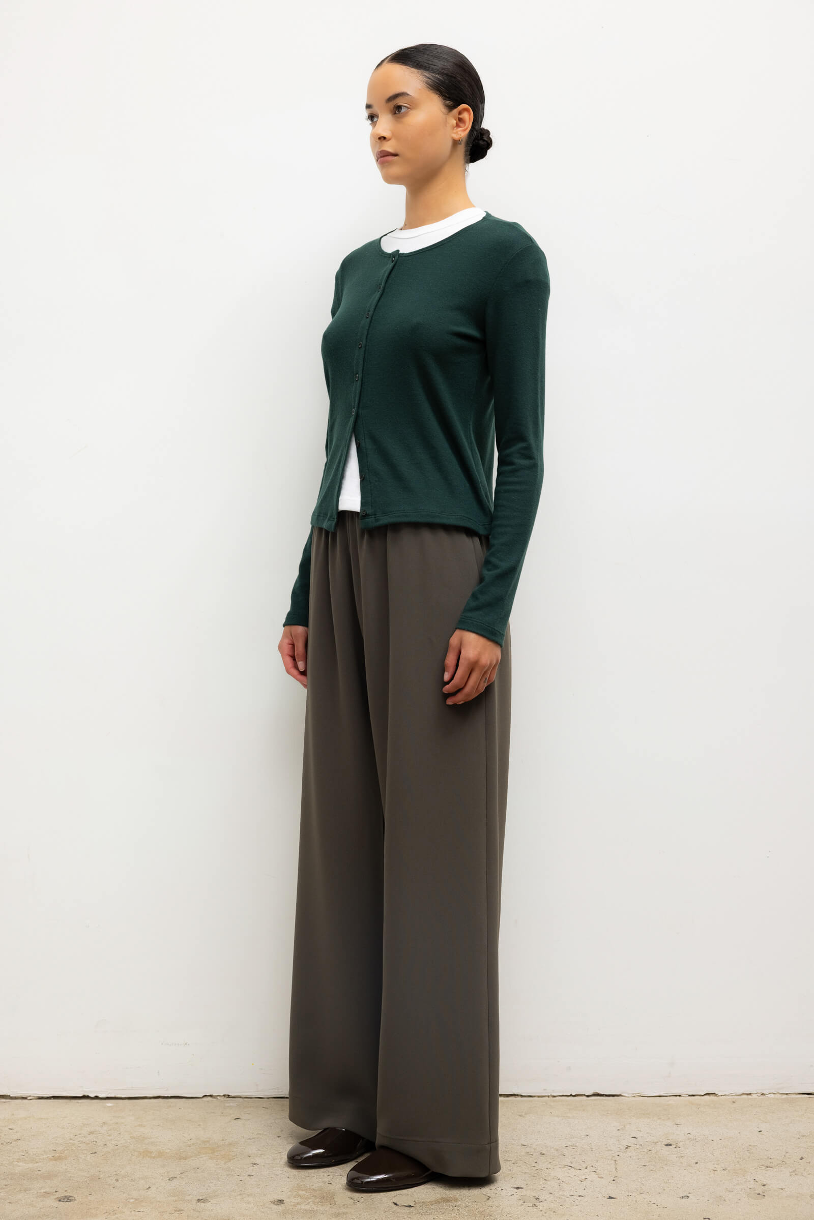 Cut in our buttery soft brushed sweater jersey, The Lauren Classic Cardigan is the full length sister to our bestselling Lauren Crop Cardigan II. This wardrobe staple features a tonal button front closure and fitted long sleeves.