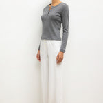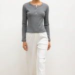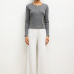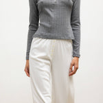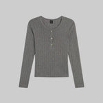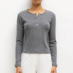Cut in our nostalgic Pointelle Cotton, The Pointelle Long Sleeve Henley features our signature pinhole stripes, dainty eyelets, and scalloped edging. Finished with a button up henley neckline and fitted full length sleeves.