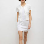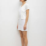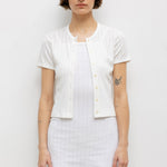Cut in our nostalgic Pointelle Cotton, The Pointelle Short Sleeve Cardigan features a crew neckline, short sleeves and our signature pinholes stripes, dainty eyelets, tonal buttons and scalloped edging. Wear it buttoned up by itself or open with our new Pointelle Square Neck Mini Dress.