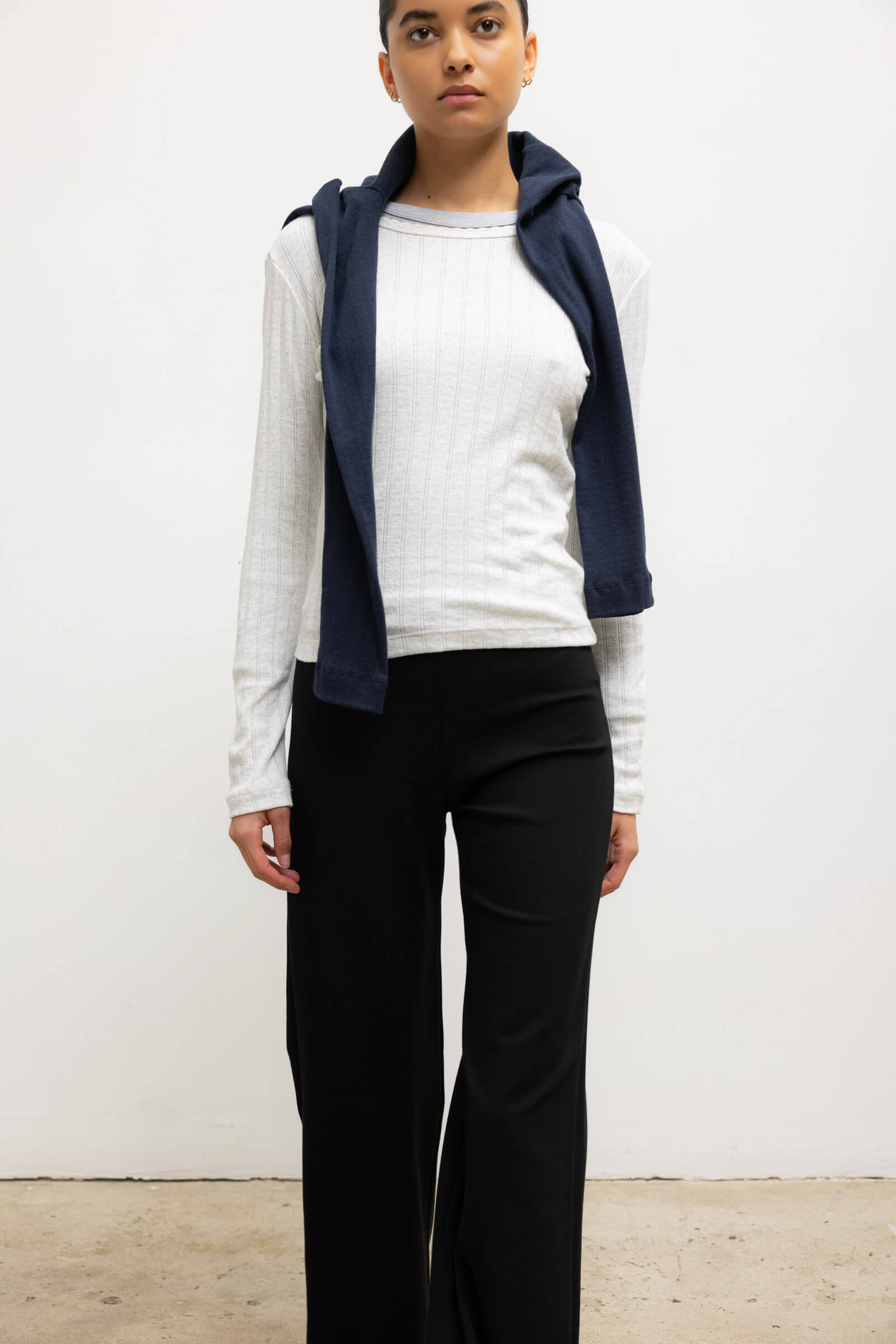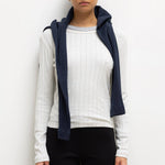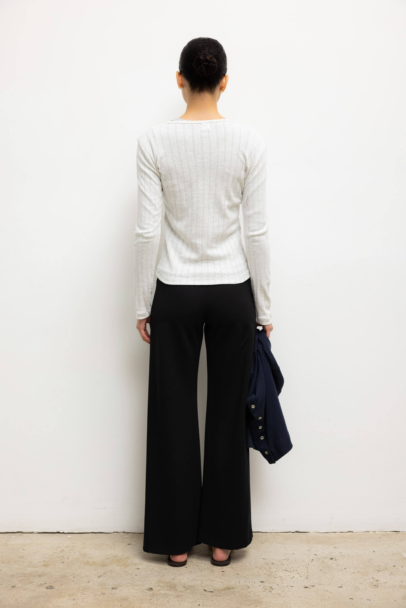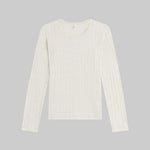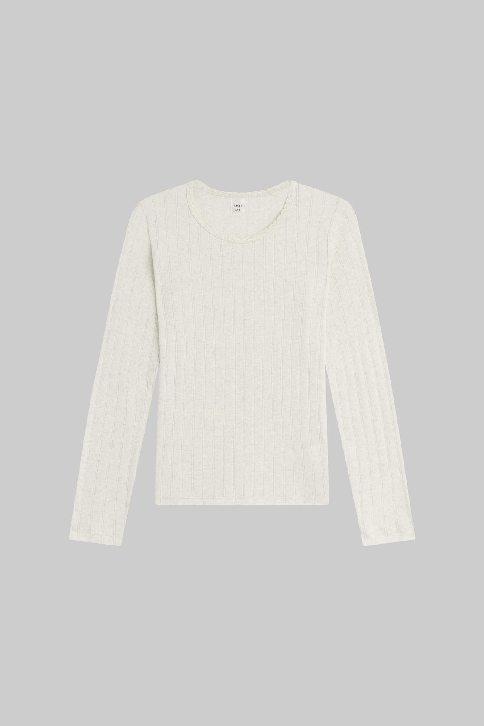 Cut in our nostalgic Pointelle Cotton, The Pointelle Slim Fit Long Sleeve features a classic crew neckline with our signature pinhole stripes, dainty eyelets, and scalloped edging. Full length with fitted long sleeves.