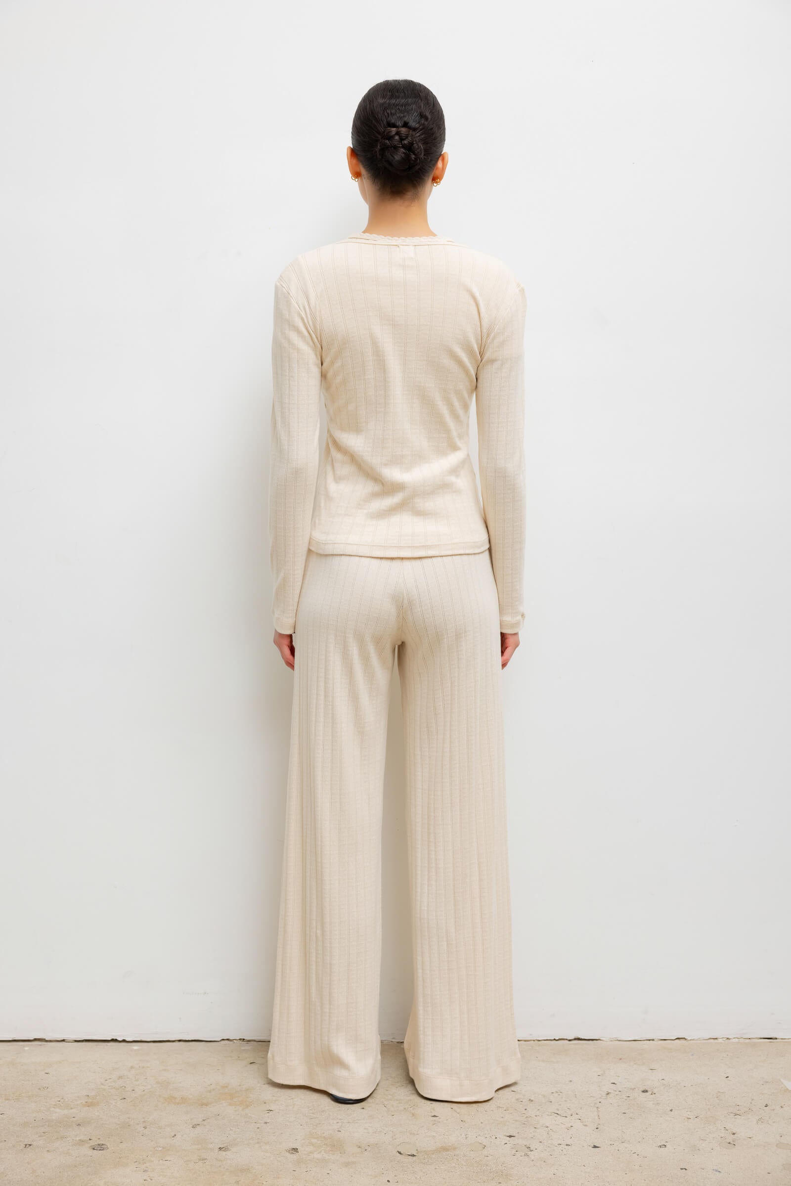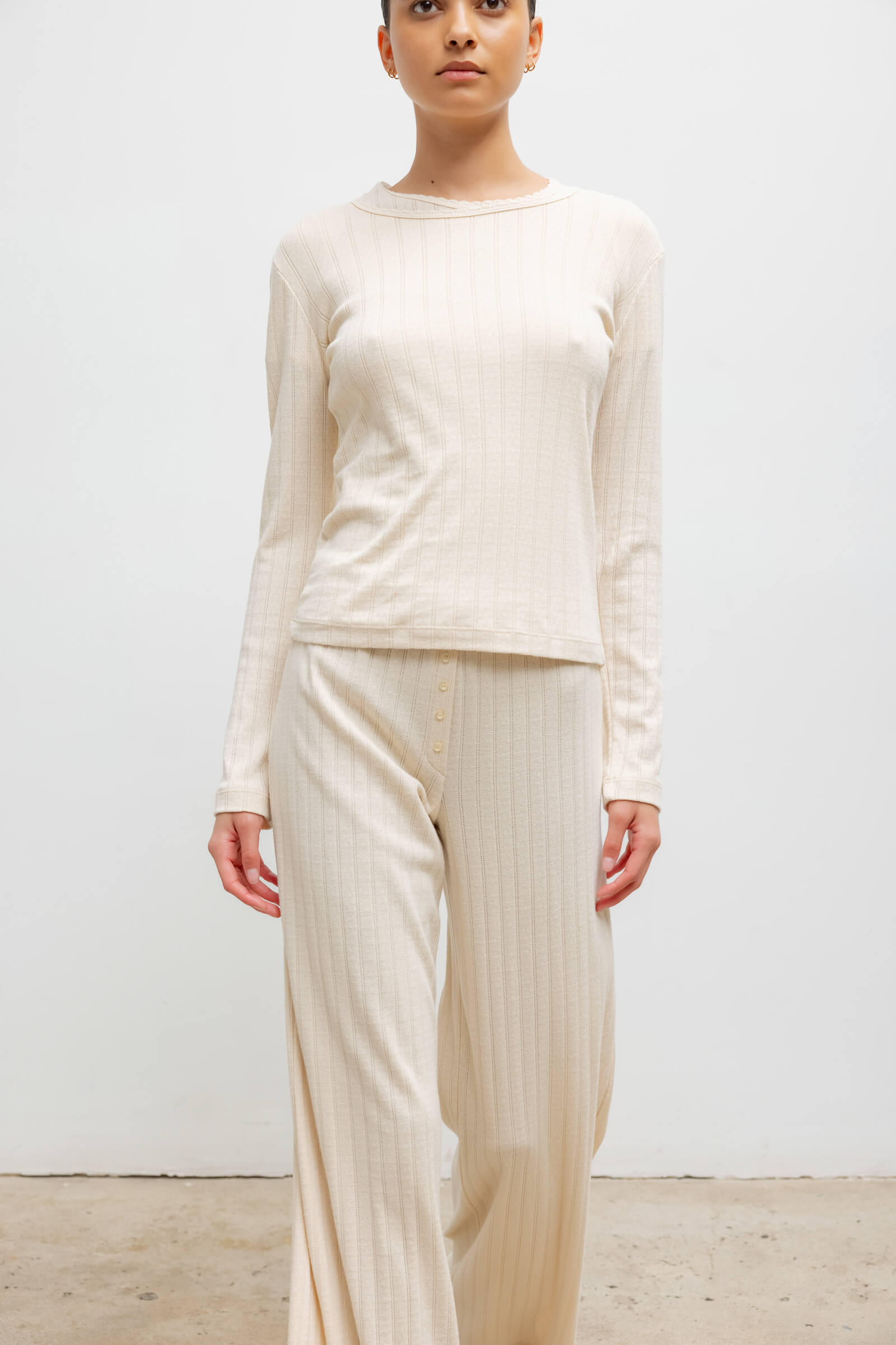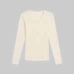 Cut in our nostalgic Pointelle Cotton, The Pointelle Slim Fit Long Sleeve features a classic crew neckline with our signature pinhole stripes, dainty eyelets, and scalloped edging. Full length with fitted long sleeves.
