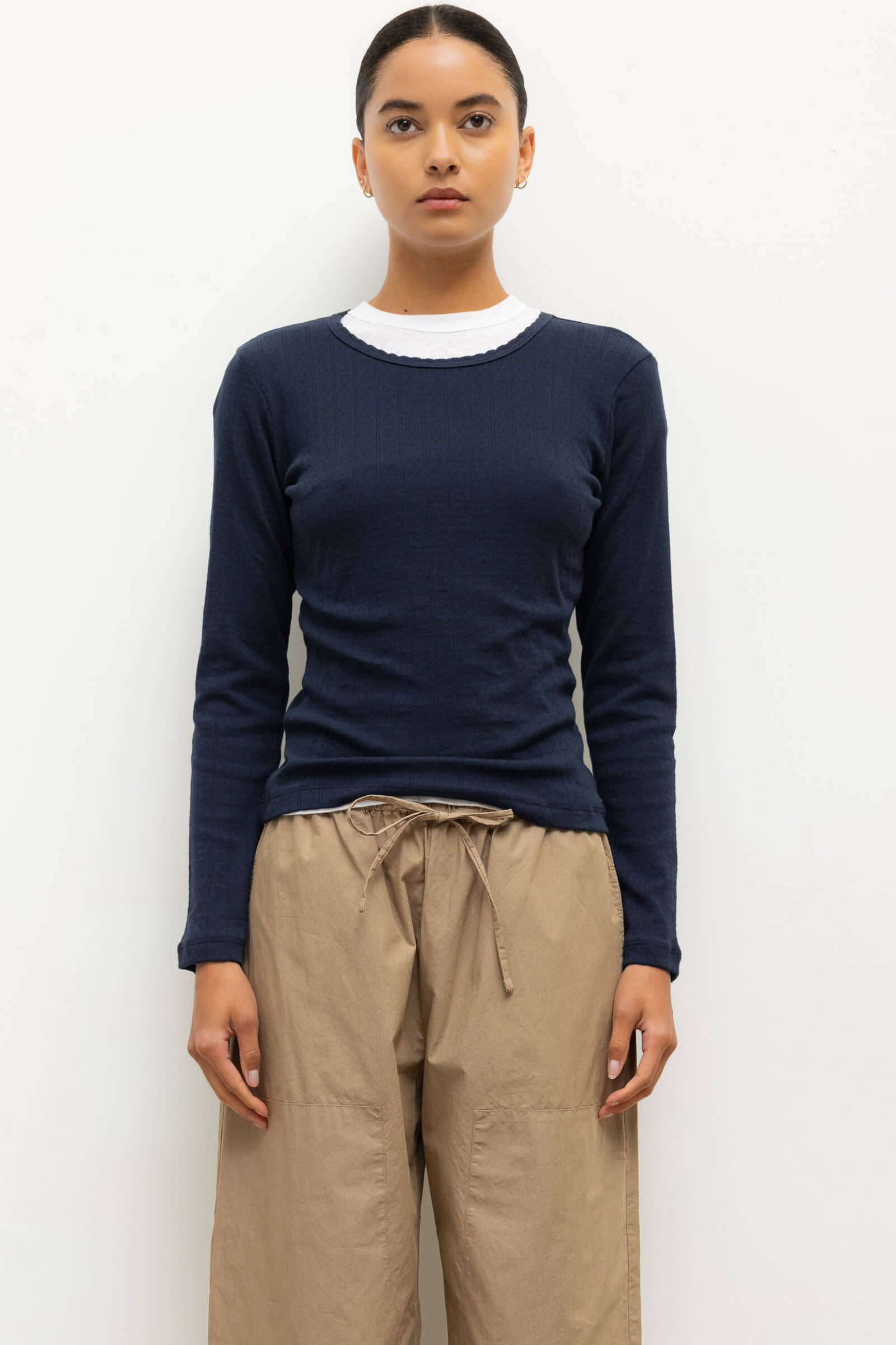 Cut in our nostalgic Pointelle Cotton, The Pointelle Slim Fit Long Sleeve features a classic crew neckline with our signature pinhole stripes, dainty eyelets, and scalloped edging. Full length with fitted long sleeves.