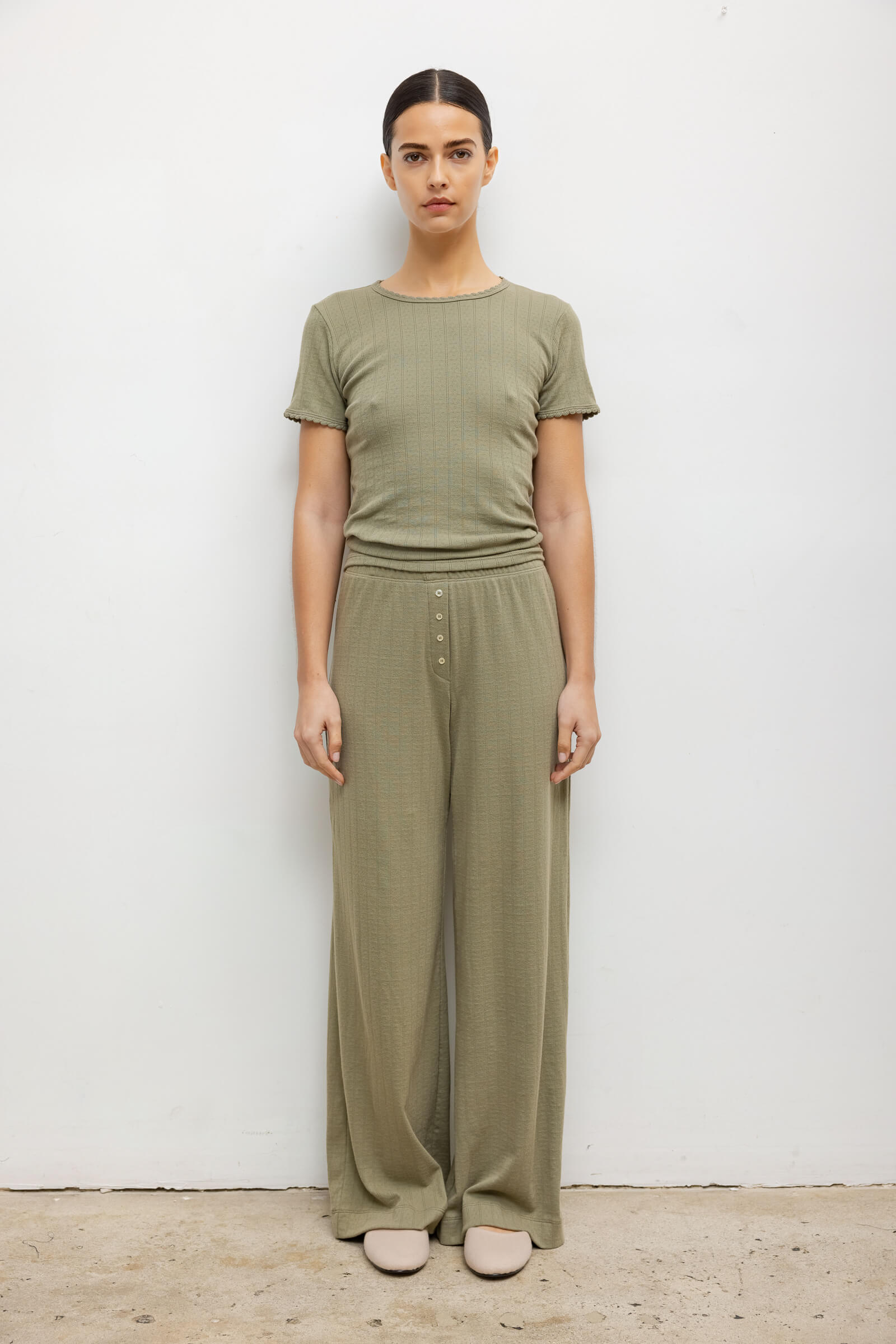 Cut in our nostalgic Pointelle Cotton, The Pointelle Slim Fit Tee features a classic crew neckline and fitted short sleeves with our signature pinhole stripes, dainty eyelets, and scalloped edging. Now in limited edition Cypress.