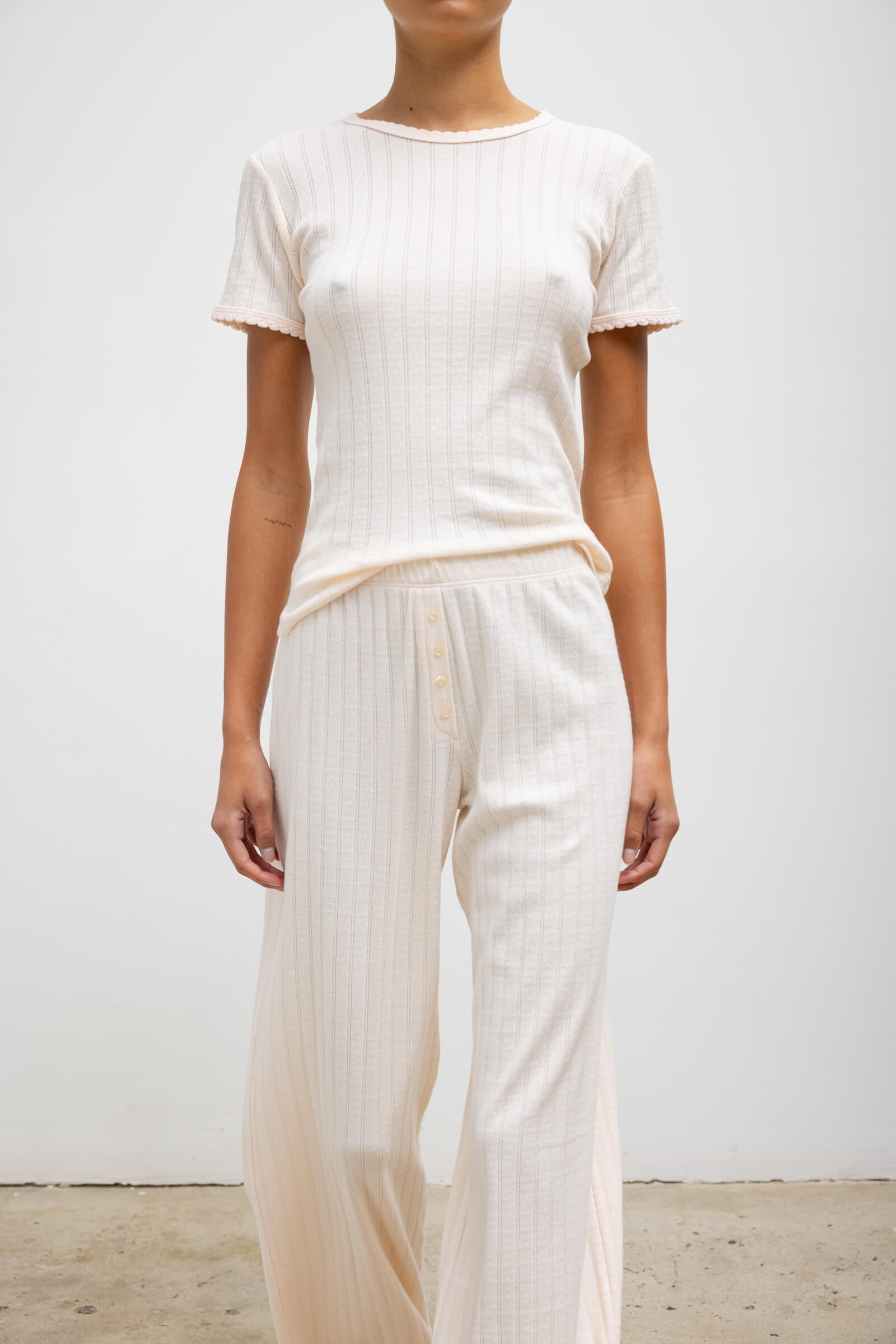 Cut in our nostalgic Pointelle Cotton, The Pointelle Slim Fit Tee features a classic crew neckline with our signature pinhole stripes, dainty eyelets, and scalloped edging.