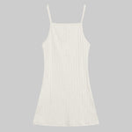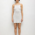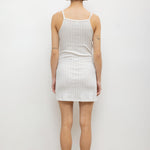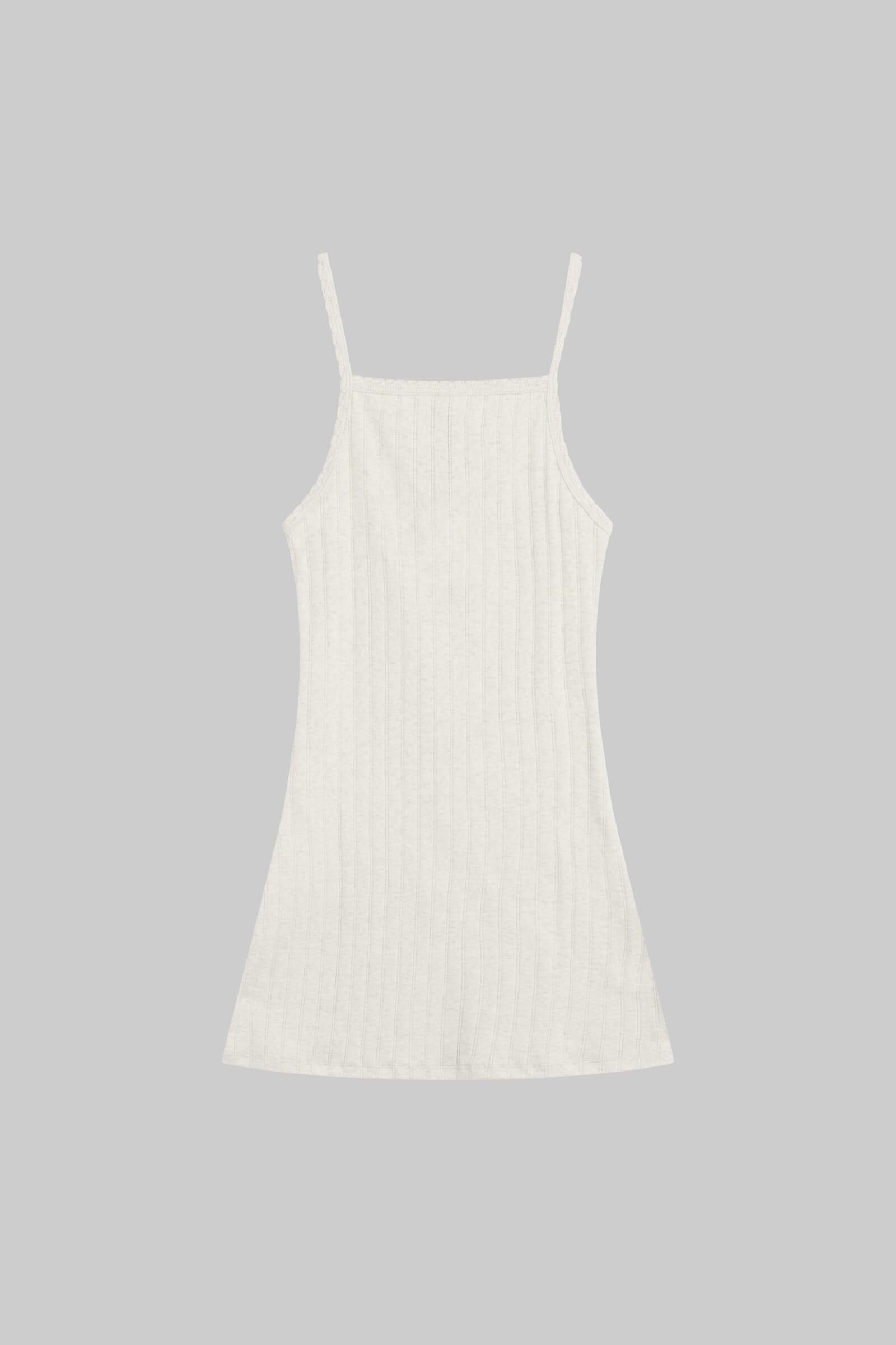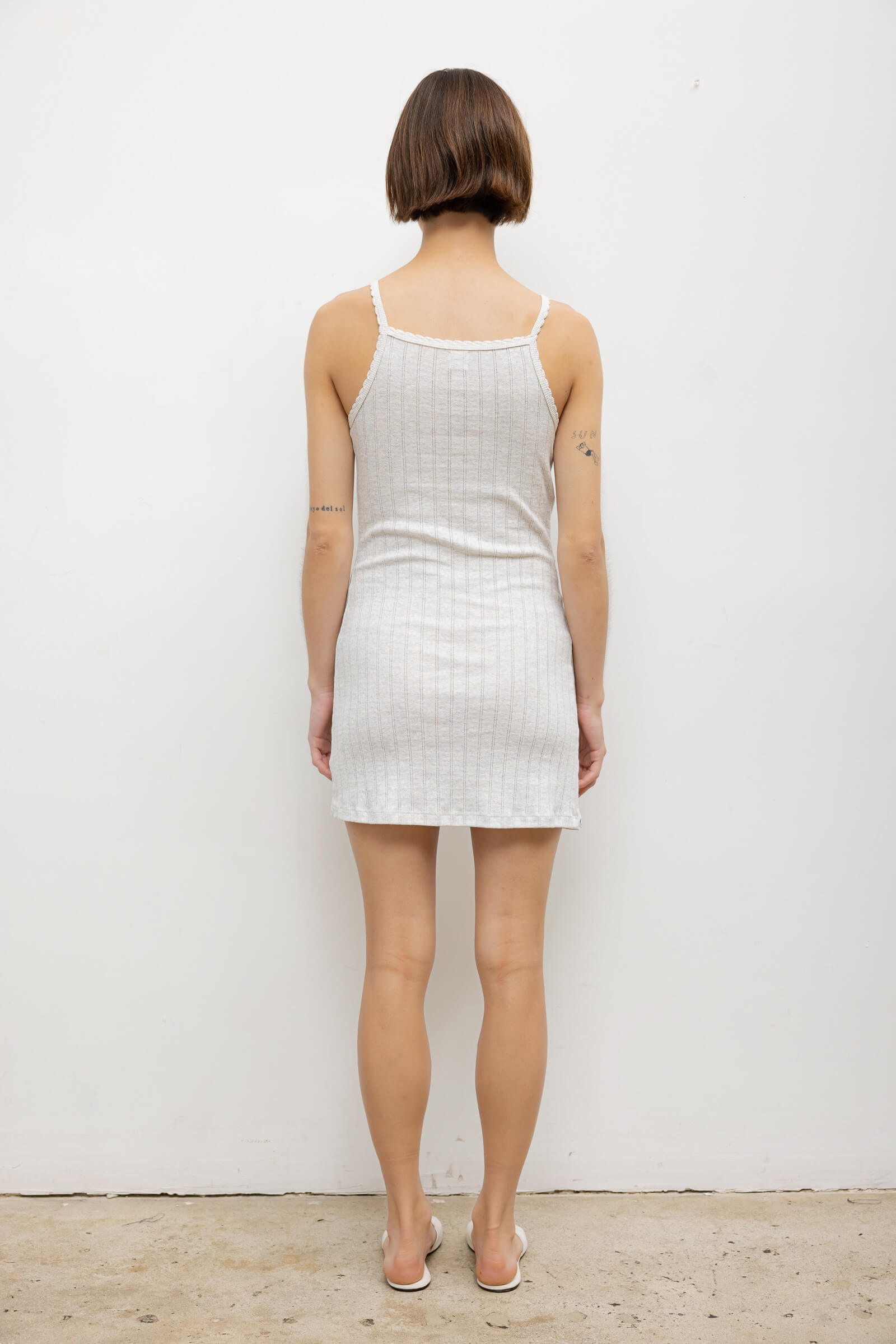 Cut in our nostalgic Pointelle Cotton, The Pointelle Square Neck Mini Dress features a high, square neckline, scalloped spaghetti straps, and a mini length. Now in limited edition Cloud Melange.