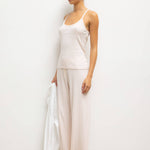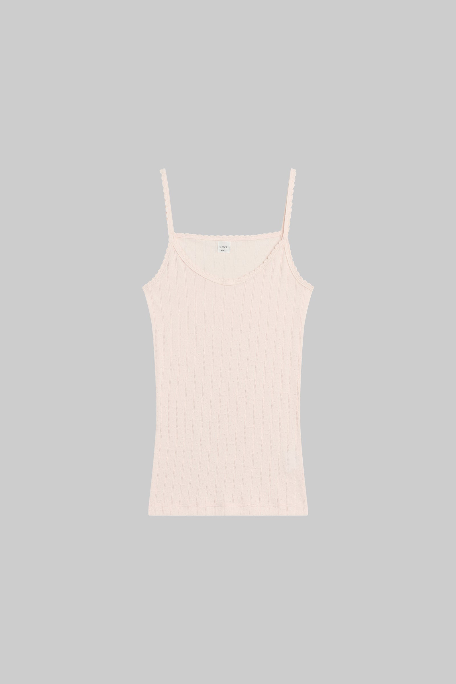 Cut in our nostalgic Pointelle Cotton, The Pointelle Tank is a classic spaghetti strap silhouette, featuring our signature pinhole stripes, dainty eyelets and scalloped edging. Wear this by itself, or layered underneath button downs and sweaters.