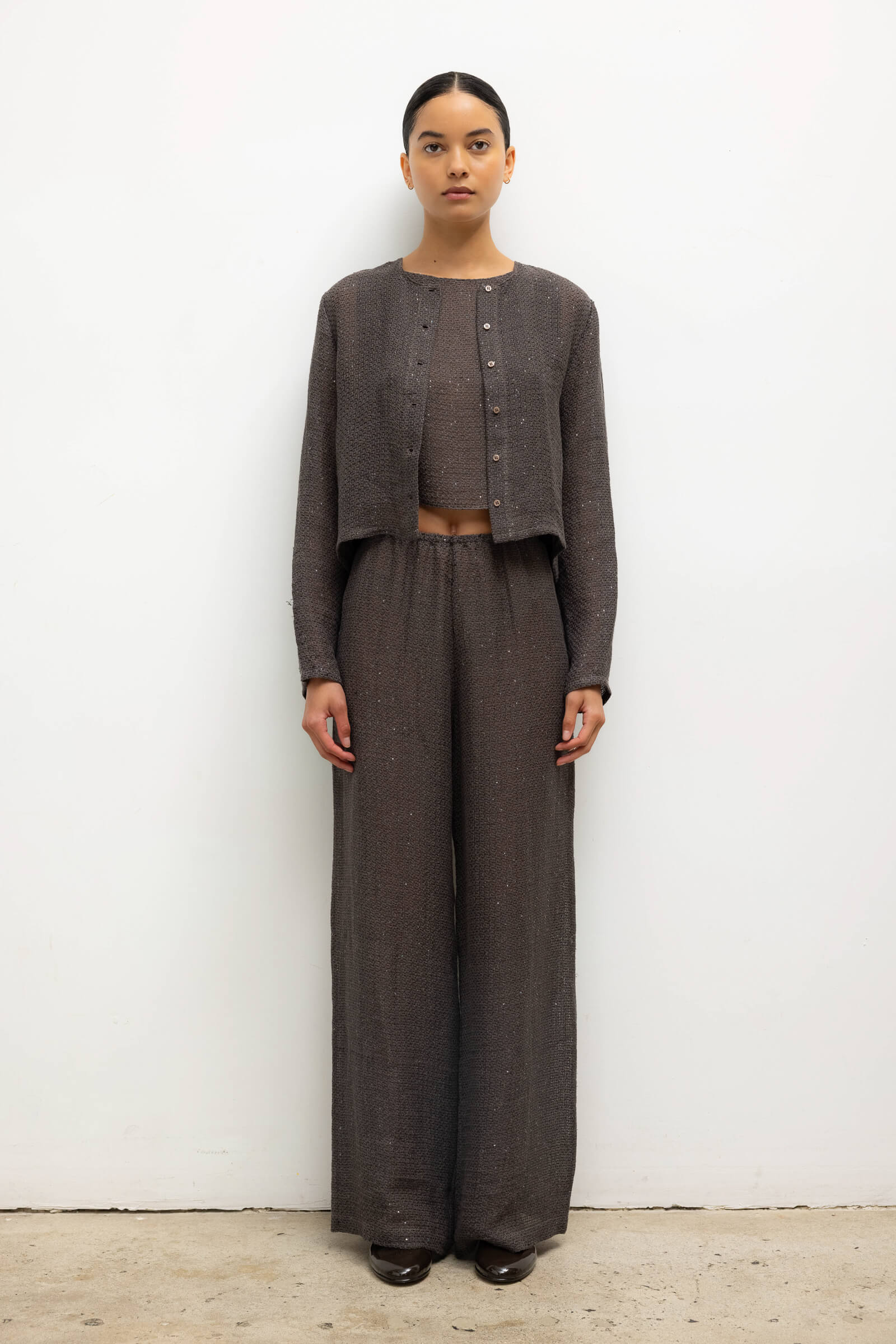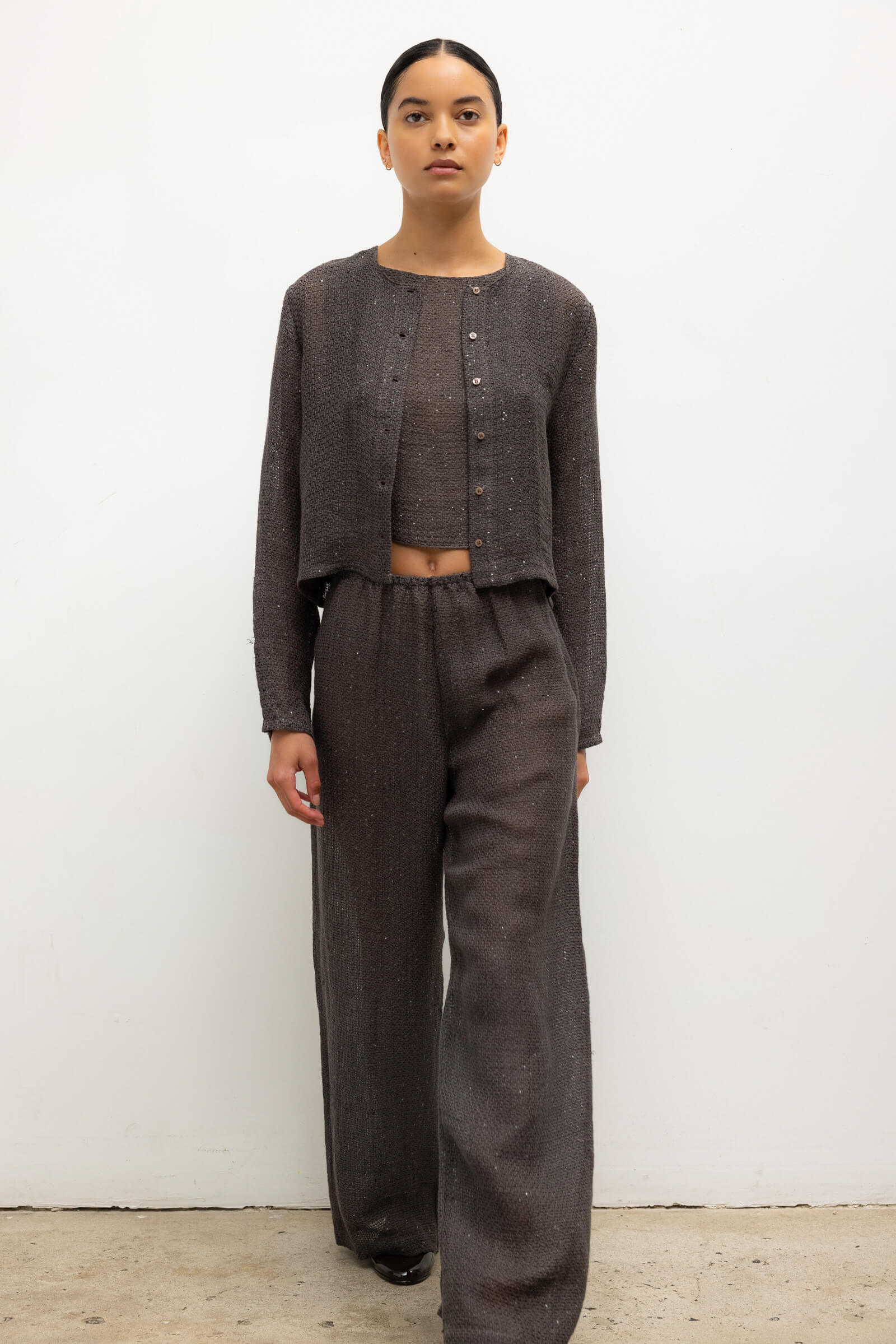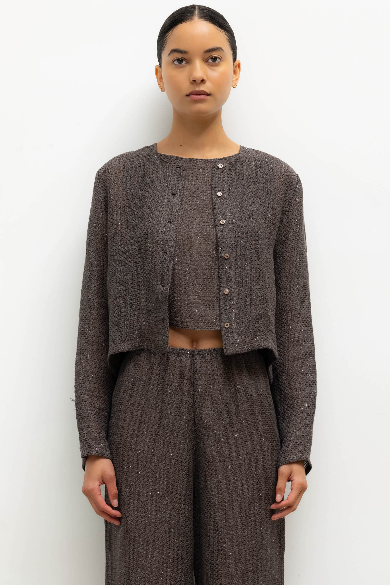Cut in our subtly sequined Stella Linen, the Stella Crew Cardigan features tonal button front closure, a crew neckline and full length sleeves. Make it a matching set with our Stella Wide Leg Pant.