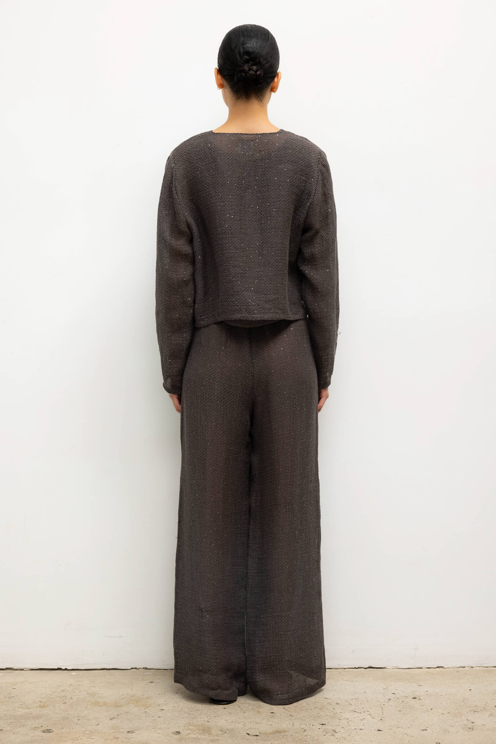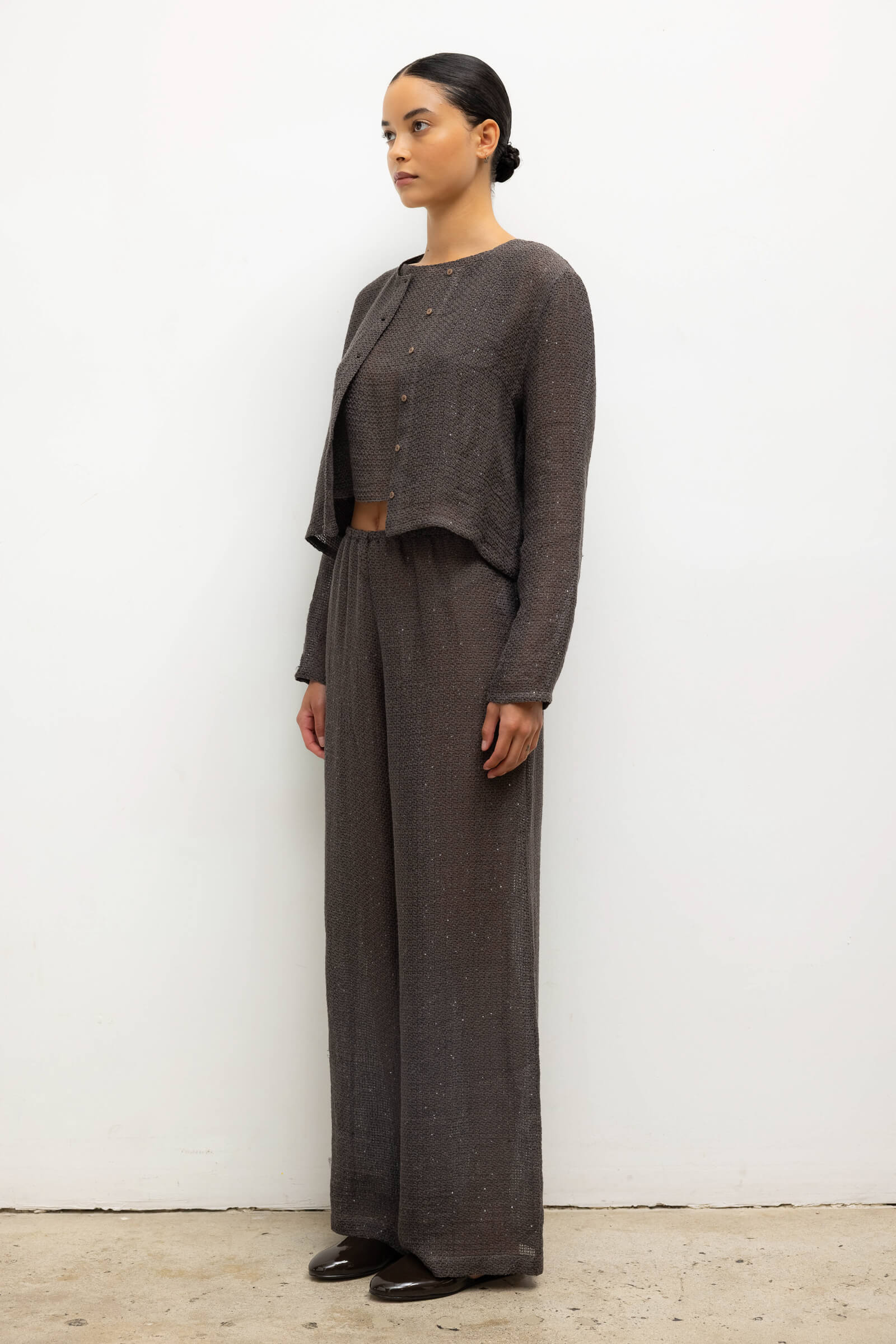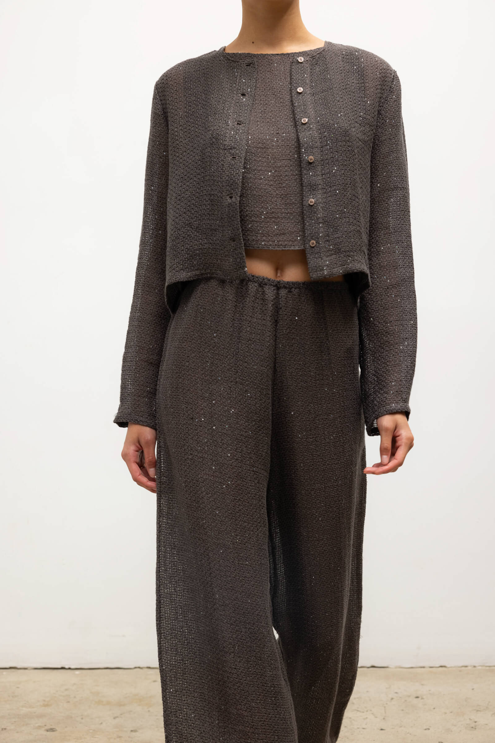 Cut in our subtly sequined Stella Linen, the Stella Crew Cardigan features tonal button front closure, a crew neckline and full length sleeves. Make it a matching set with our Stella Wide Leg Pant.
