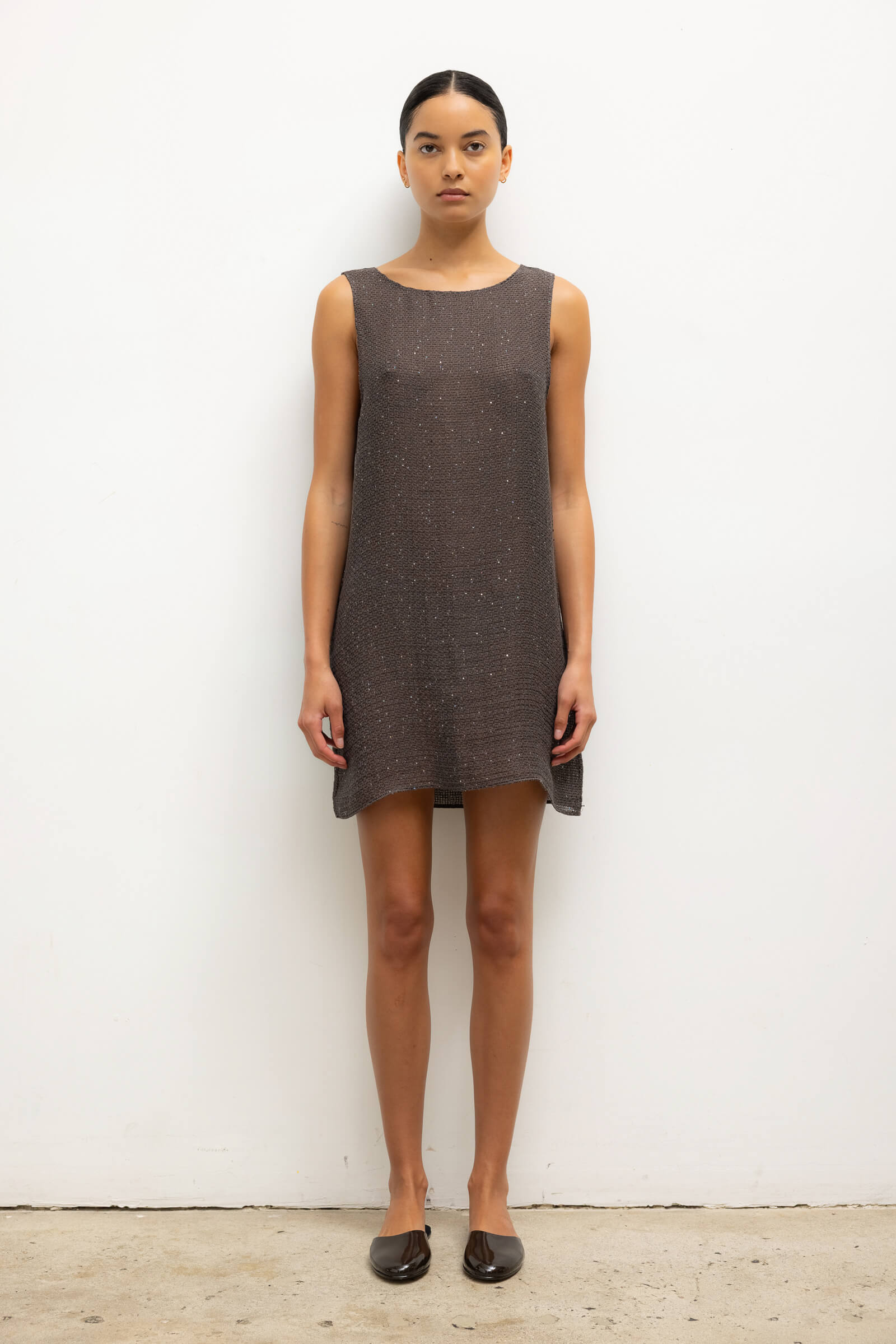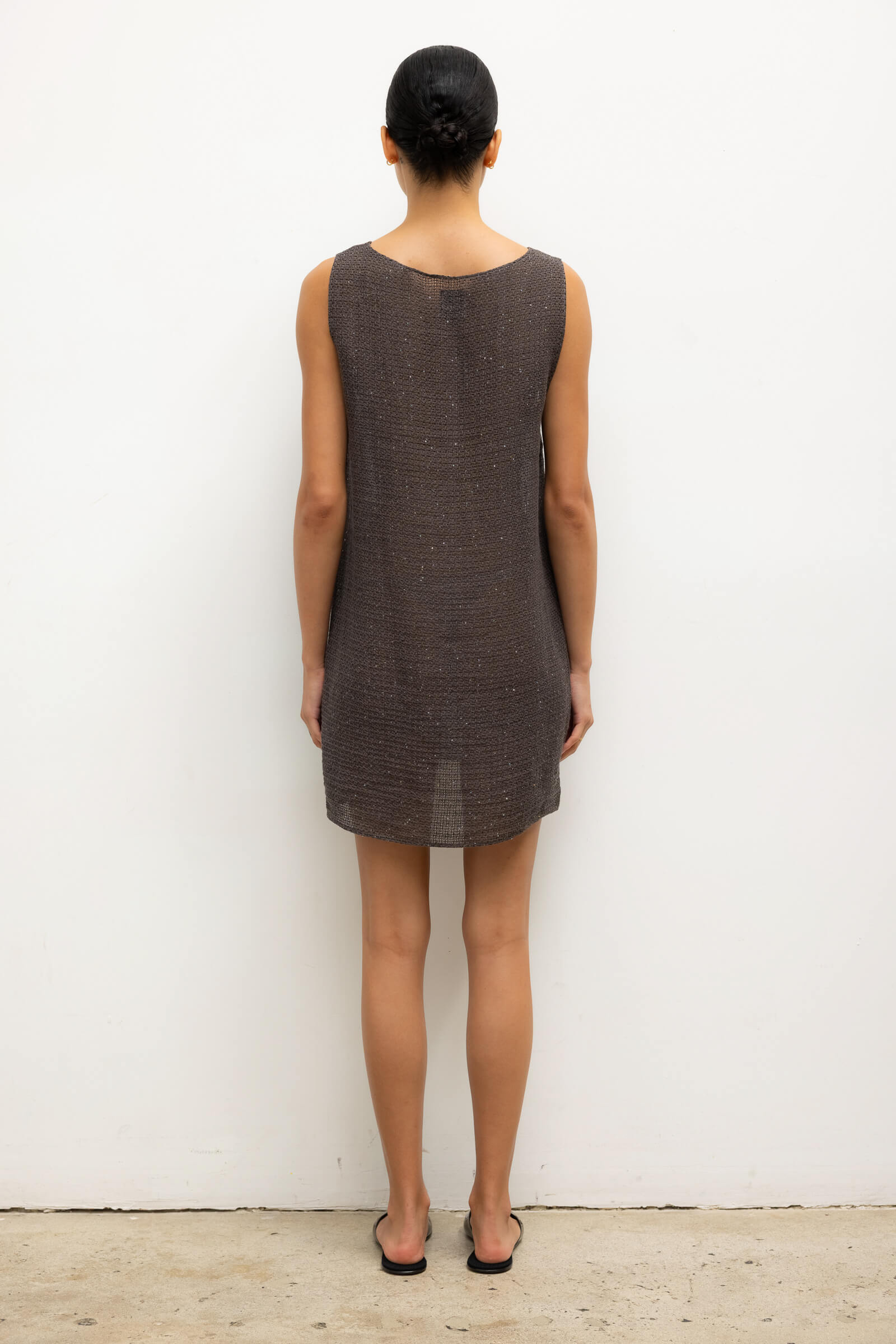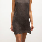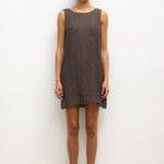 Cut in our subtly sequined Stella Linen, the Stella Sleeveless Mini Dress features a rounded neckline, straight silhouette, and a swinging mini length. Wear it by itself as a dress or as a top with The Stella Wide Leg Pant.