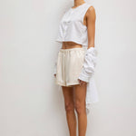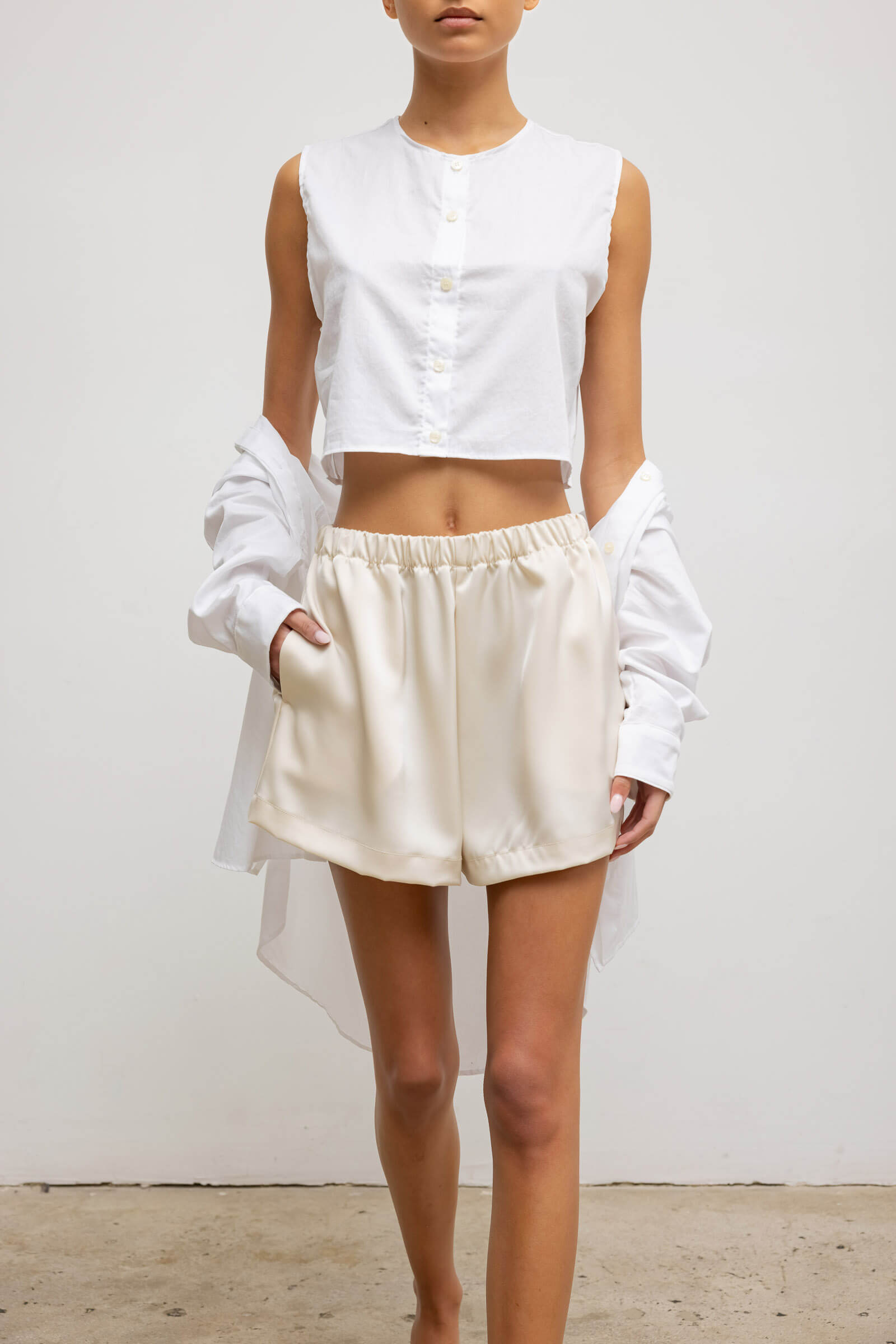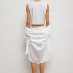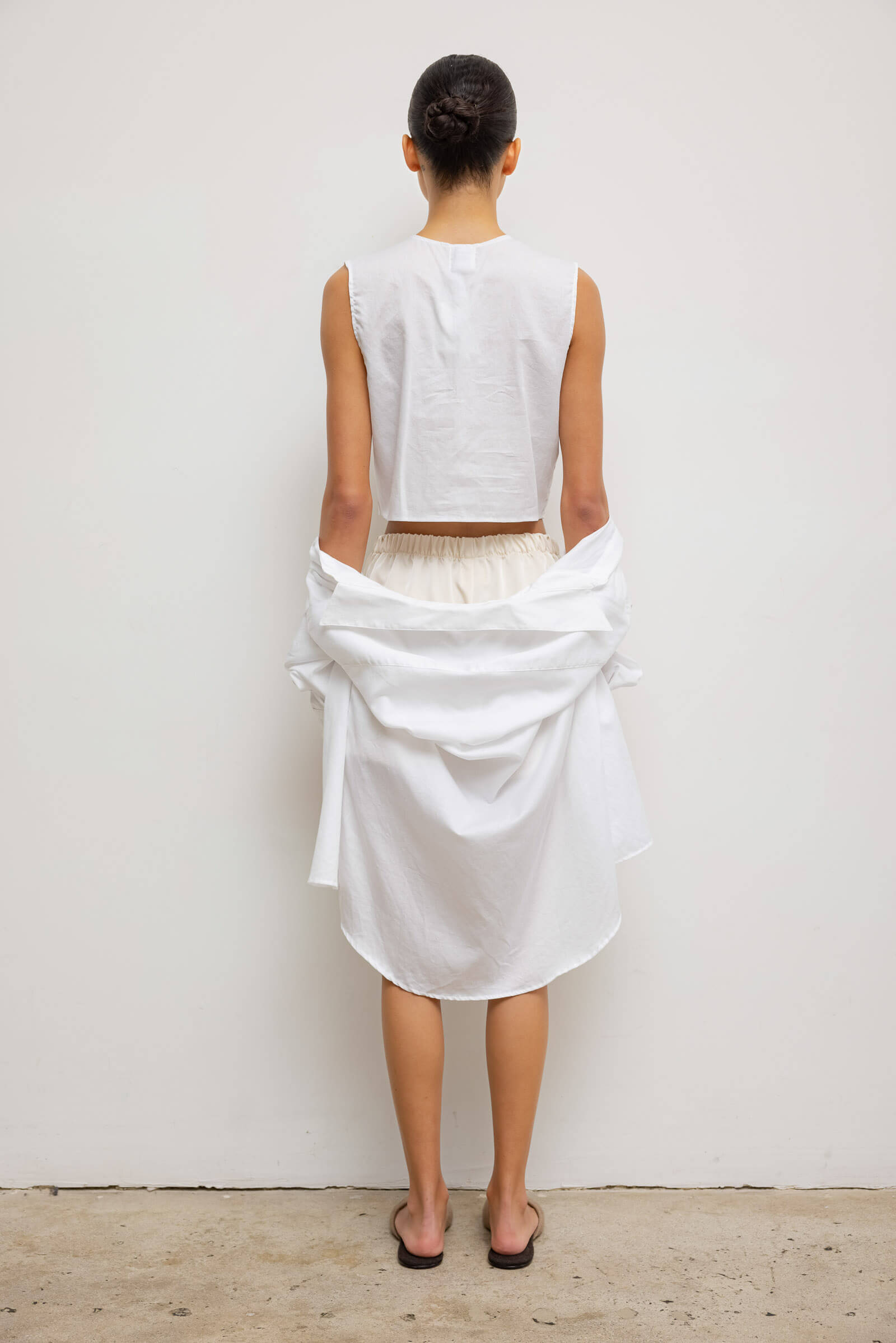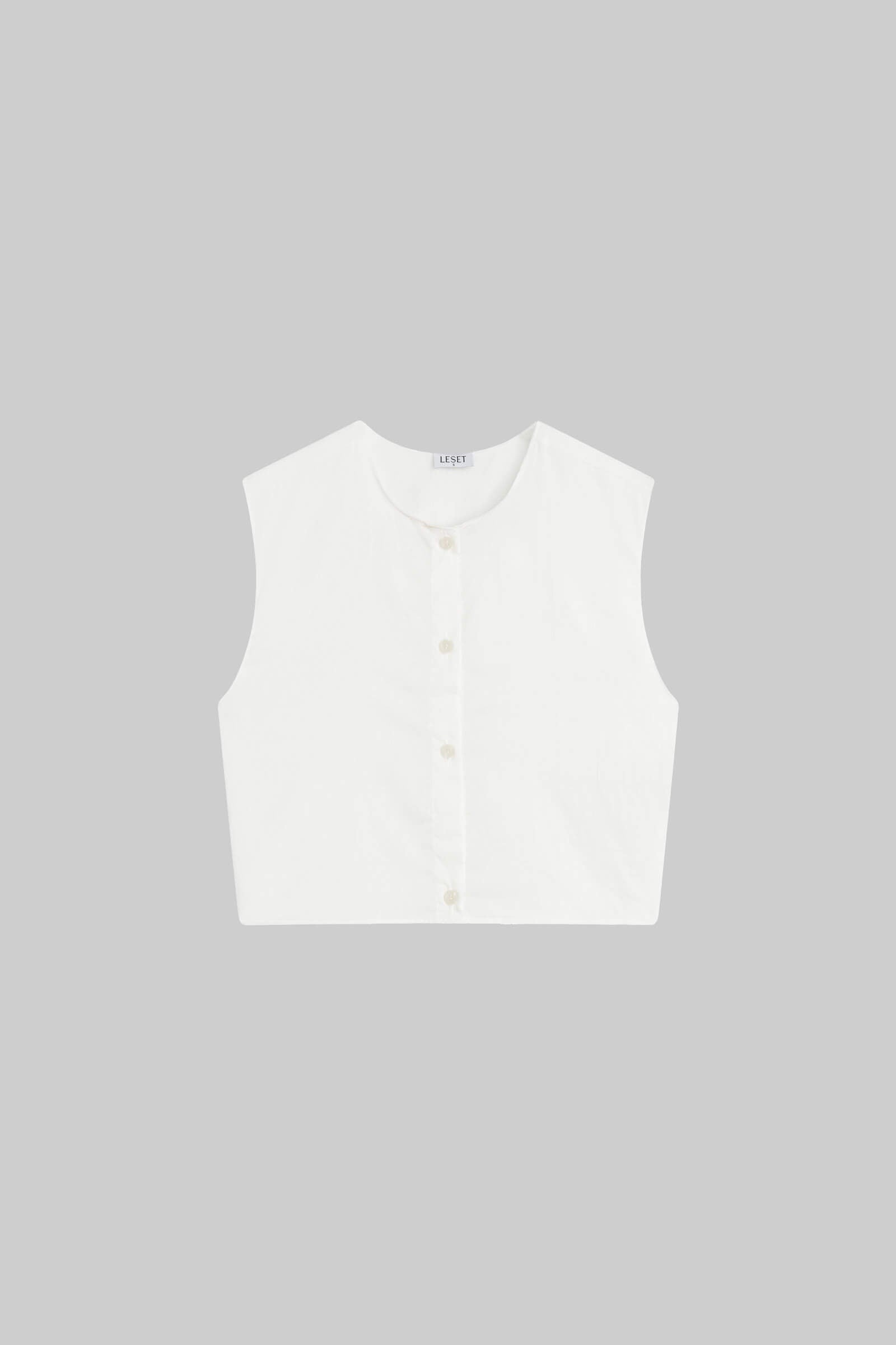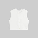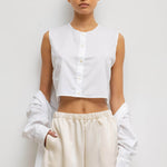 Cut in our crisp Yoko Cotton, The Yoko Crewneck Vest is a truly versatile warm weather piece. Featuring a crew neckline and button front closure, wear it open layered over a bra top or bikini, or buttoned up.