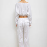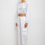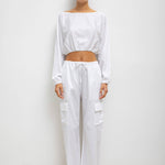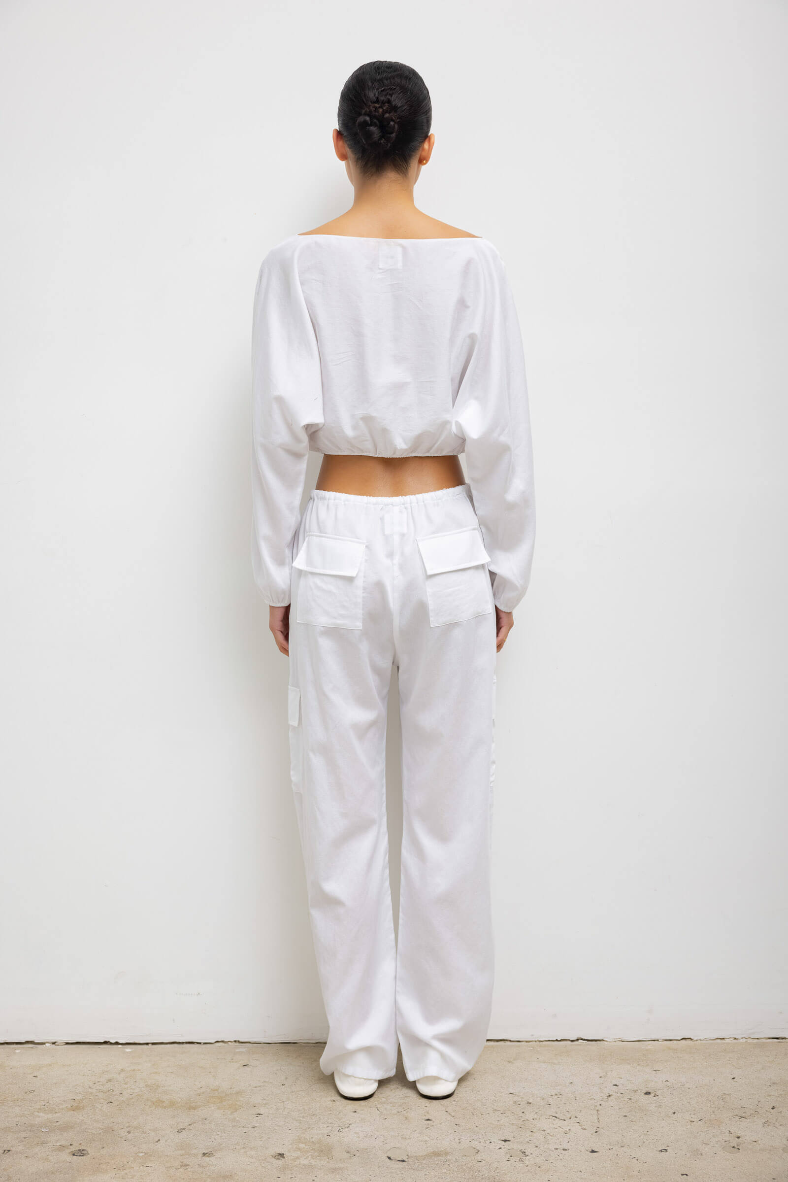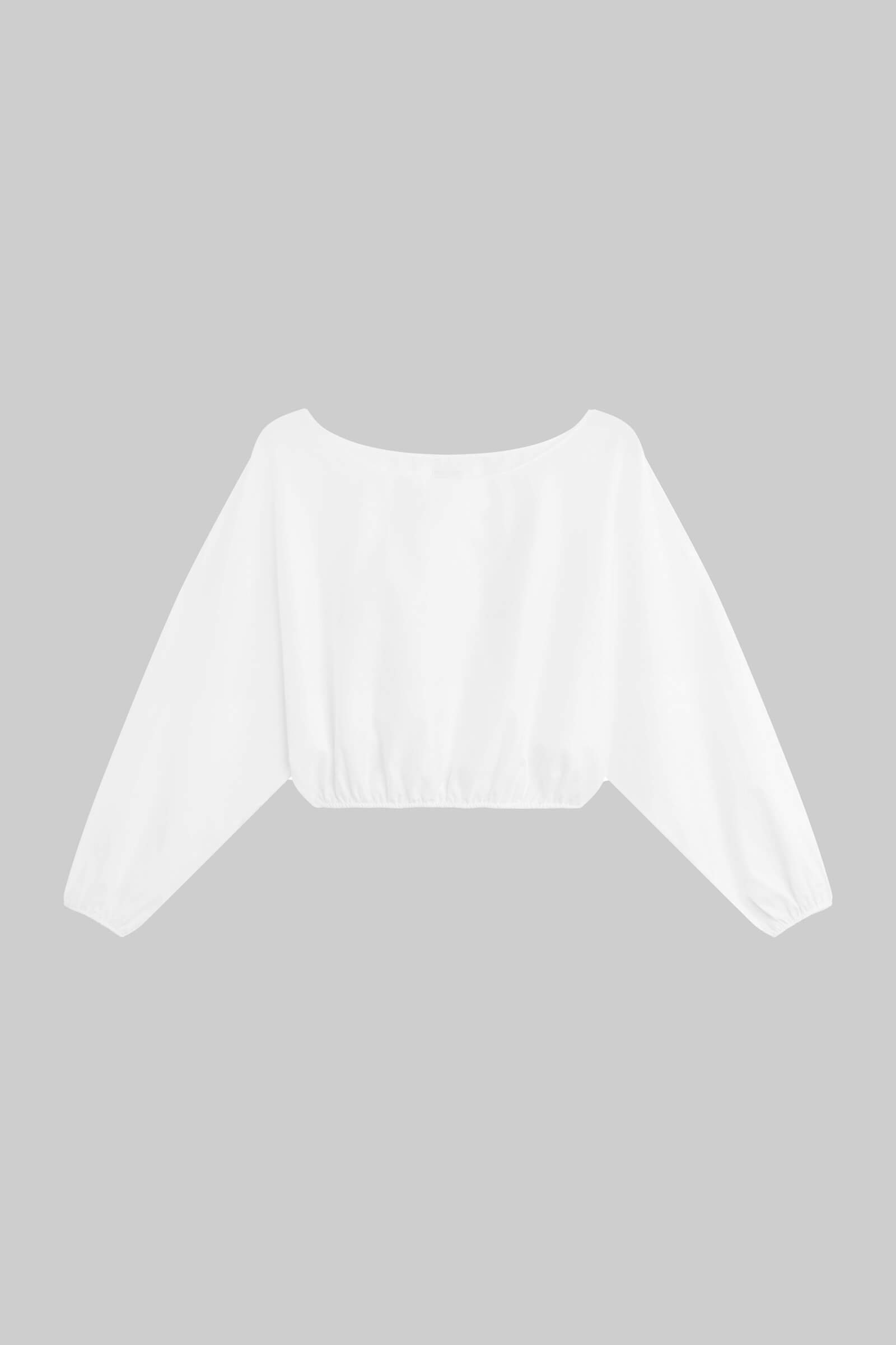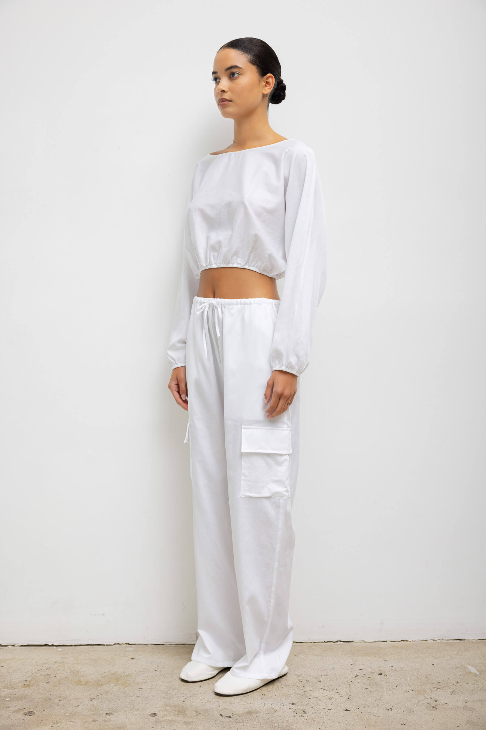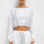Cut in our bed sheet feel Yoko Cotton, The Yoko Long Sleeve Blouson Top features a soft boat neckline, cropped length, elasticated cuffs and hemline. Make it a matching set with The Yoko Drawstring Pant.
