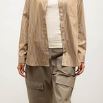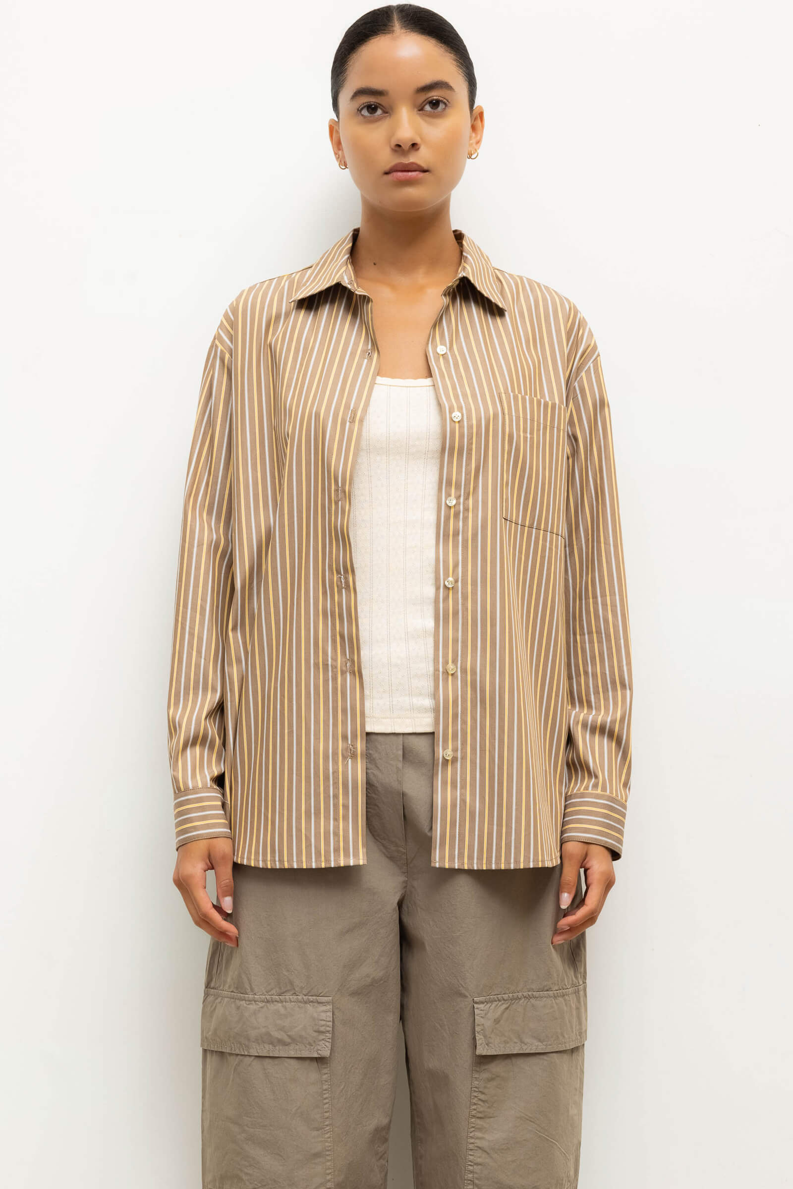 Cut in our striped Yoshi Cotton Twill, The Yoshi Classic Oversized Button Down features a classic pointed collar, curved hem, and a button front closure. Wear this buttoned up with matching Yoshi bottoms — or open over our any of The Classics.