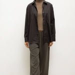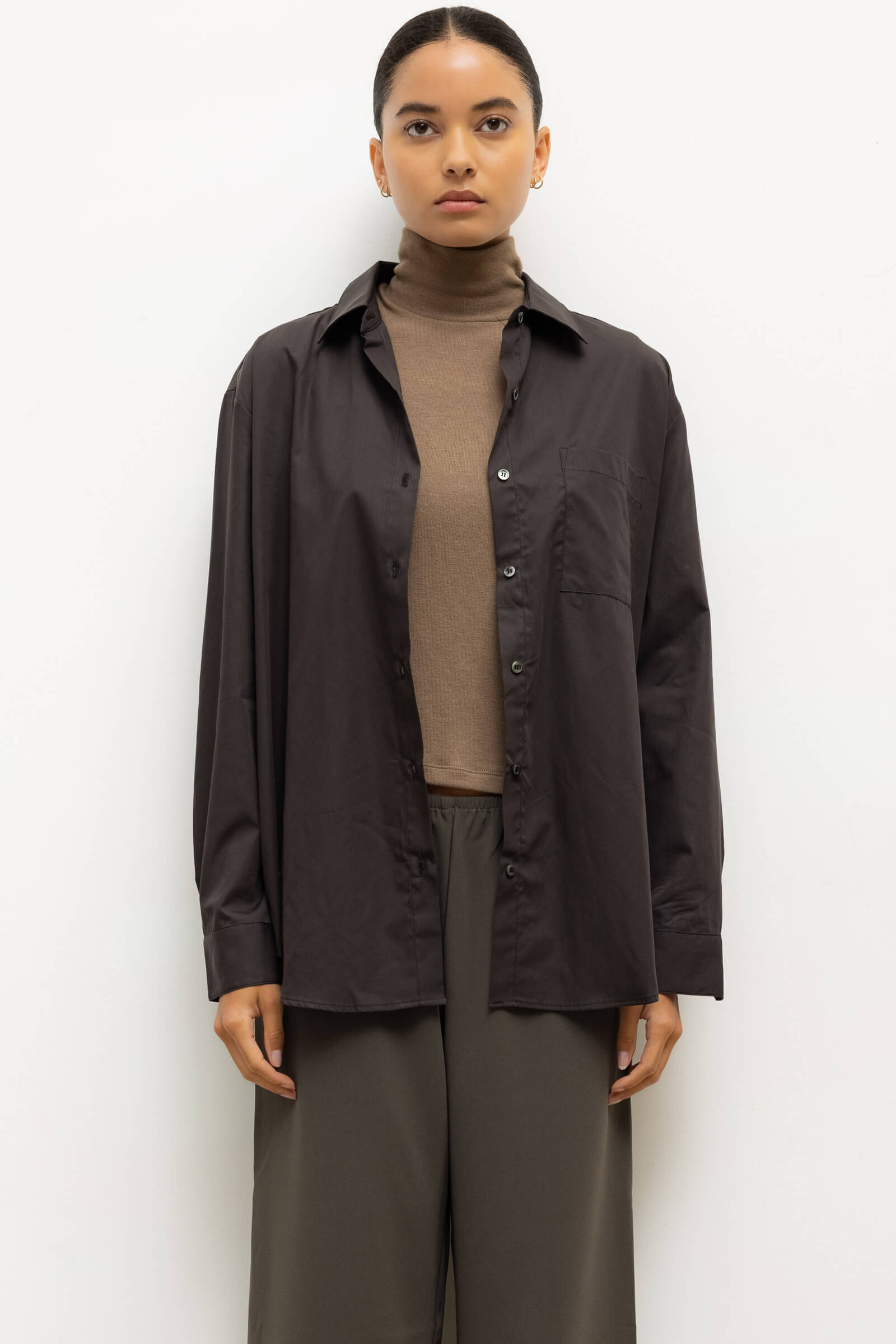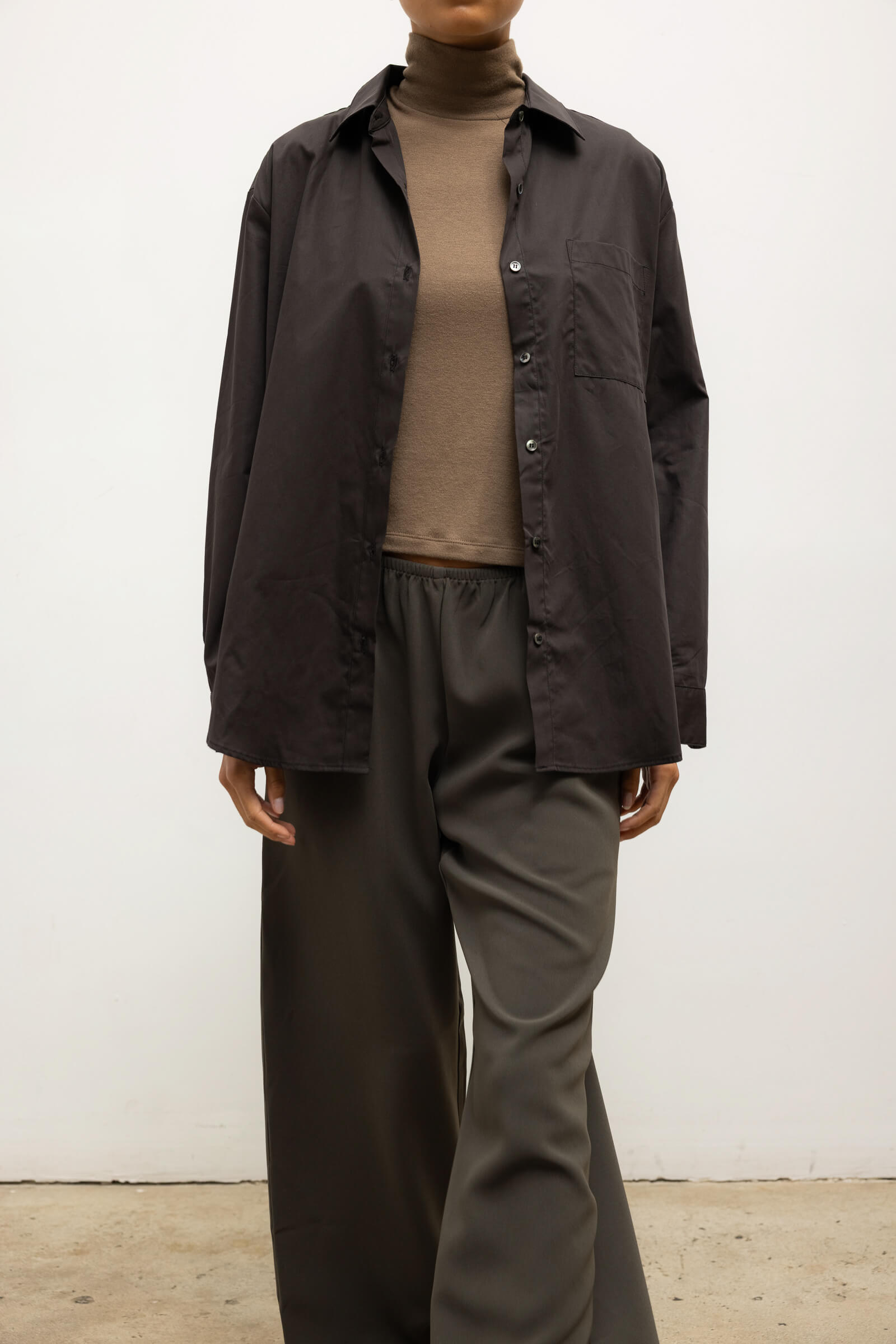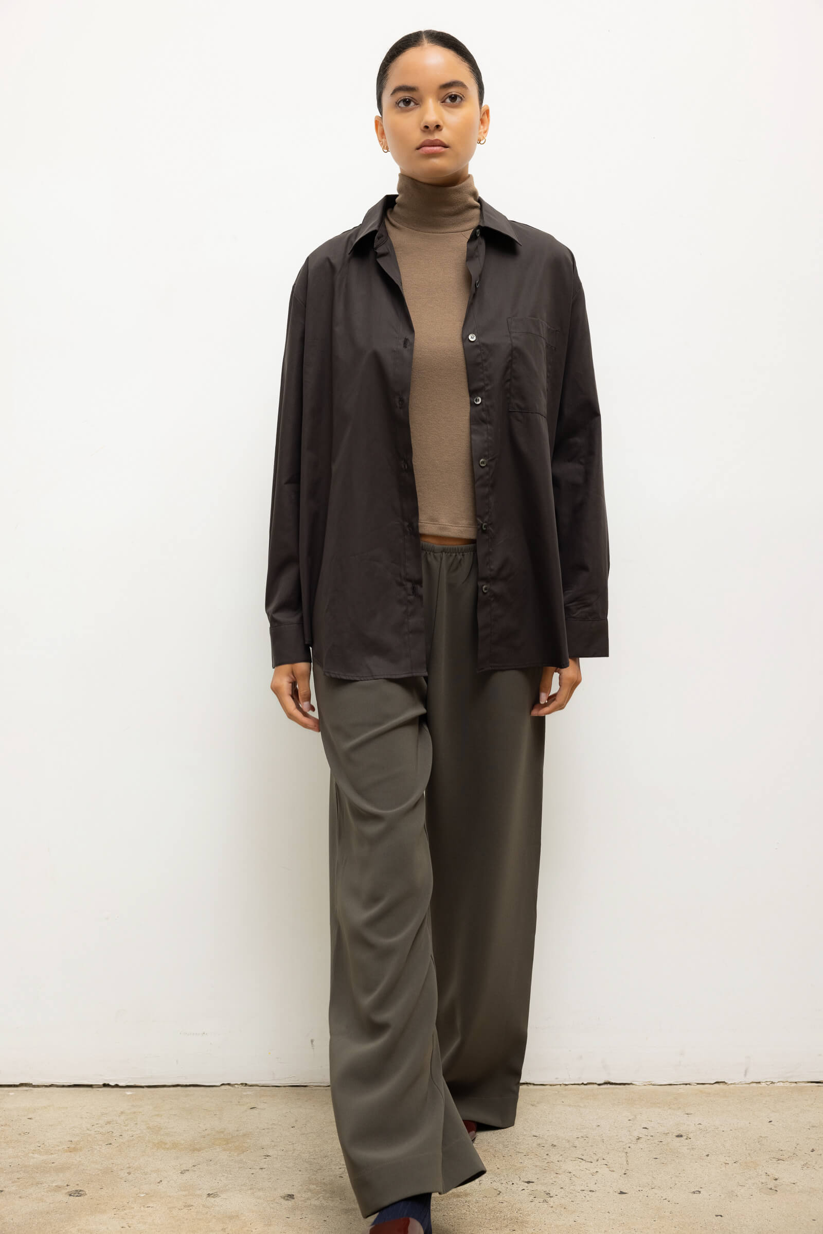 Cut in our Yoshi Cotton Twill, The Yoshi Classic Button Down features a classic pointed collar, curved hem, and a button front closure. Wear this buttoned up with matching Yoshi bottoms — or open over tanks and tees.