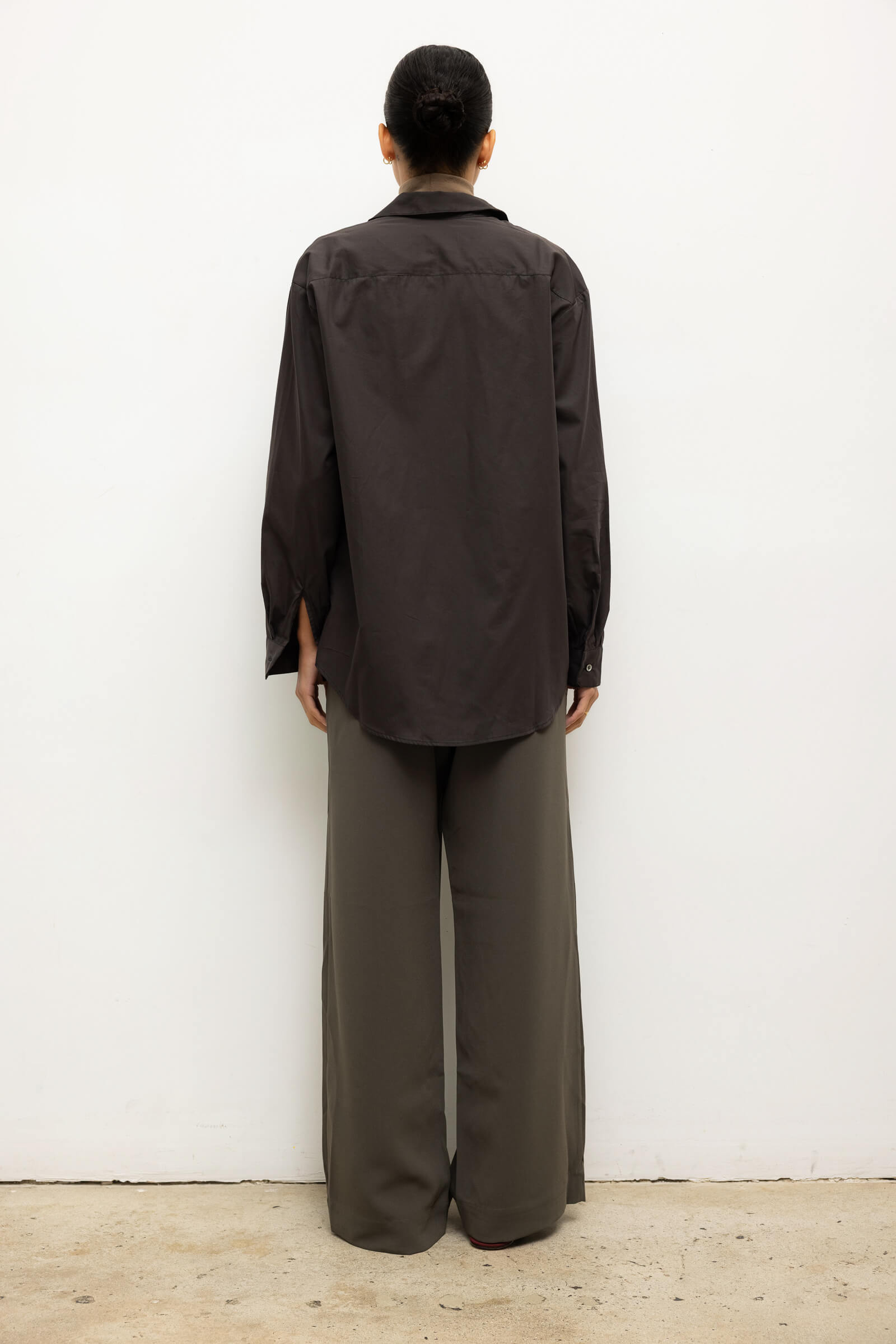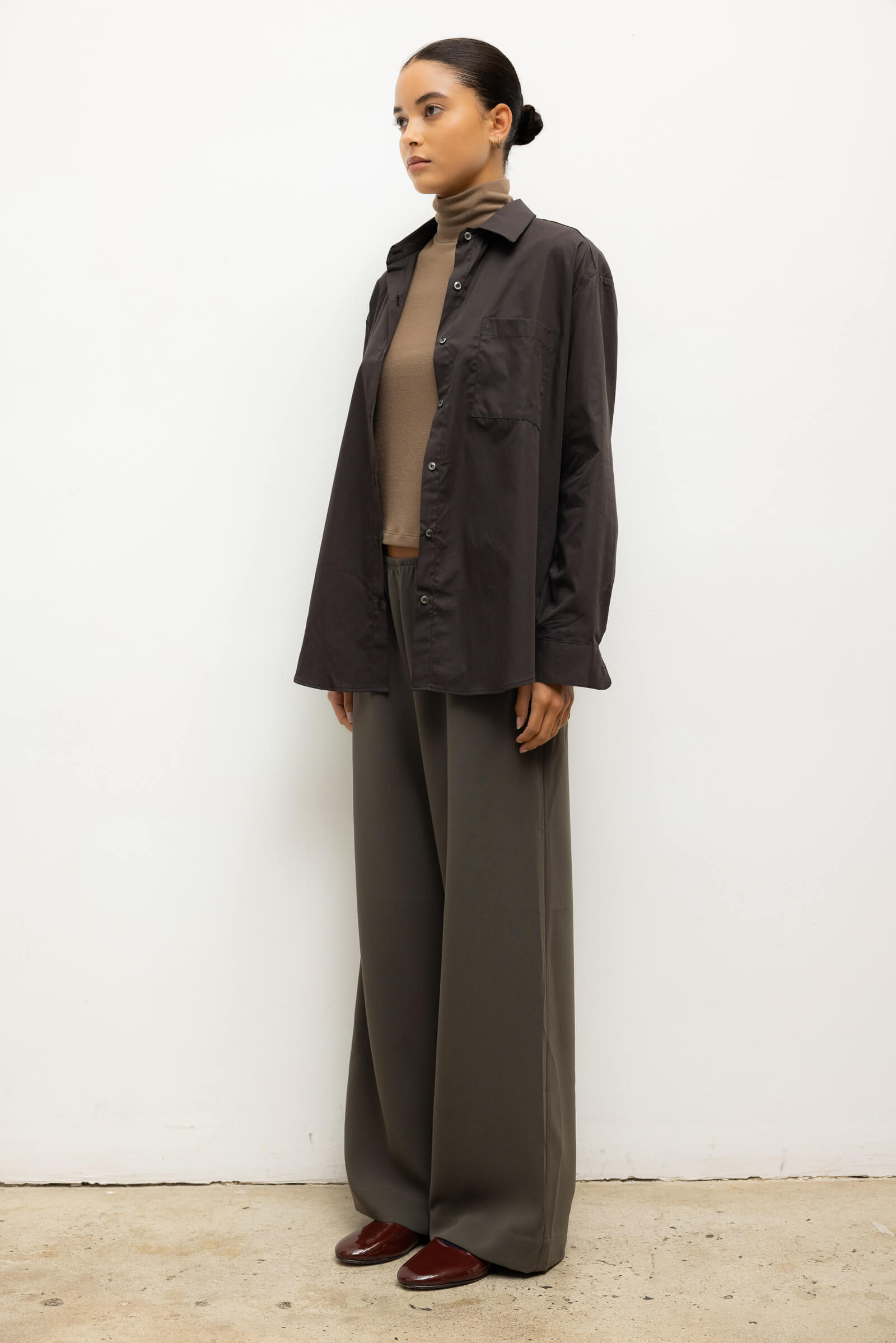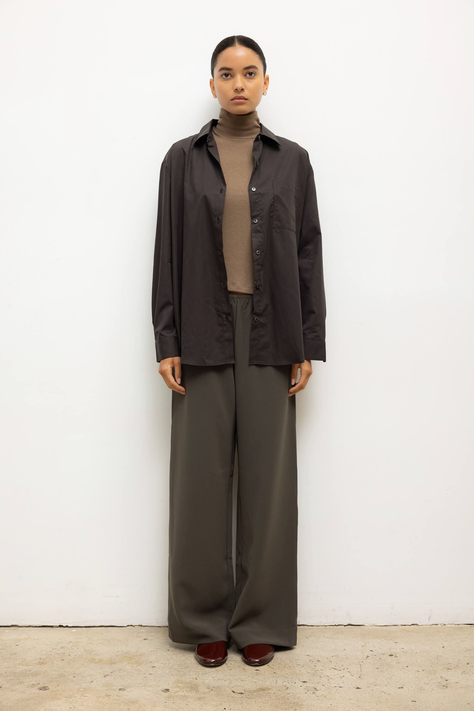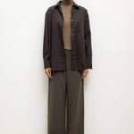 Cut in our Yoshi Cotton Twill, The Yoshi Classic Button Down features a classic pointed collar, curved hem, and a button front closure. Wear this buttoned up with matching Yoshi bottoms — or open over tanks and tees.
